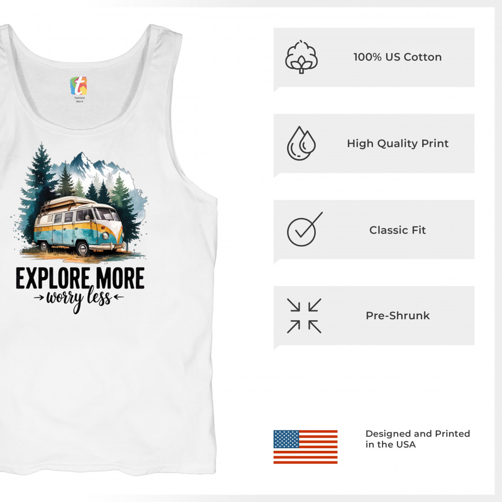 Explore More Worry Less is made for the outdoor soul—celebrating trail lovers, weekend hikers, and national park explorers. Whether you're into off-grid adventures or glamping with family, this design fits your lifestyle. Embrace nature, campfire moments, and wilderness vibes with a look built for your next escape.