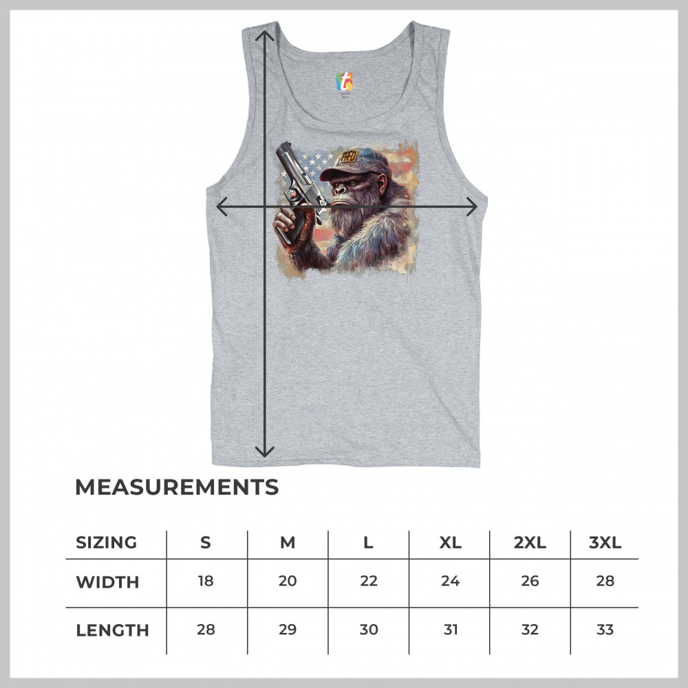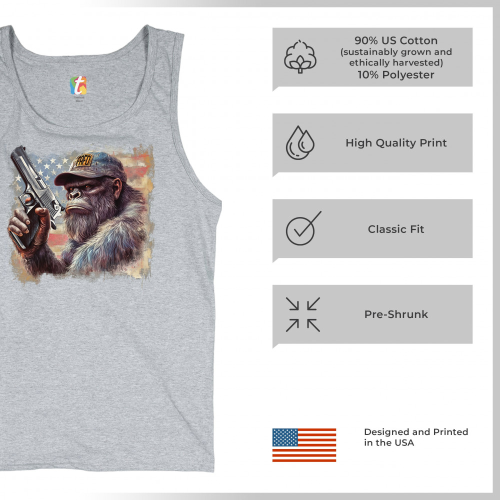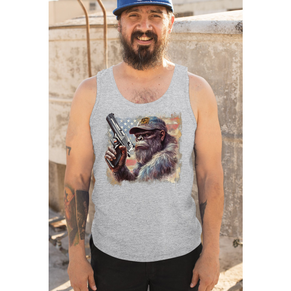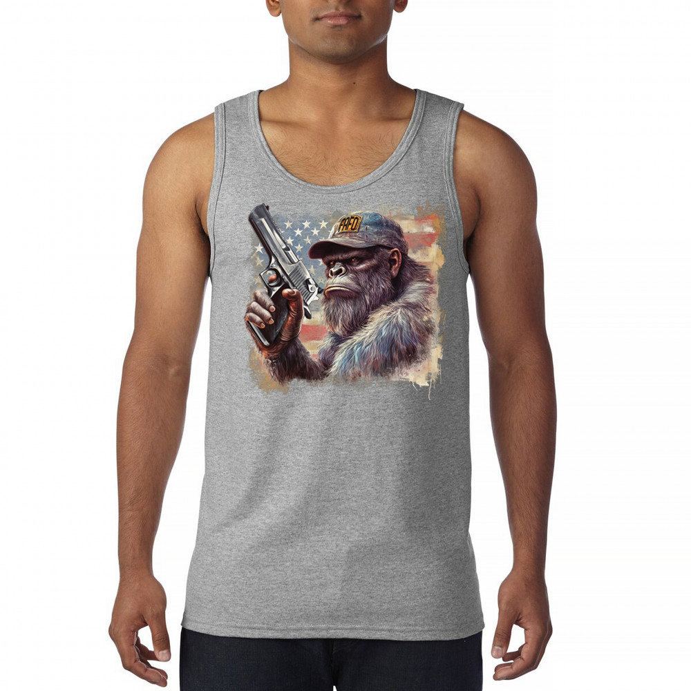 Show your Second Amendment pride with this bold patriotic gorilla design featuring the American flag and a firearm. Perfect for gun rights supporters, veterans, and freedom lovers.