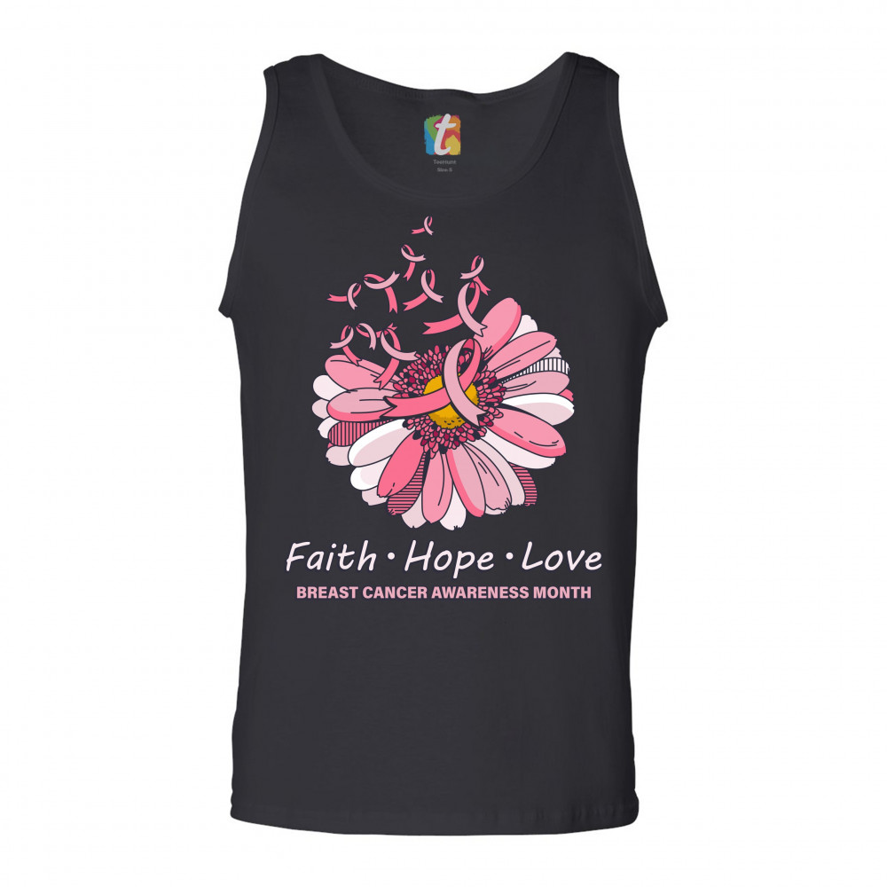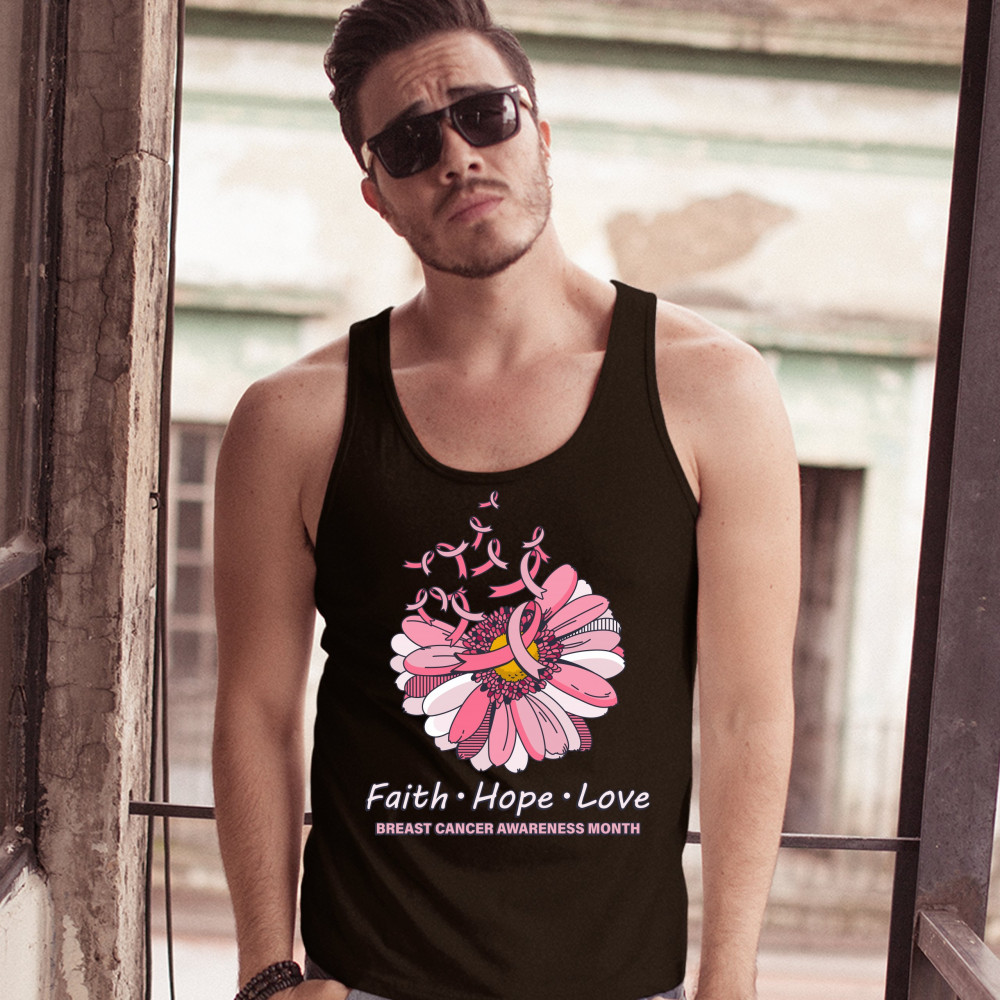 A print featuring a big flower with several petals missing and numerous pink ribbons flying away from it. The print says: "Faith Hope Love" and "Breast Cancer Awareness Month". Wear it to spread awareness abouth the disease and support a person you know w