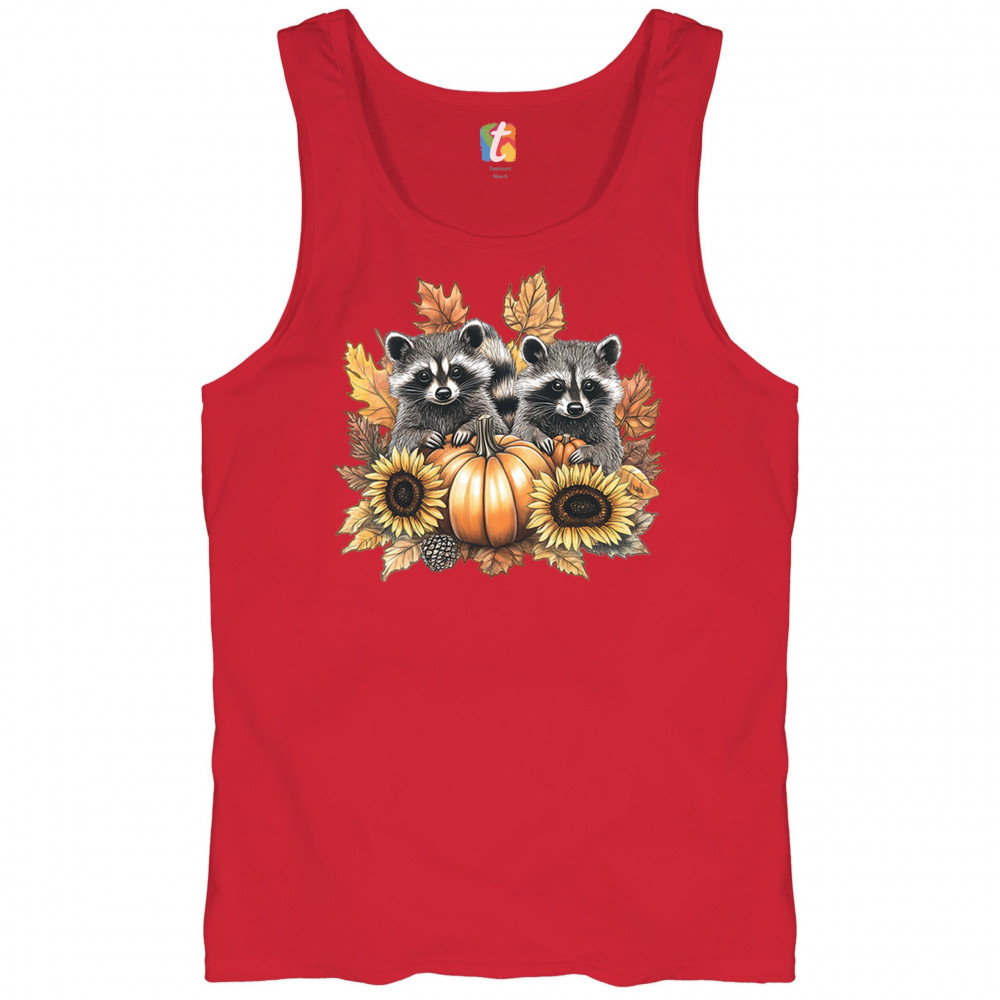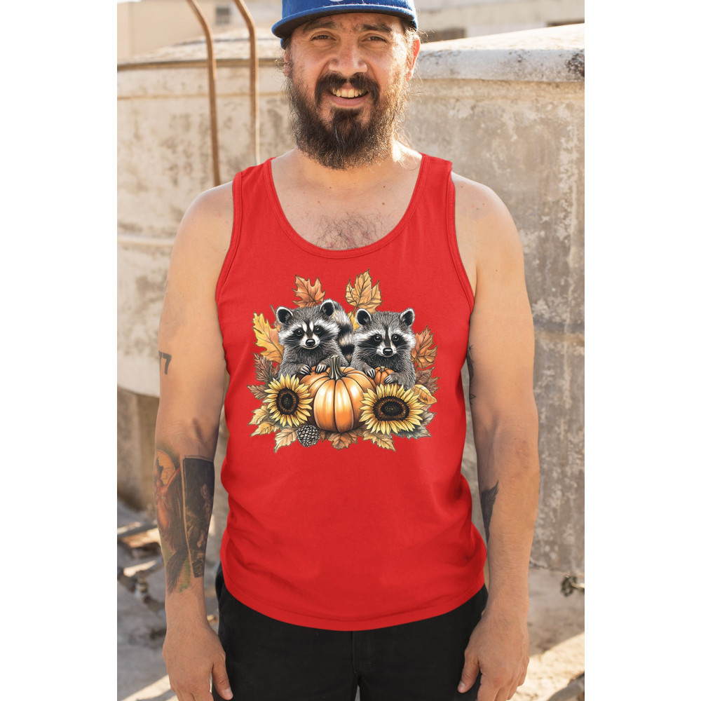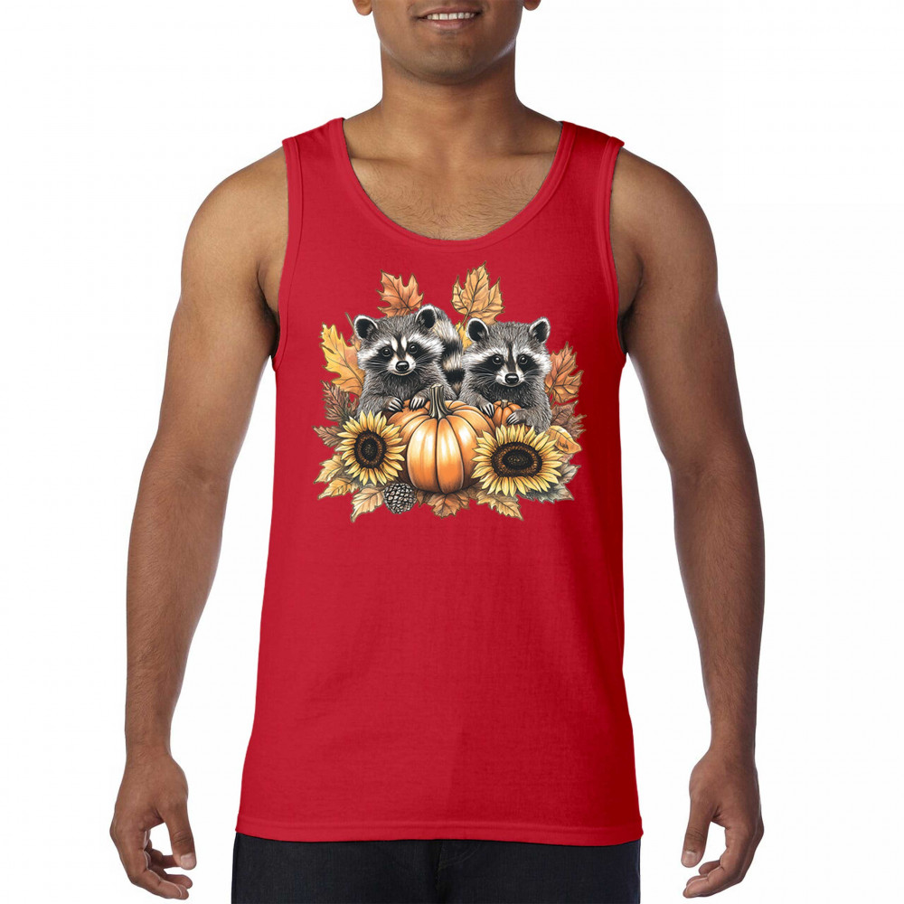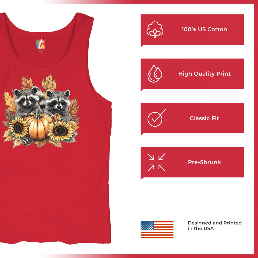 Rustic autumn raccoon design with pumpkins and sunflowers. Perfect for Thanksgiving, pumpkin patch days, farmhouse harvest, and woodland fall fashion.