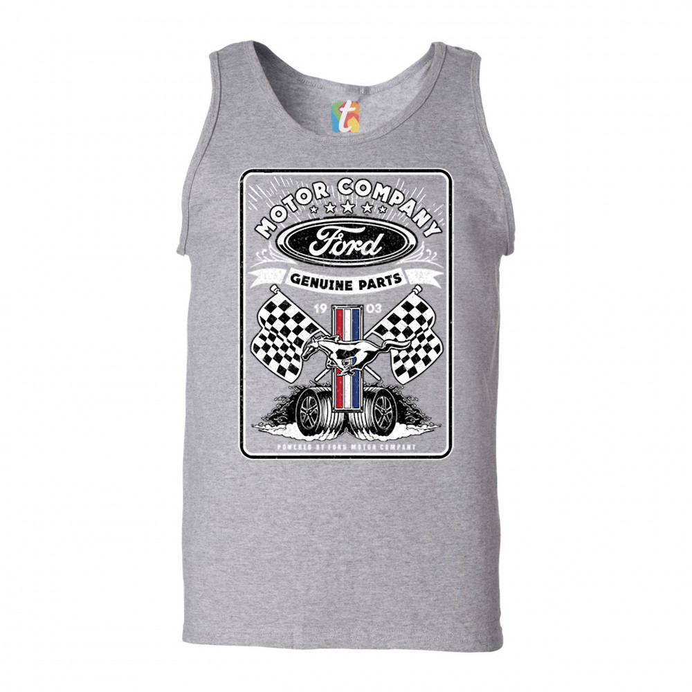 A print featuring Ford logo in the top, Mustang logo in the center, two racing flags and two rolling wheels. The prints says: "Ford Motor Company Genuine Parts 1903" in the top and "Powered by Ford Motor Company" in the bottom. A great choice for anyone w