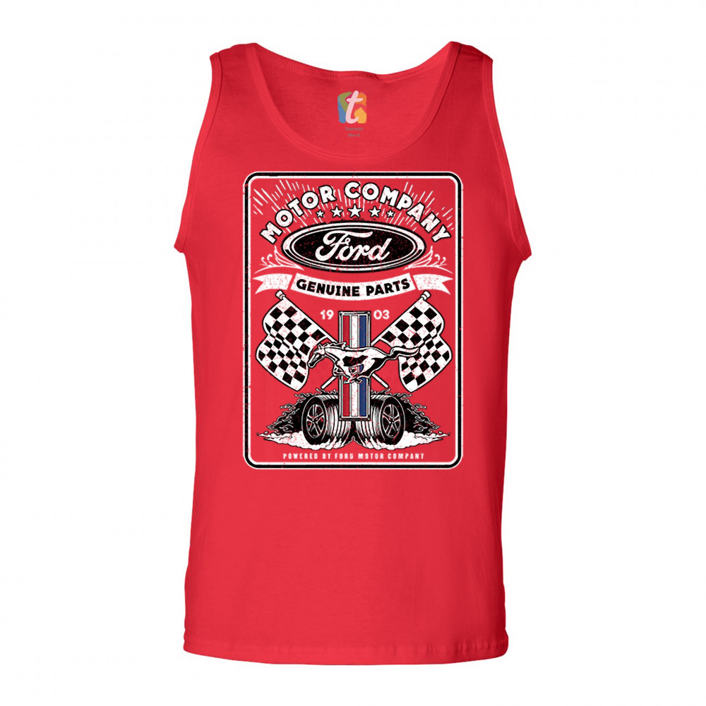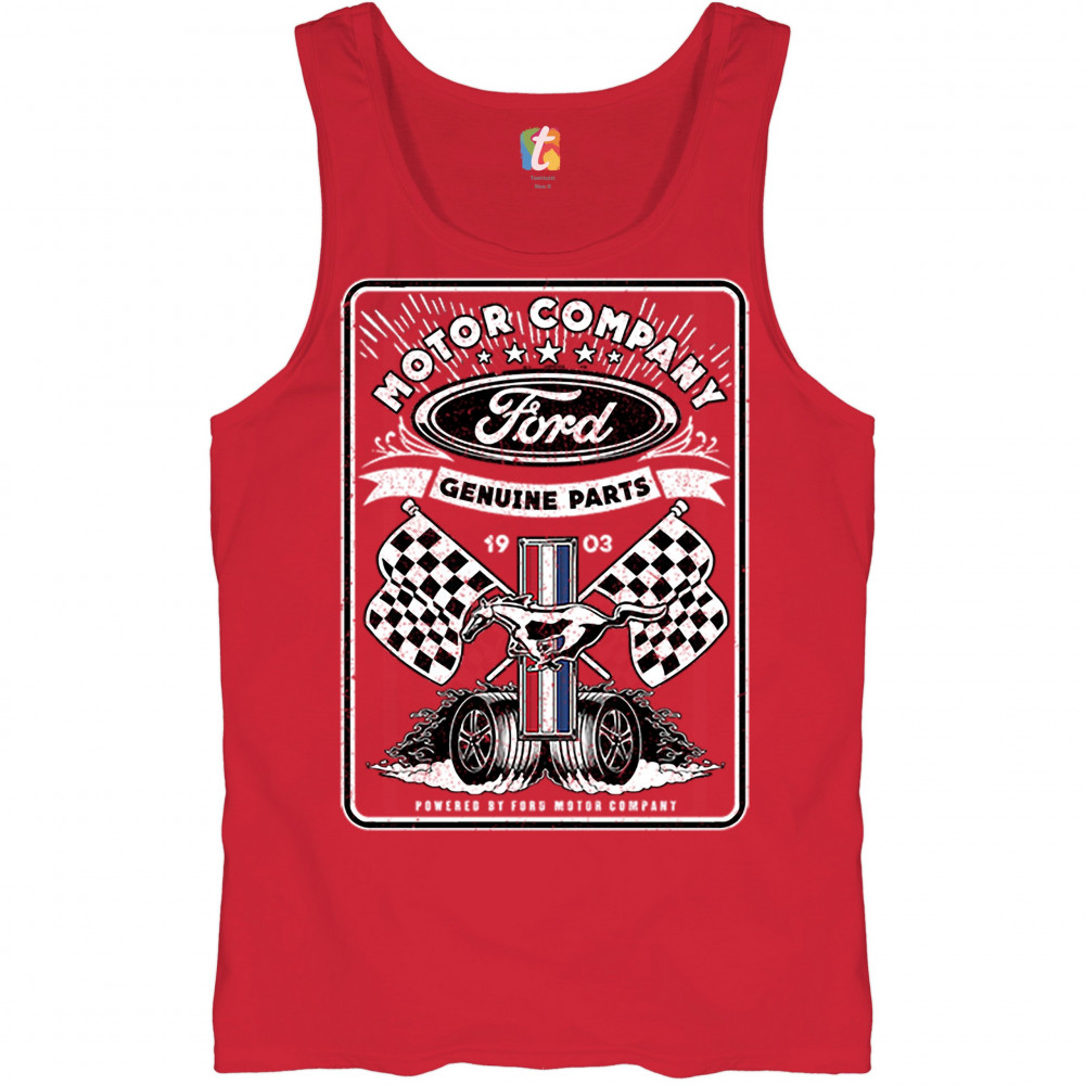 A print featuring Ford logo in the top, Mustang logo in the center, two racing flags and two rolling wheels. The prints says: "Ford Motor Company Genuine Parts 1903" in the top and "Powered by Ford Motor Company" in the bottom. A great choice for anyone w
