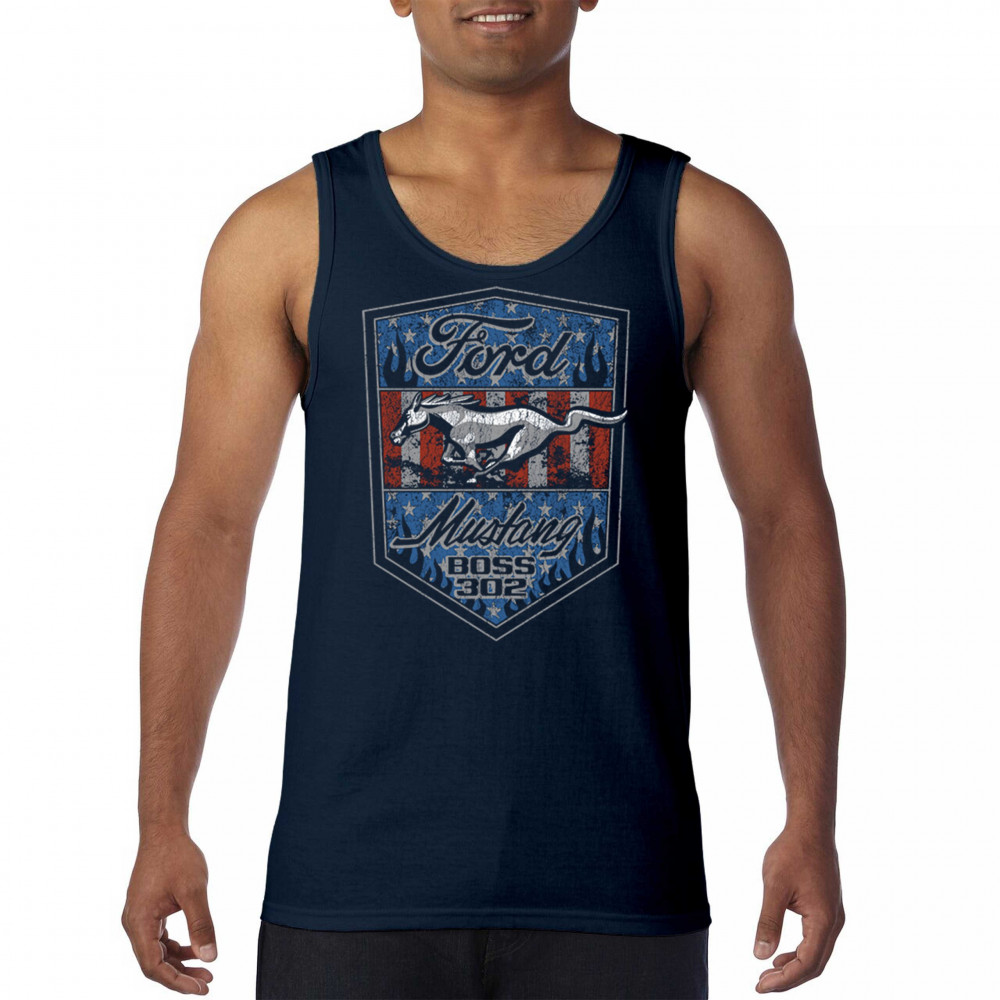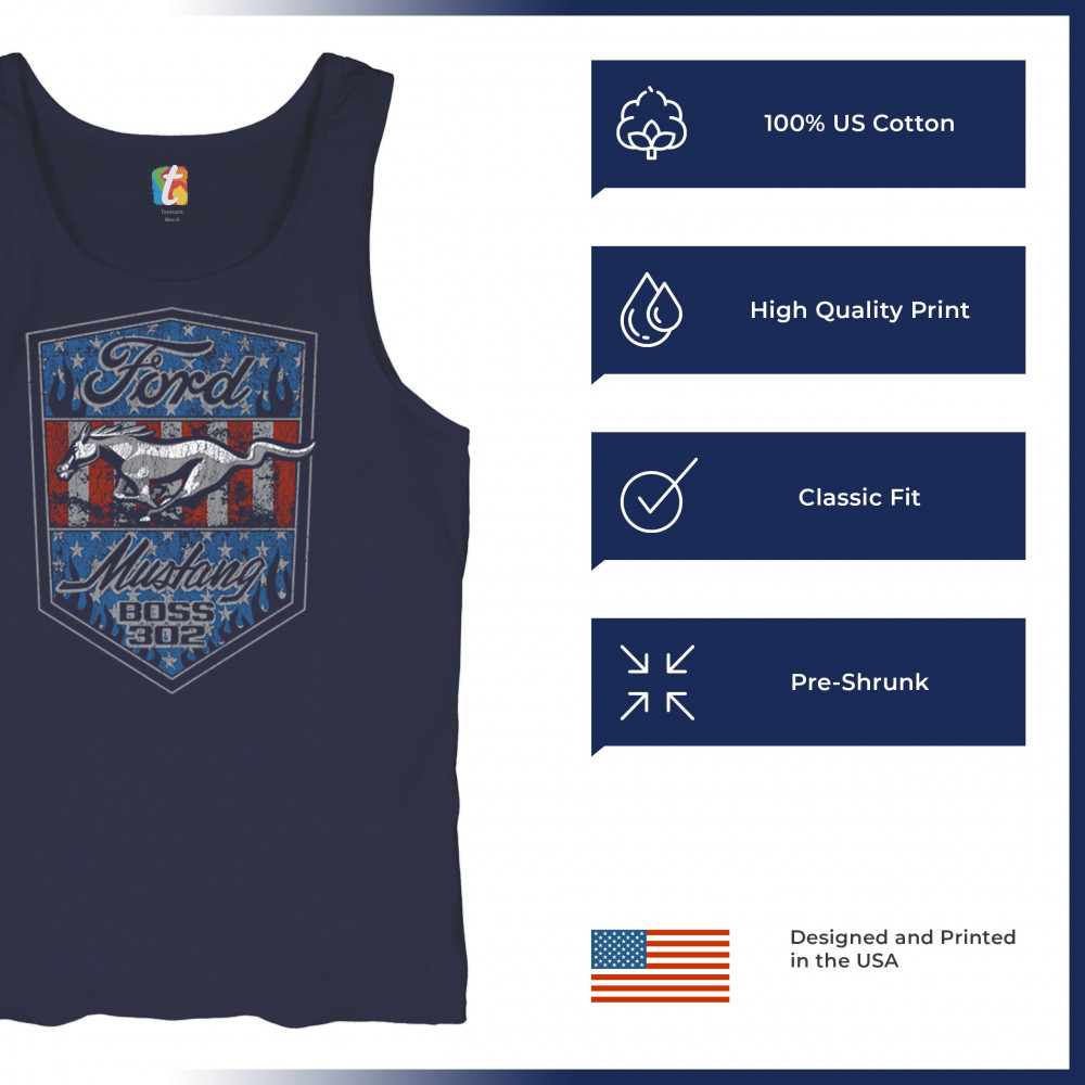Honor the Ford Mustang Boss 302 legacy with this officially licensed patriotic design, featuring bold flames, the iconic running Mustang, and vintage American muscle style.
