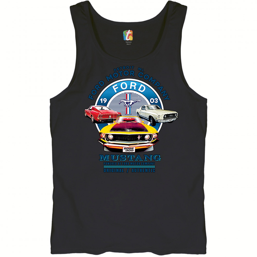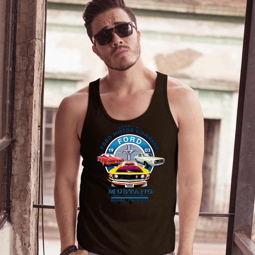 A print featuring three classic Ford Mustangs and their logo in the center. The print says: "Detroit Mi. Ford Motor Company, 1903 Ford Mustang, Powered by Ford Motor Company, Original/Authentic". A great choice for anyone who is a fan of old school Ford M