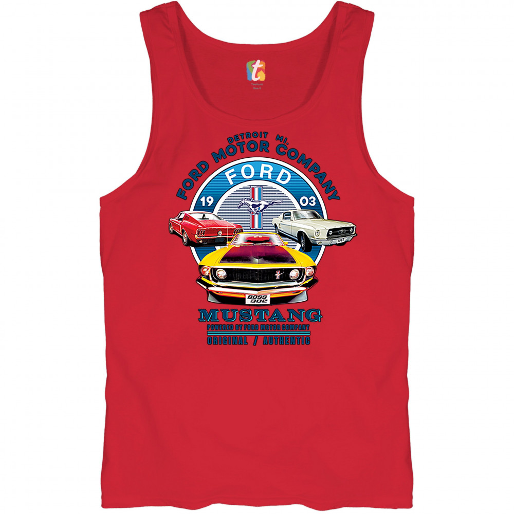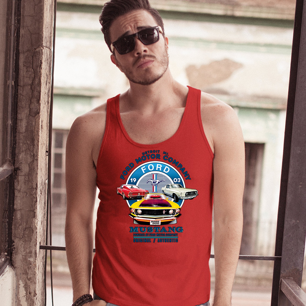 A print featuring three classic Ford Mustangs and their logo in the center. The print says: "Detroit Mi. Ford Motor Company, 1903 Ford Mustang, Powered by Ford Motor Company, Original/Authentic". A great choice for anyone who is a fan of old school Ford M