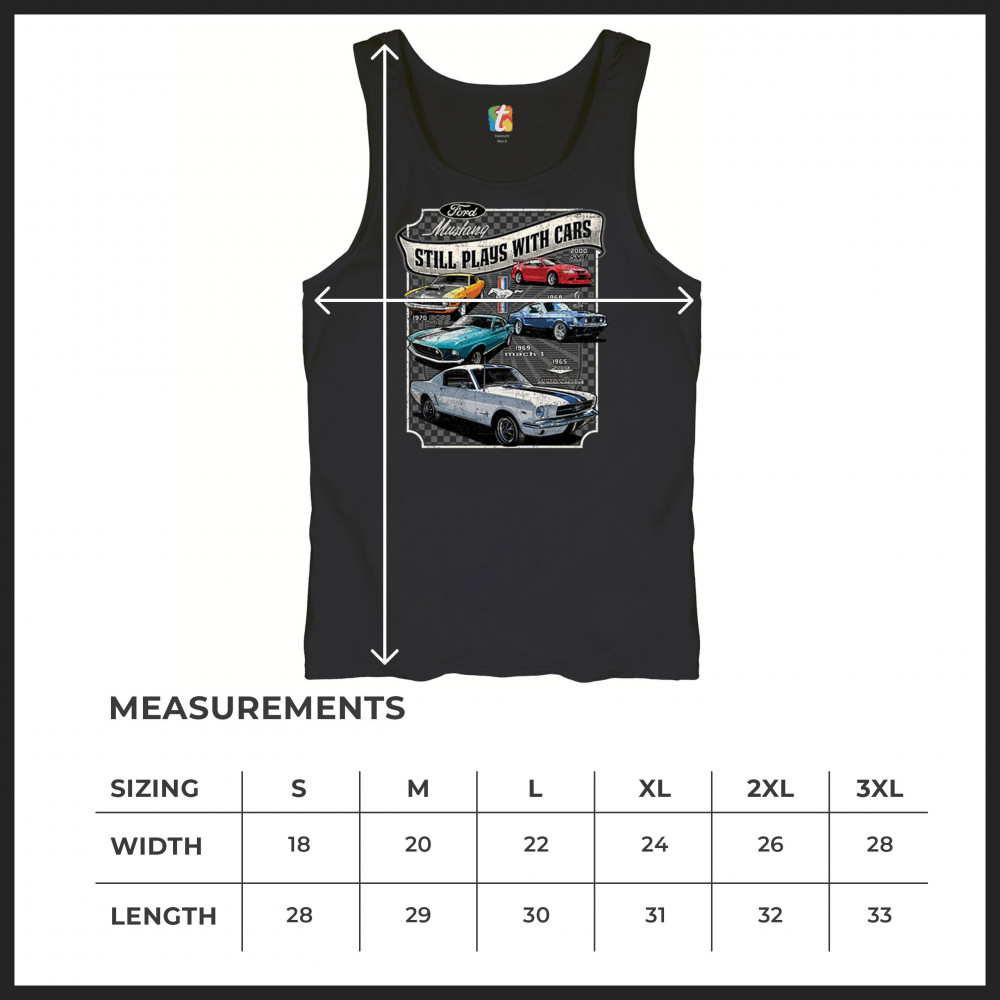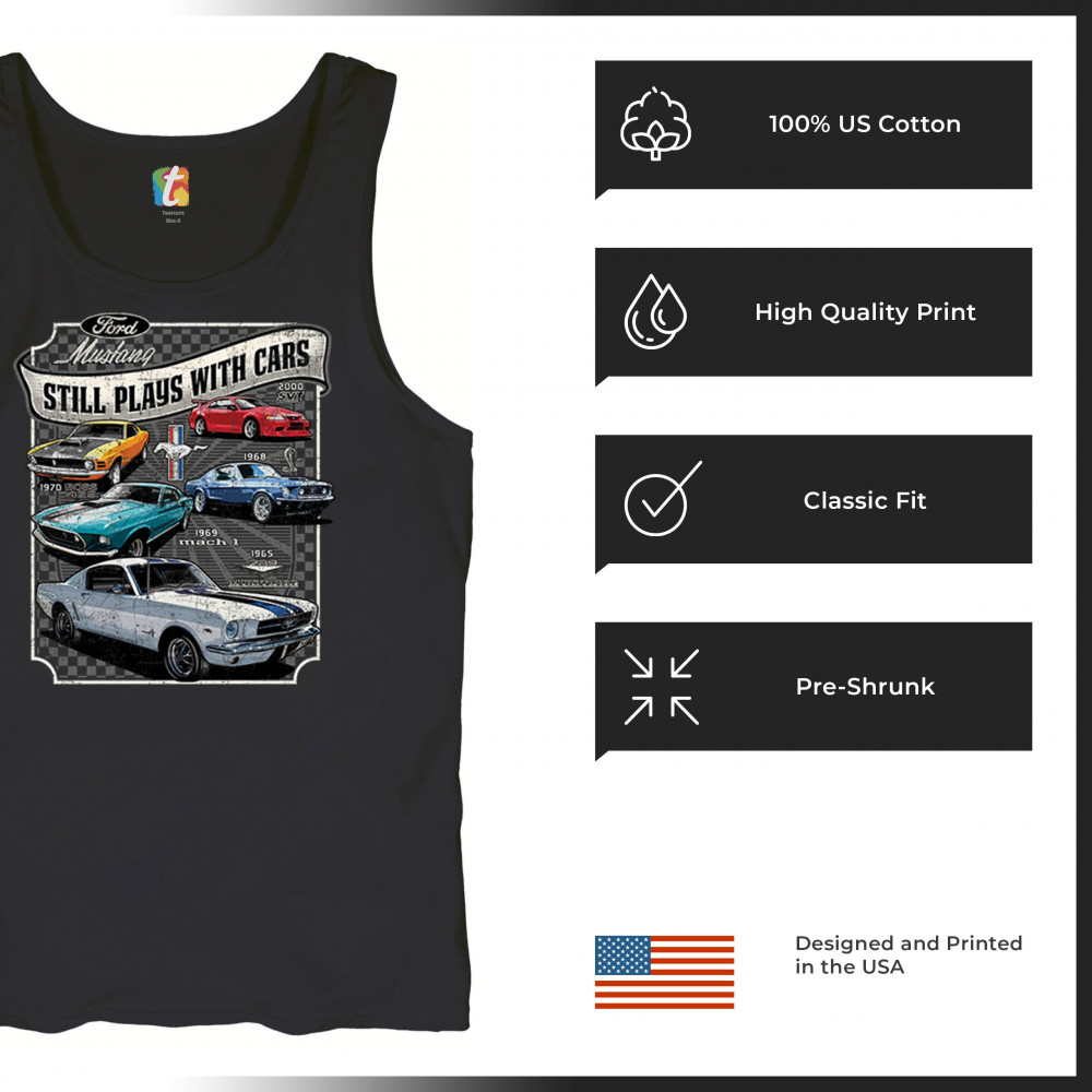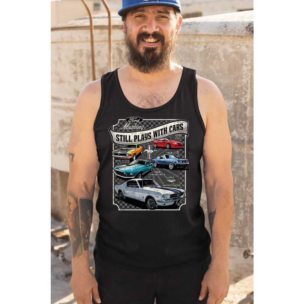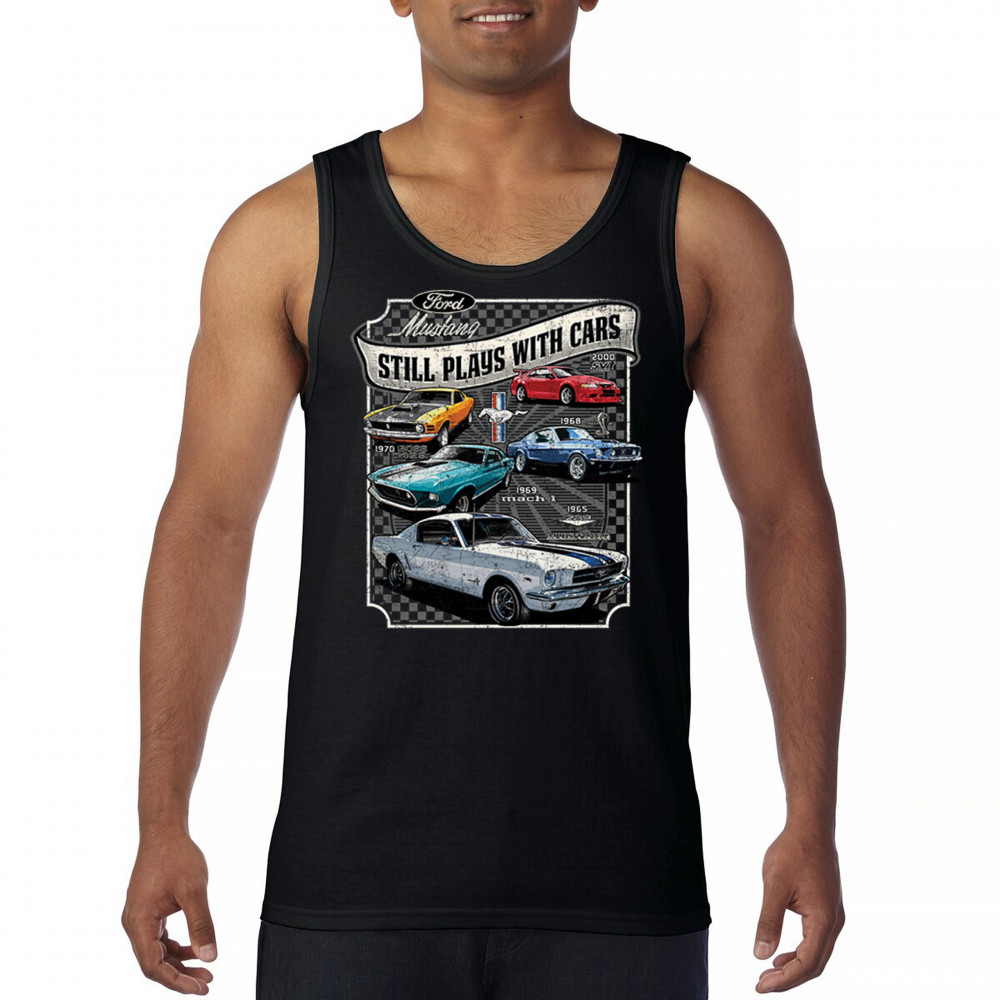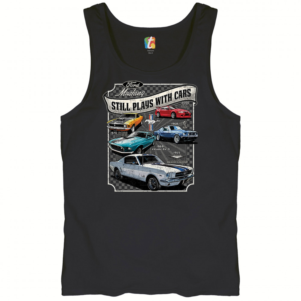 This bold Ford Mustang "Still Plays With Cars" design showcases six classic models from 1965 to 2000, including the 1969 Mach 1, 1970 Boss 302, and 2000 SVT. A dream graphic for muscle car lovers, collectors, and pony car fans. Great for classic auto shows, retro cruises, garage wear, or car clubs.