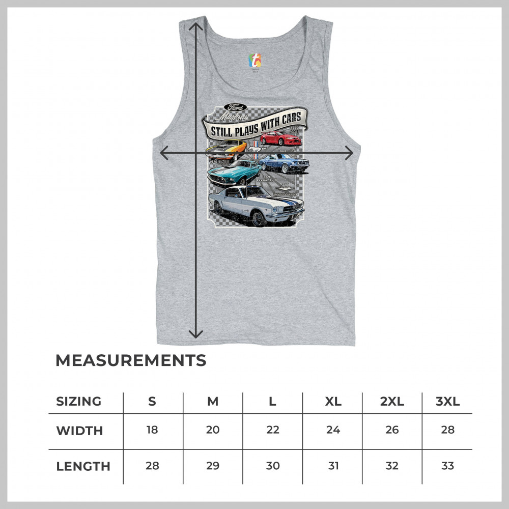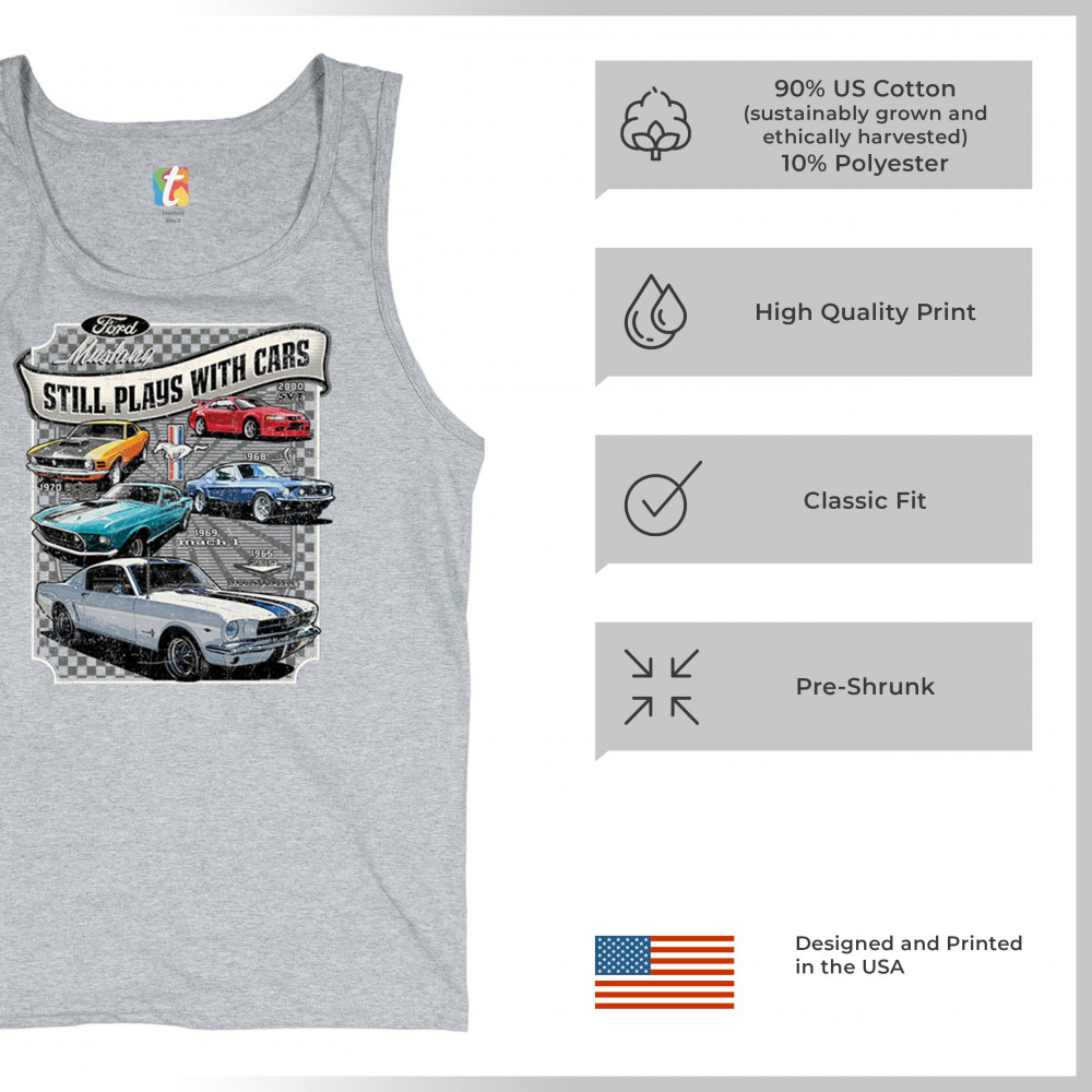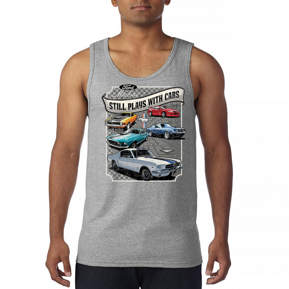 This bold Ford Mustang "Still Plays With Cars" design showcases six classic models from 1965 to 2000, including the 1969 Mach 1, 1970 Boss 302, and 2000 SVT. A dream graphic for muscle car lovers, collectors, and pony car fans. Great for classic auto shows, retro cruises, garage wear, or car clubs.