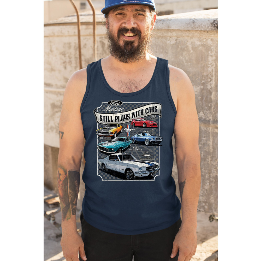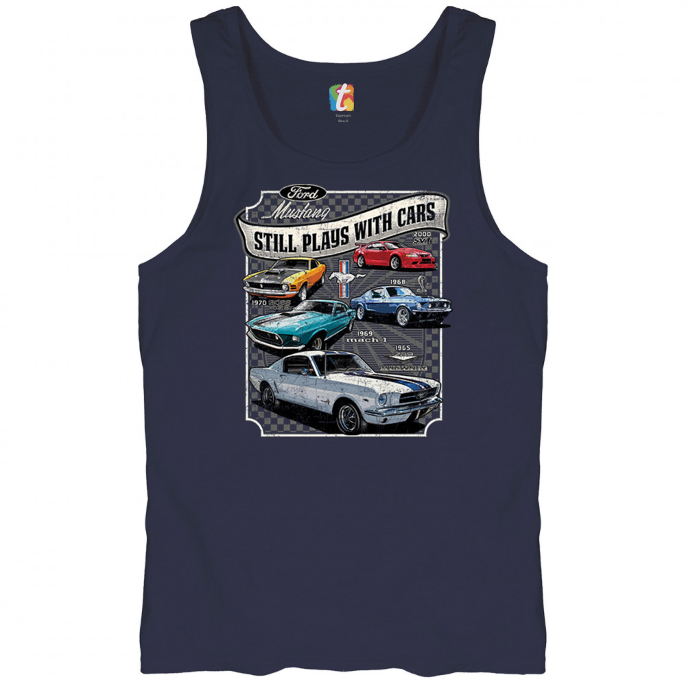 This bold Ford Mustang "Still Plays With Cars" design showcases six classic models from 1965 to 2000, including the 1969 Mach 1, 1970 Boss 302, and 2000 SVT. A dream graphic for muscle car lovers, collectors, and pony car fans. Great for classic auto shows, retro cruises, garage wear, or car clubs.