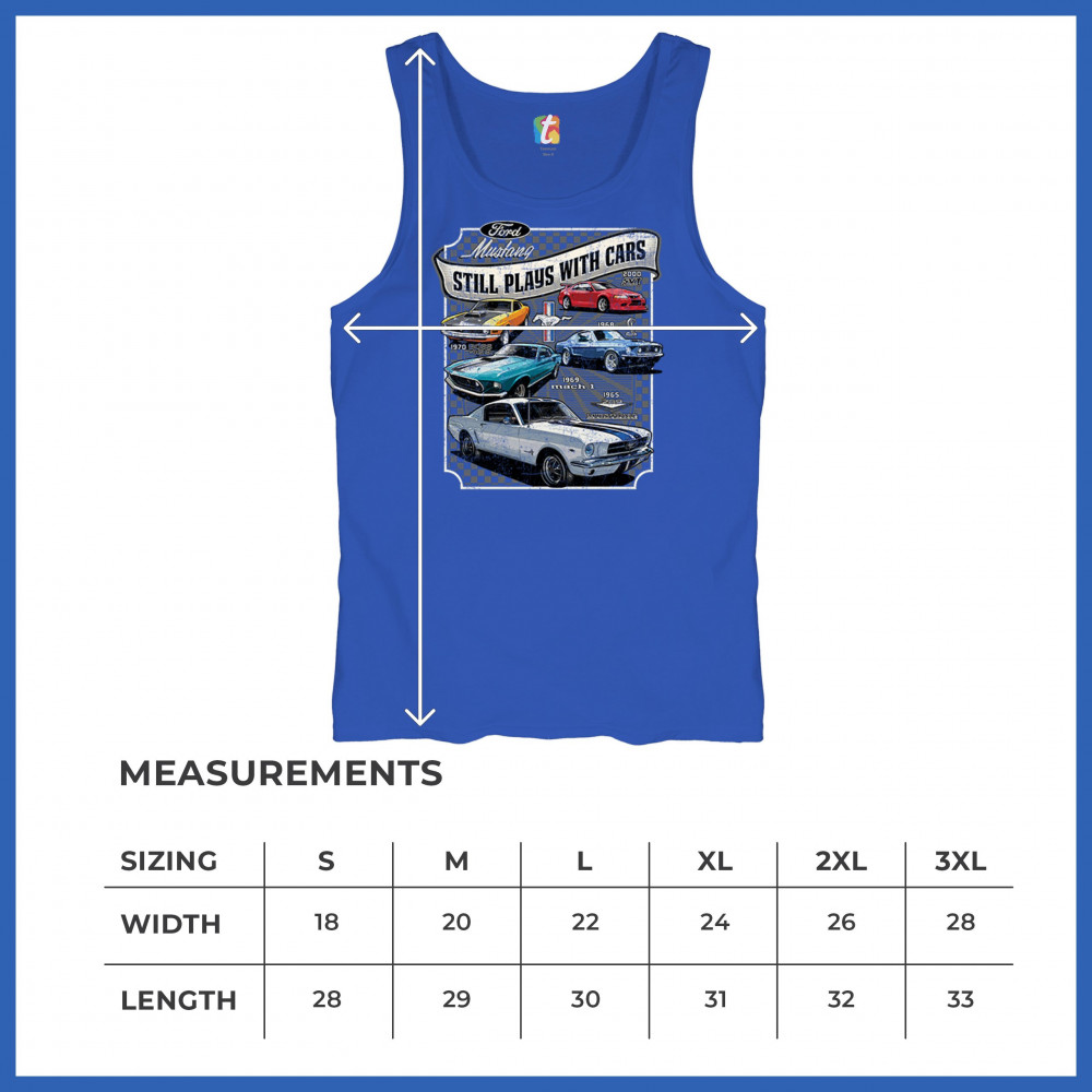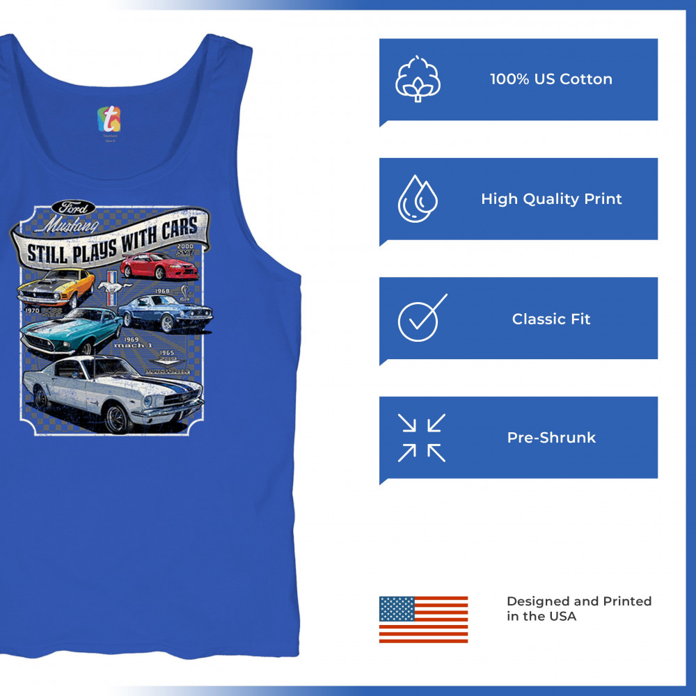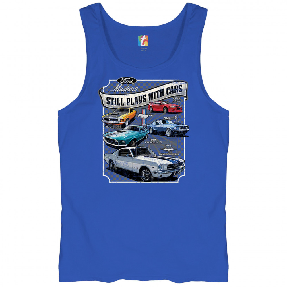 This bold Ford Mustang "Still Plays With Cars" design showcases six classic models from 1965 to 2000, including the 1969 Mach 1, 1970 Boss 302, and 2000 SVT. A dream graphic for muscle car lovers, collectors, and pony car fans. Great for classic auto shows, retro cruises, garage wear, or car clubs.