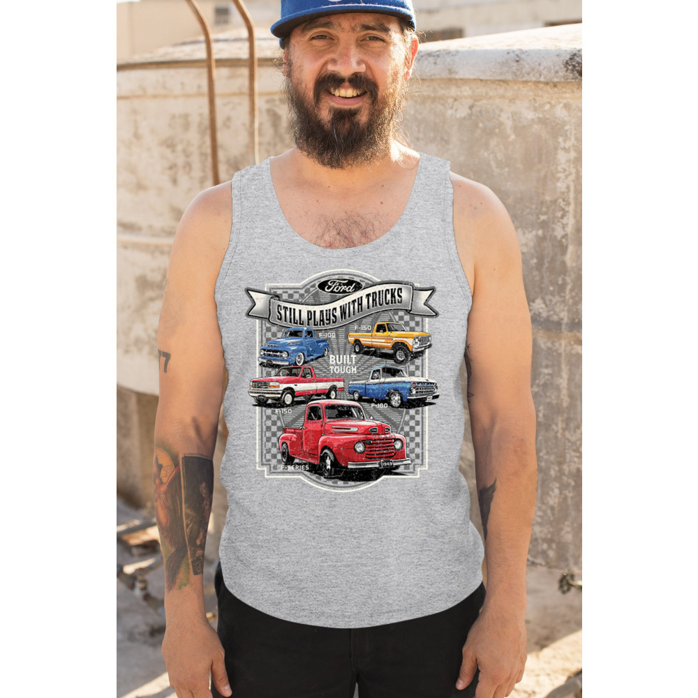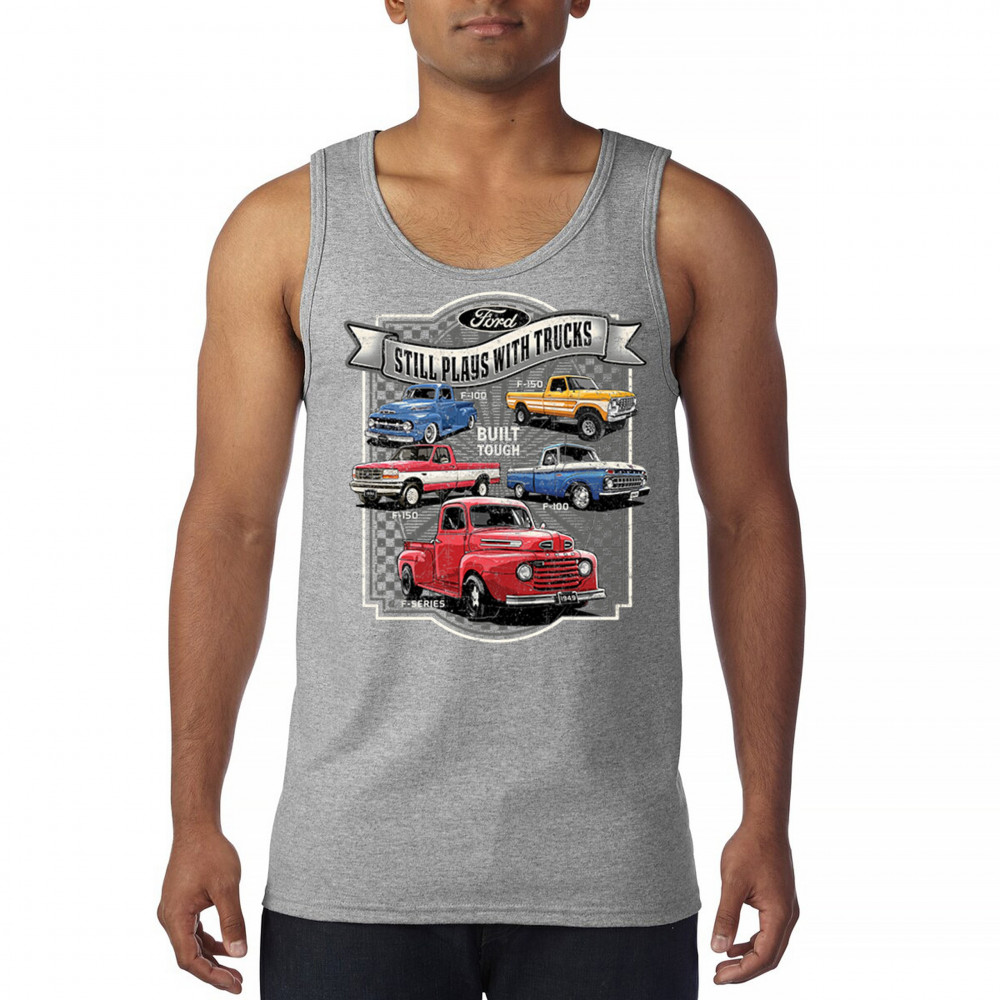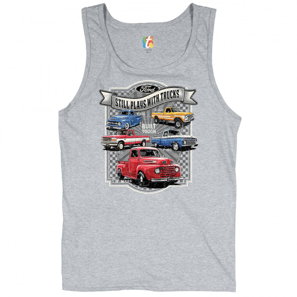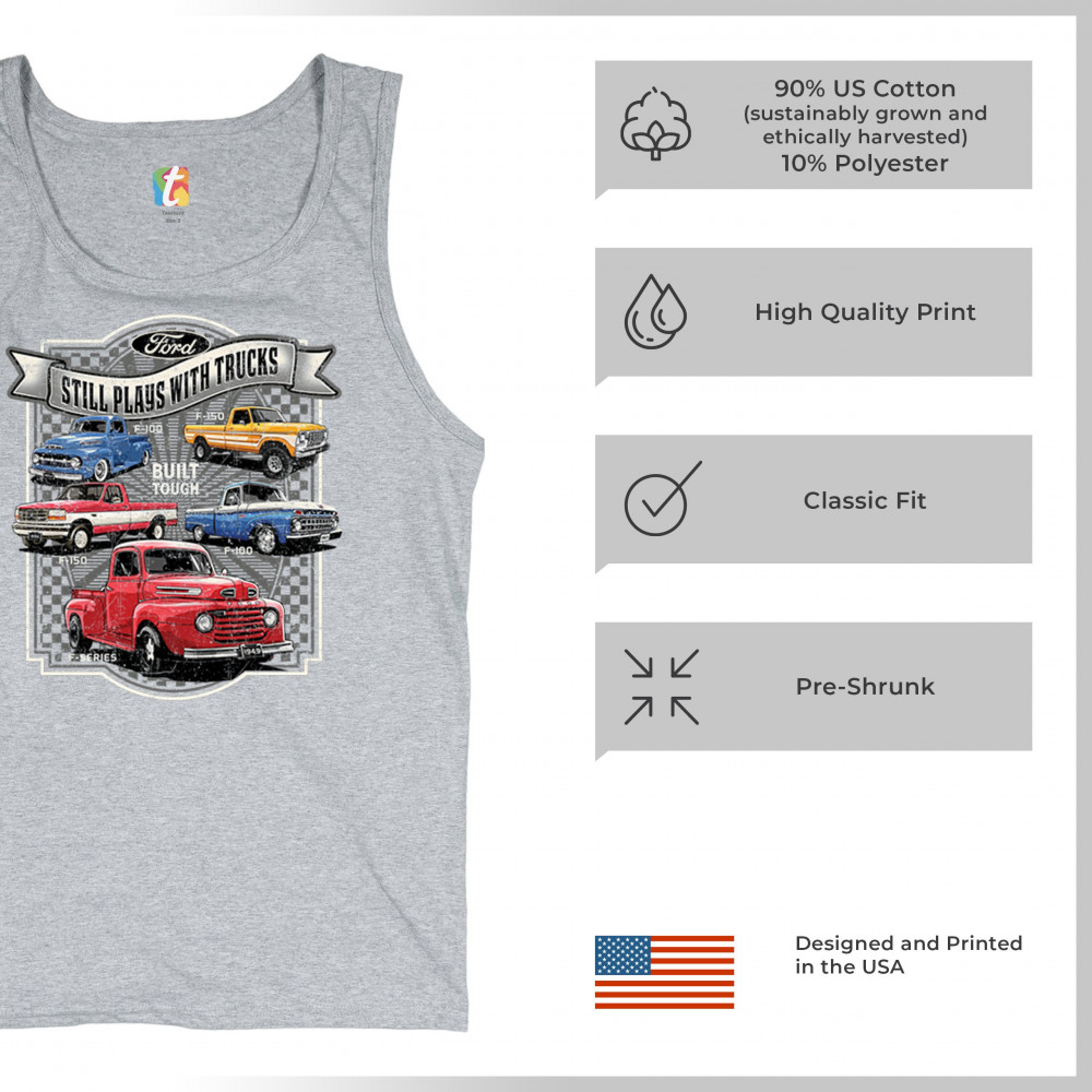 Features classic Ford F-Series trucks from 1949 to F-150. Great for vintage truck fans, garage wear, car shows, and collectors who love pickups.