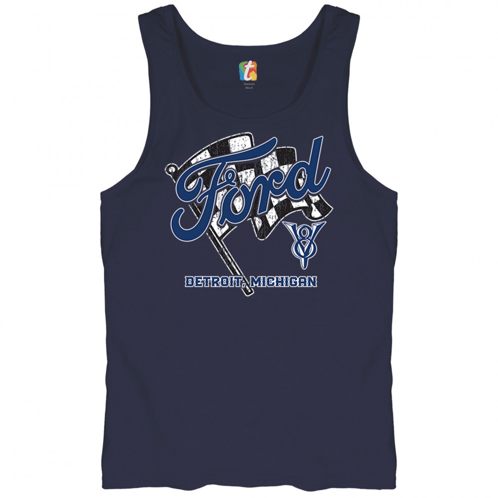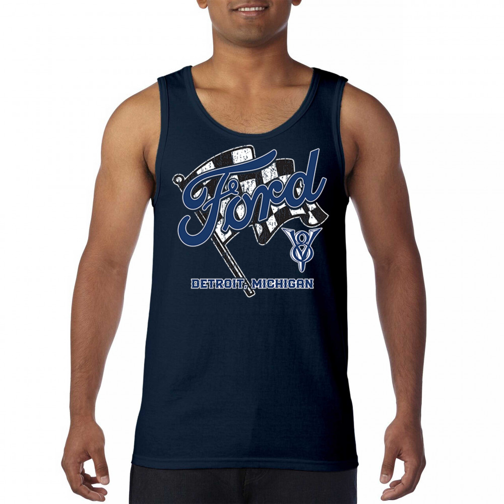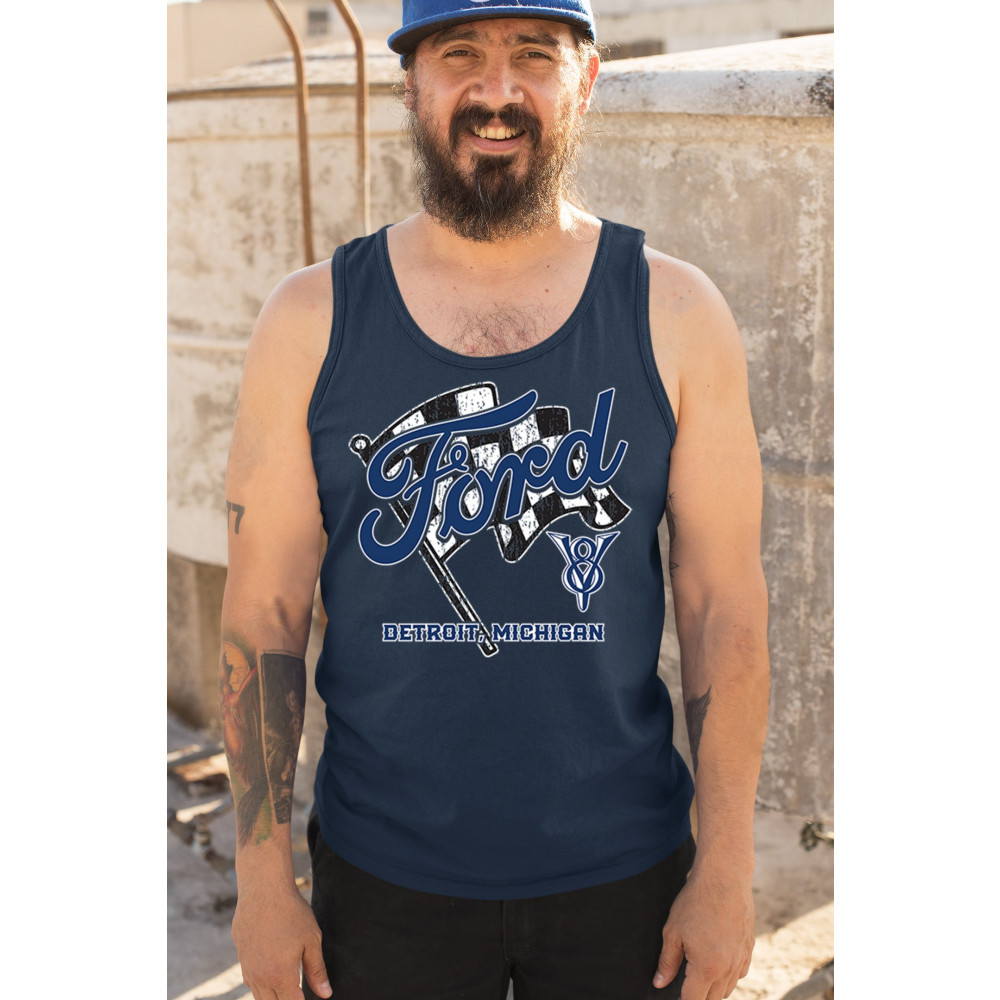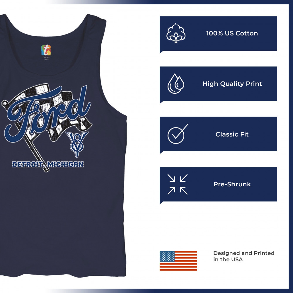 Honor Detroit, Michigan’s Ford legacy with this officially licensed design featuring a checkered flag and bold V8 emblem, perfect for muscle car fans and classic car lovers.