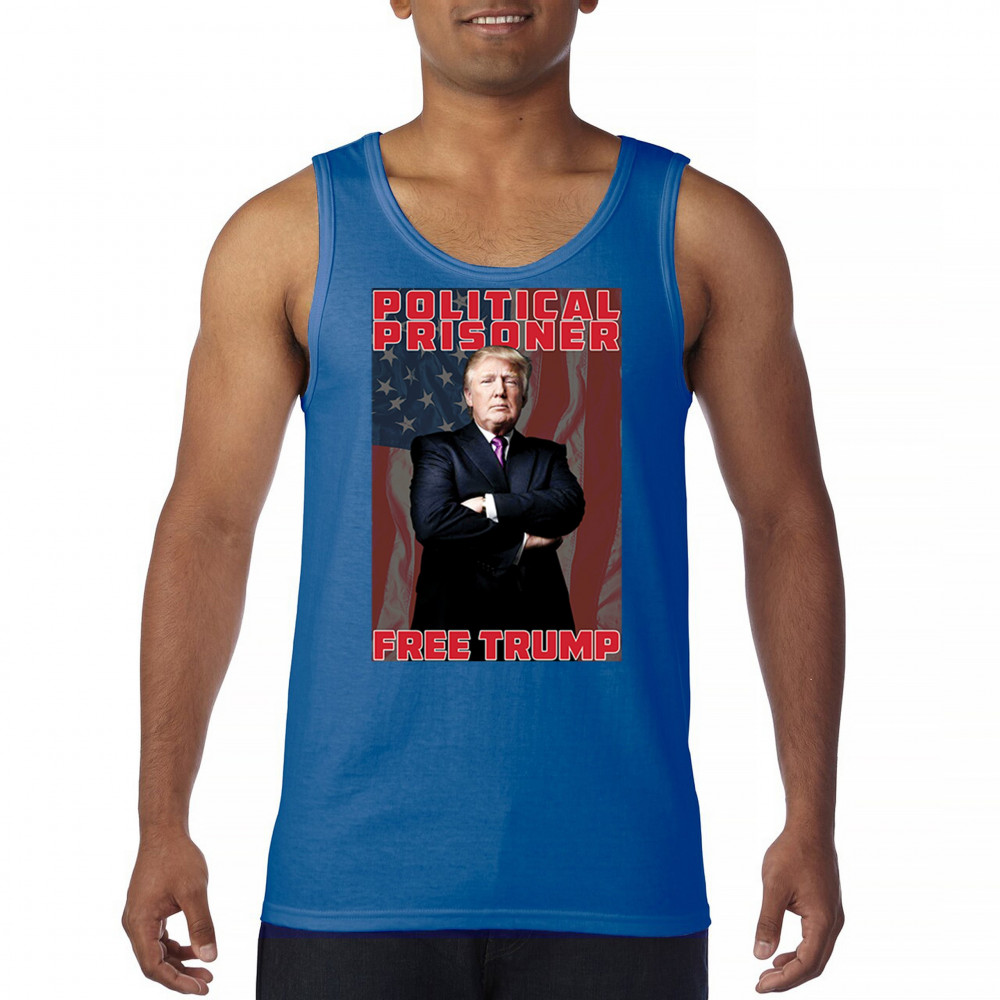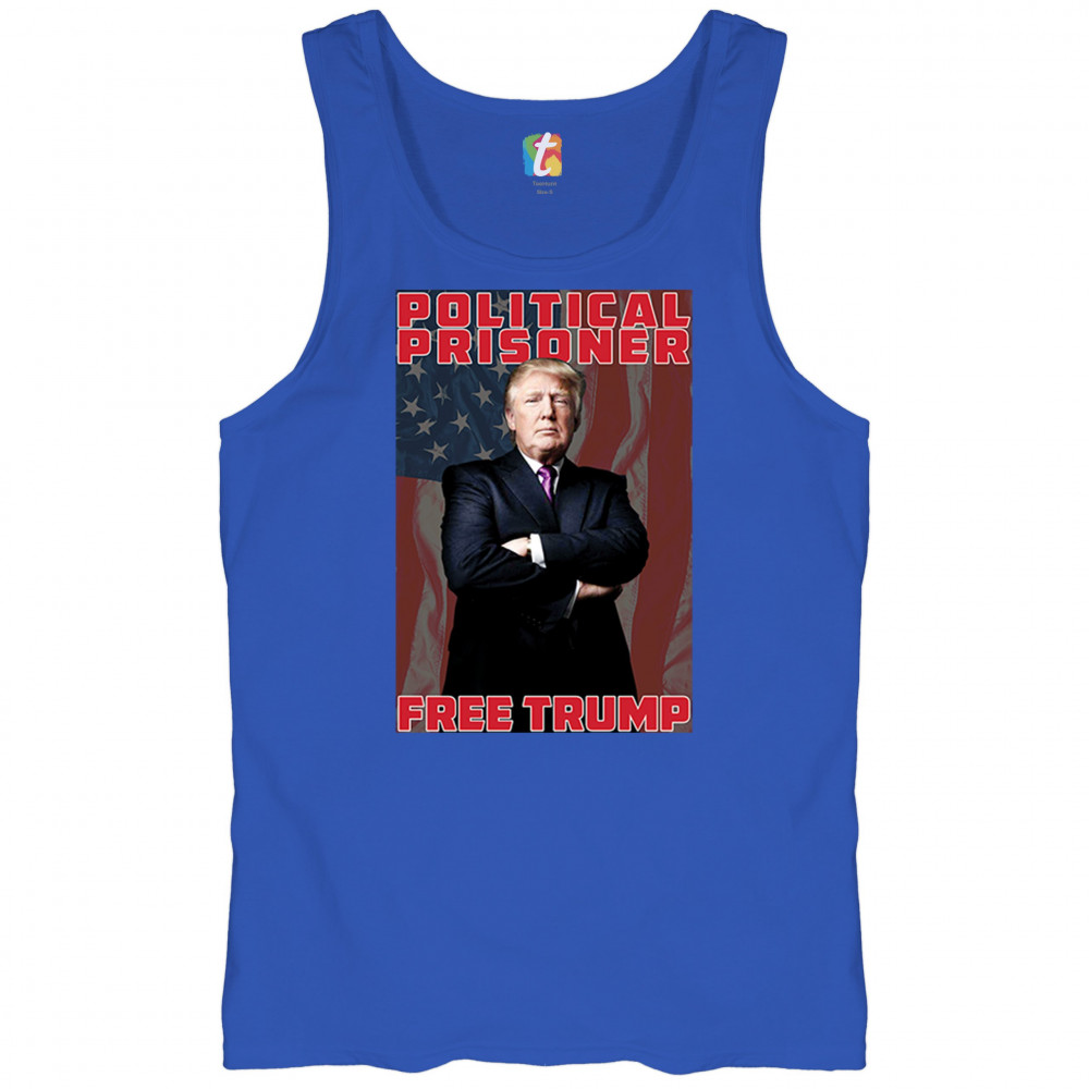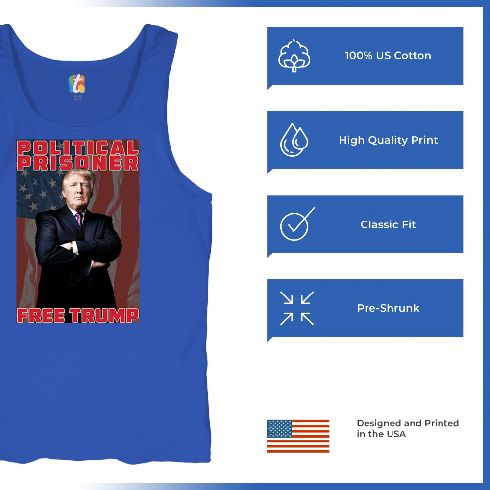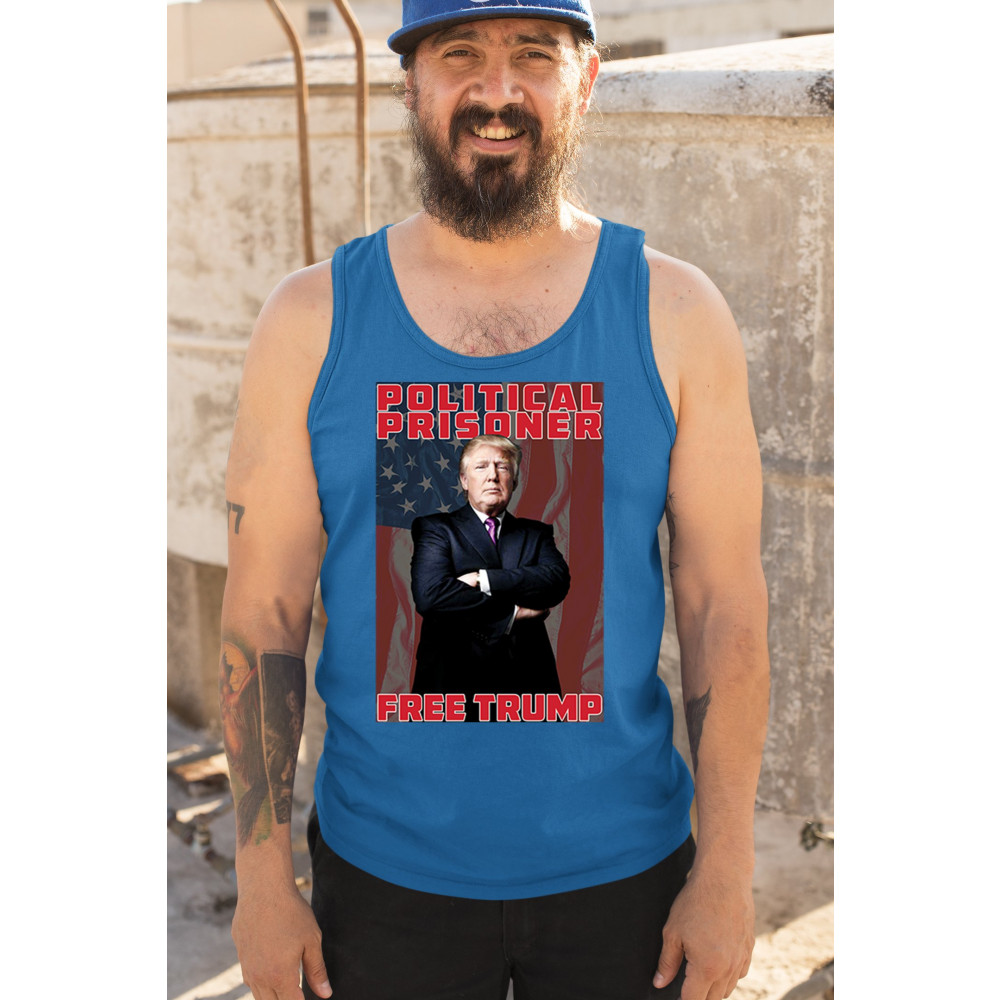 Show your support with the "Political Prisoner Free Trump" design, featuring Trump against an American flag. Perfect for conservative patriots and Trump supporters.