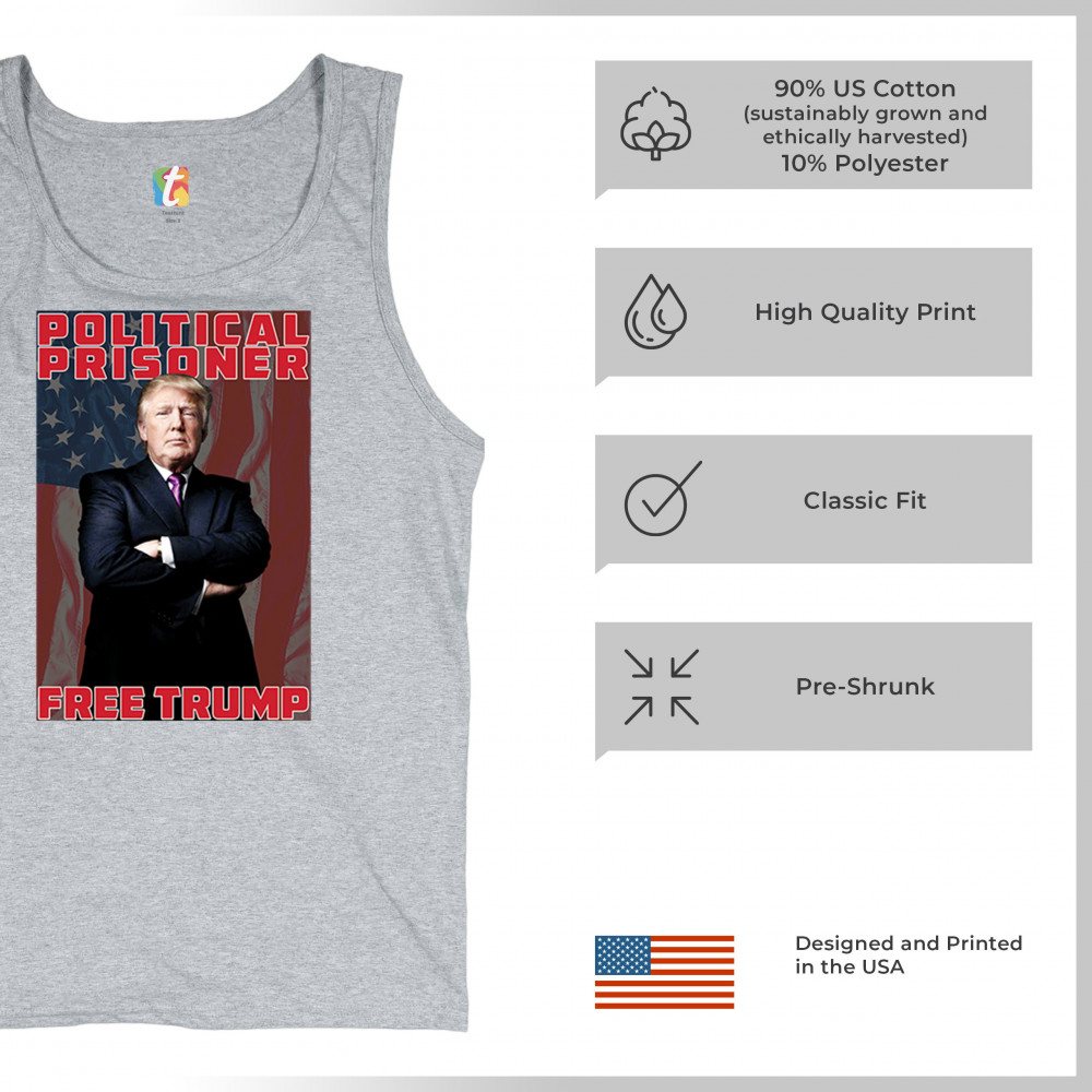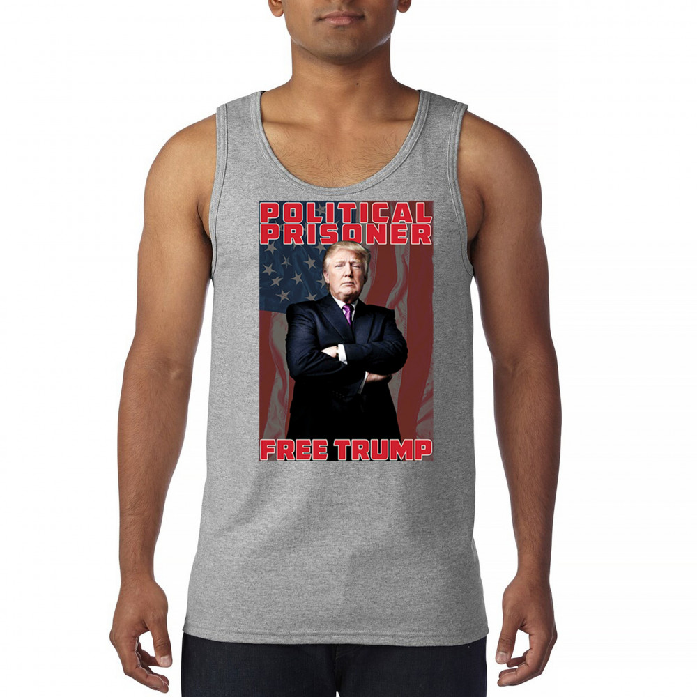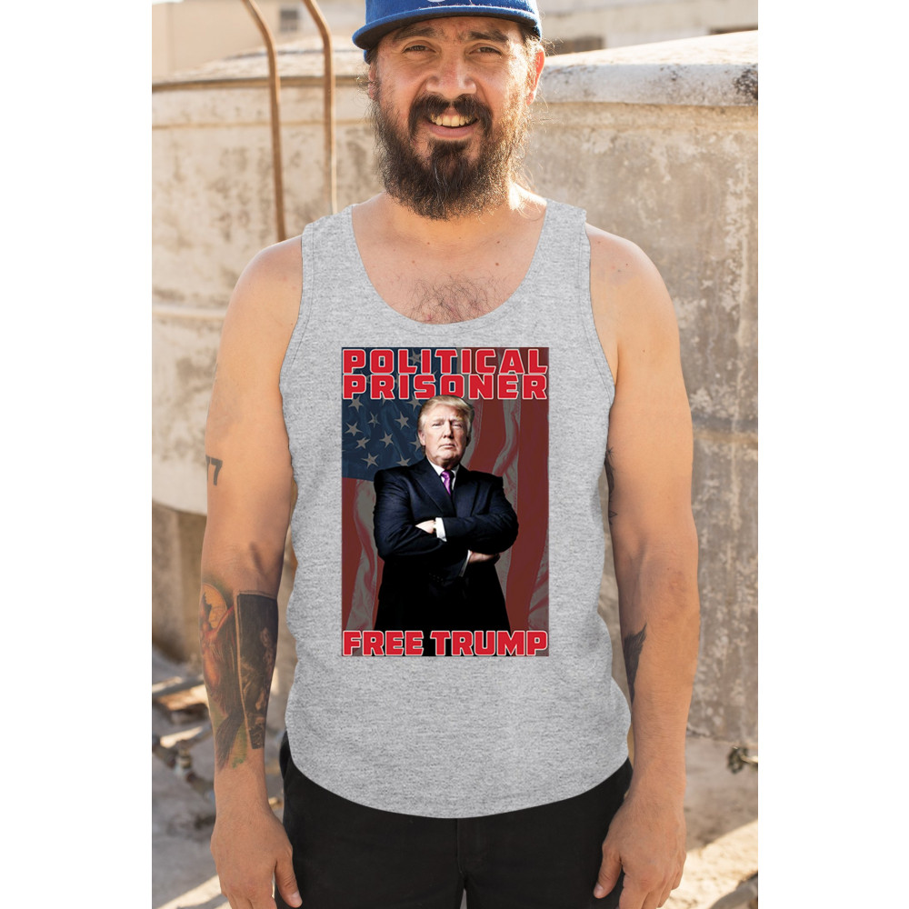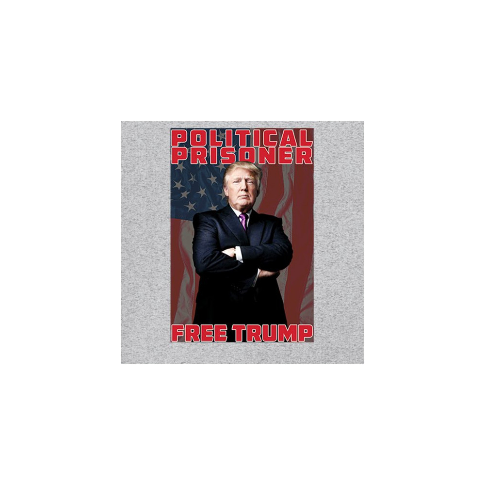 Show your support with the "Political Prisoner Free Trump" design, featuring Trump against an American flag. Perfect for conservative patriots and Trump supporters.