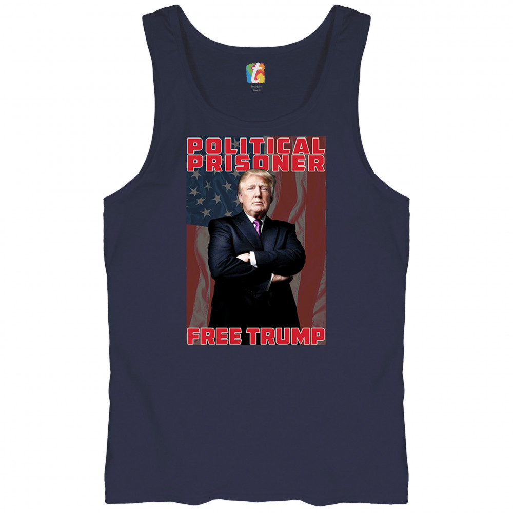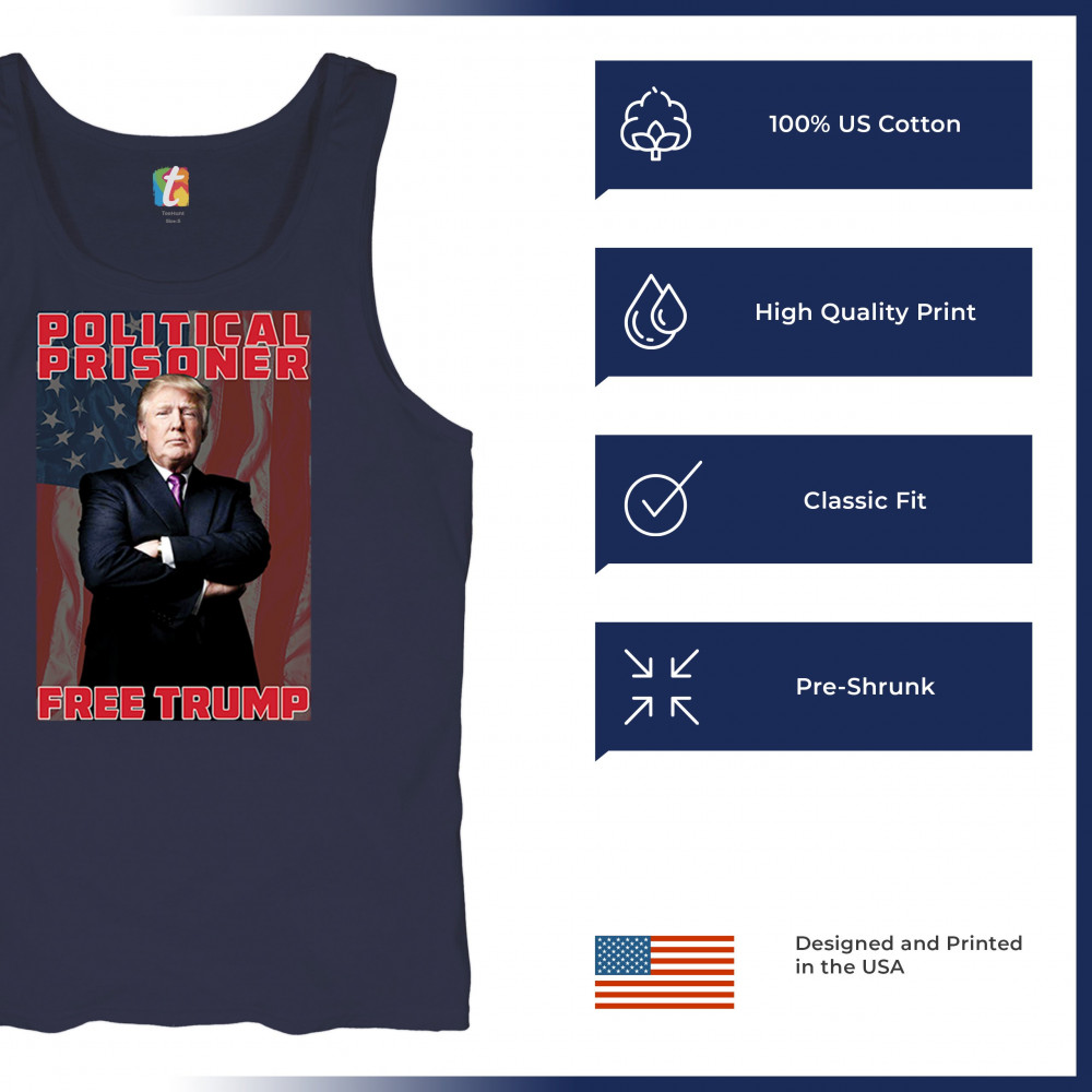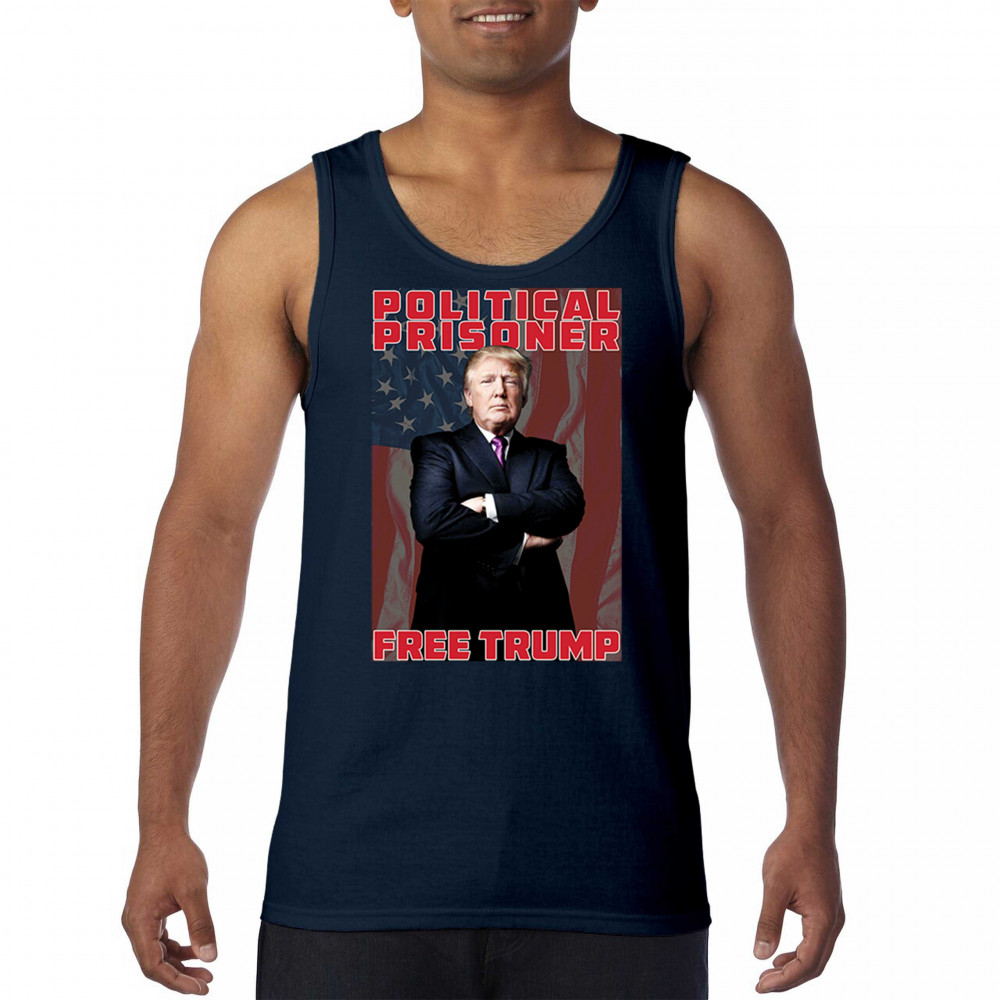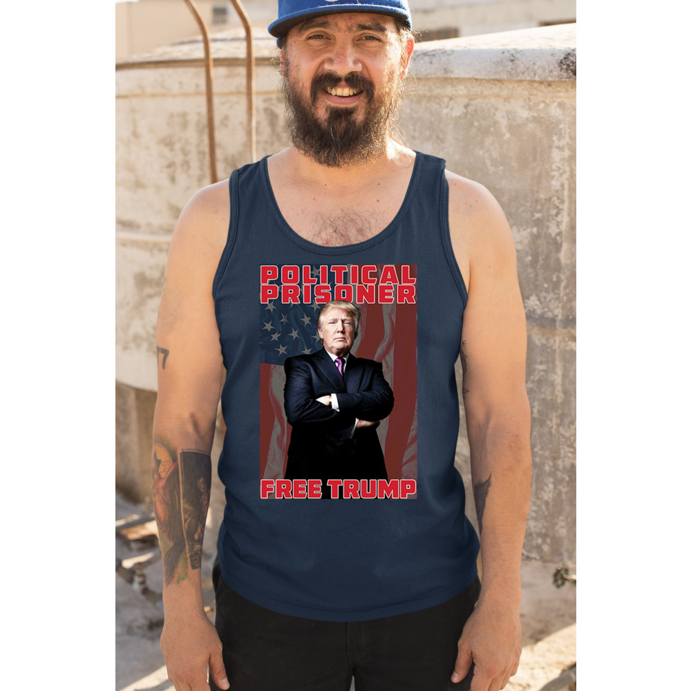 Show your support with the "Political Prisoner Free Trump" design, featuring Trump against an American flag. Perfect for conservative patriots and Trump supporters.