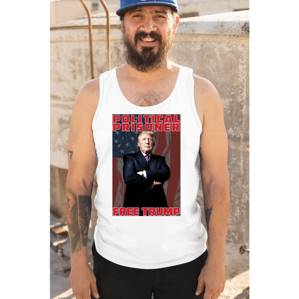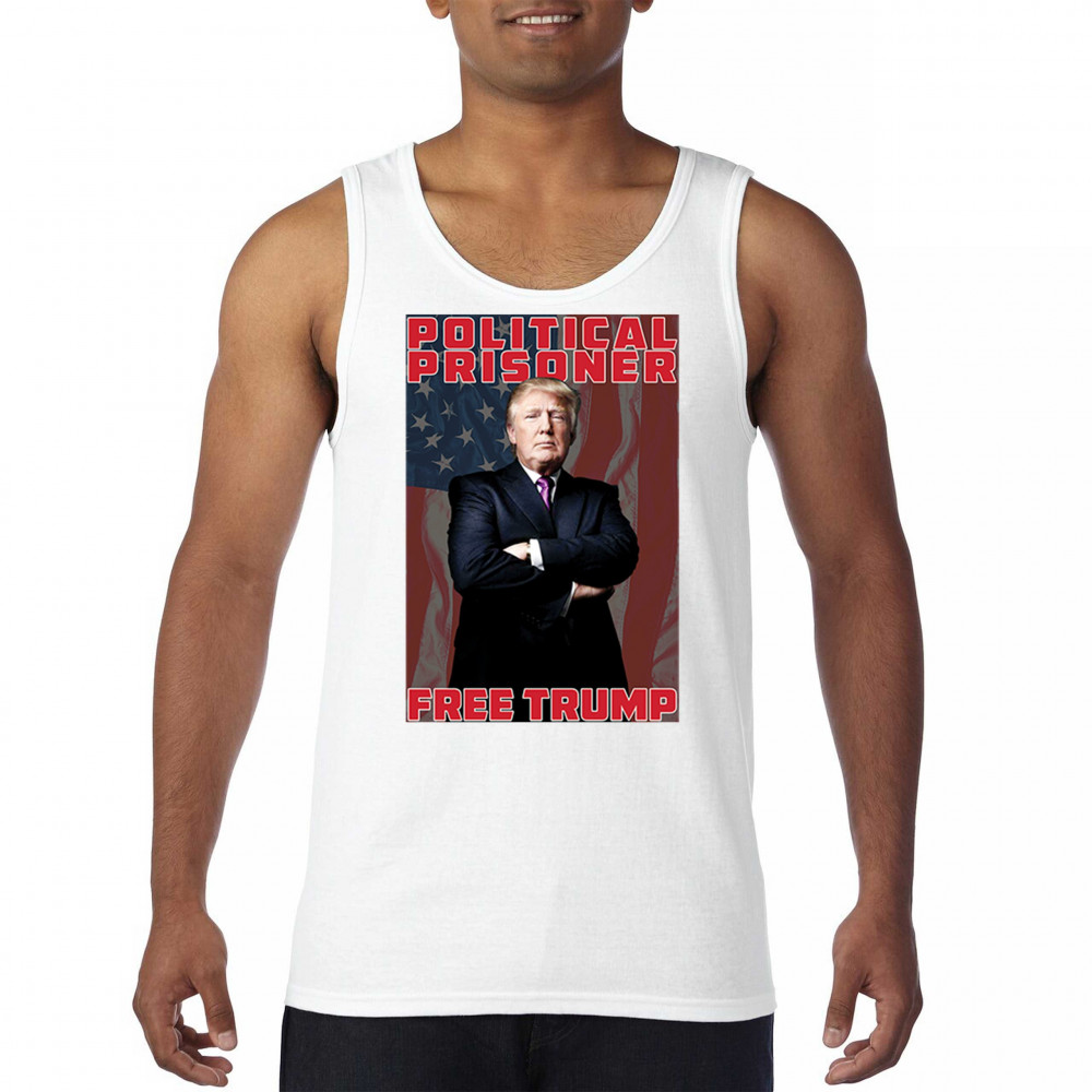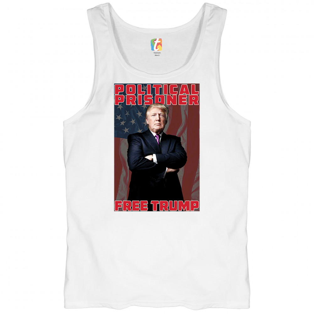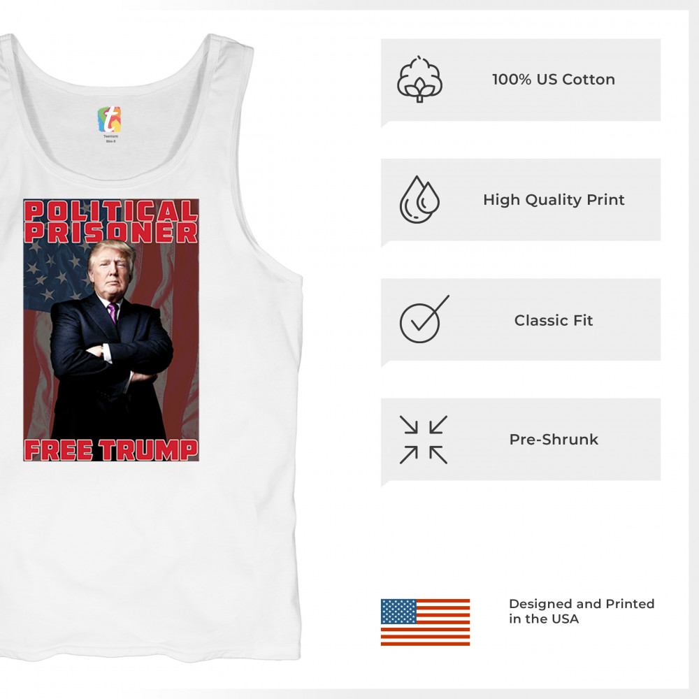 Show your support with the "Political Prisoner Free Trump" design, featuring Trump against an American flag. Perfect for conservative patriots and Trump supporters.
