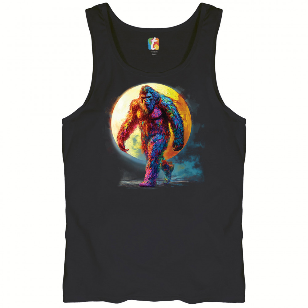 Rainbow Bigfoot under full moon design for cryptid lovers, festival goers, and psychedelic art fans. Bold, surreal, and eye-catching.