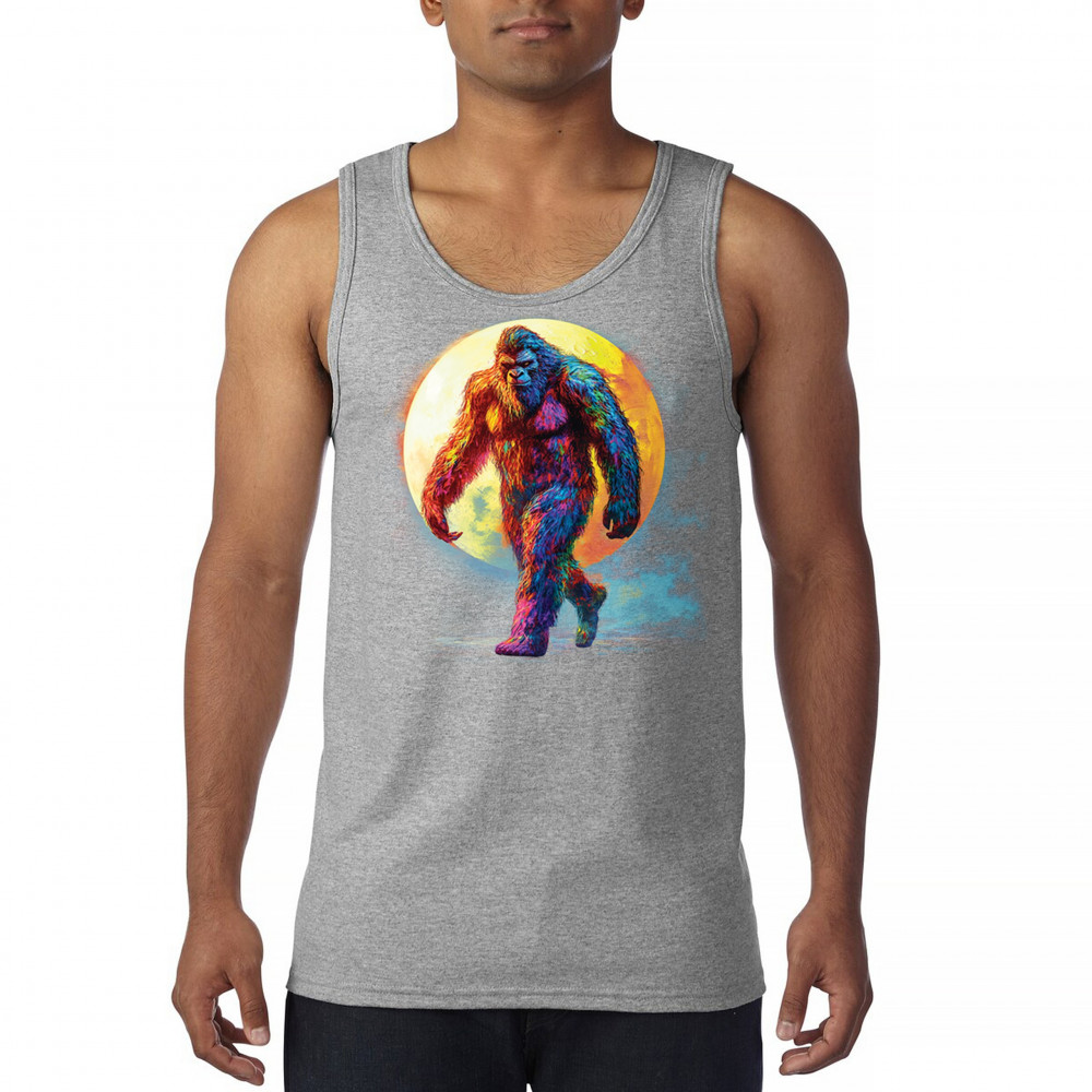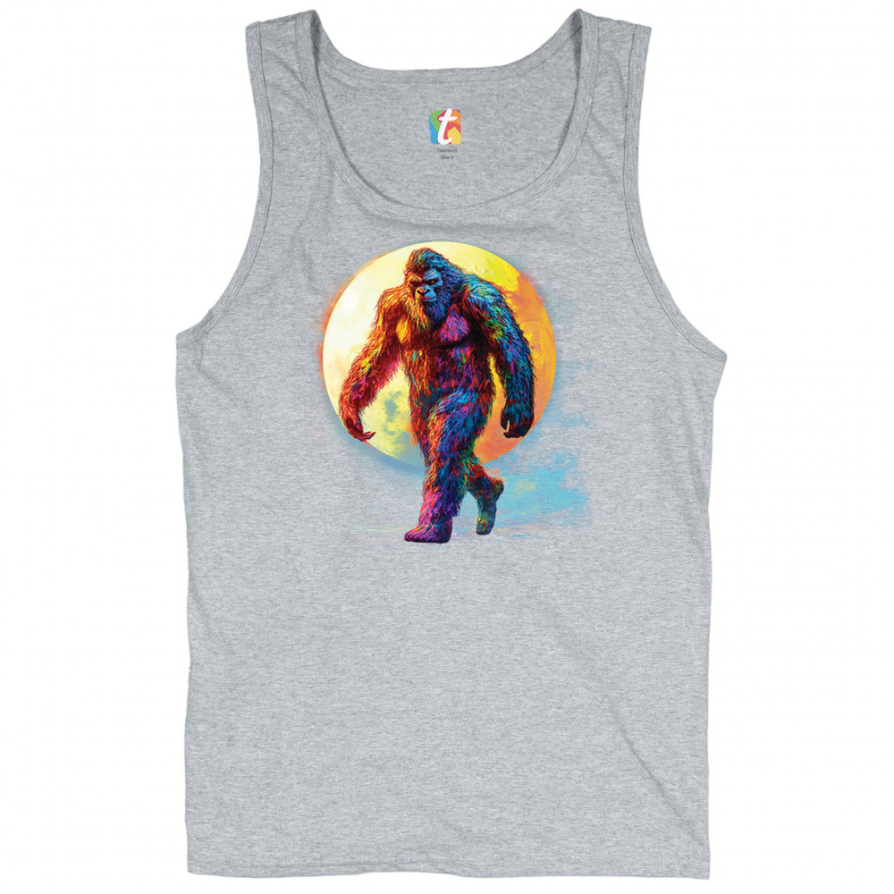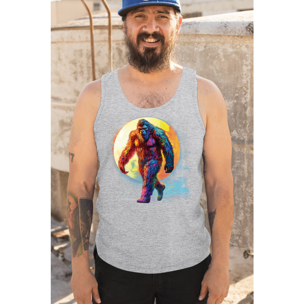 Rainbow Bigfoot under full moon design for cryptid lovers, festival goers, and psychedelic art fans. Bold, surreal, and eye-catching.