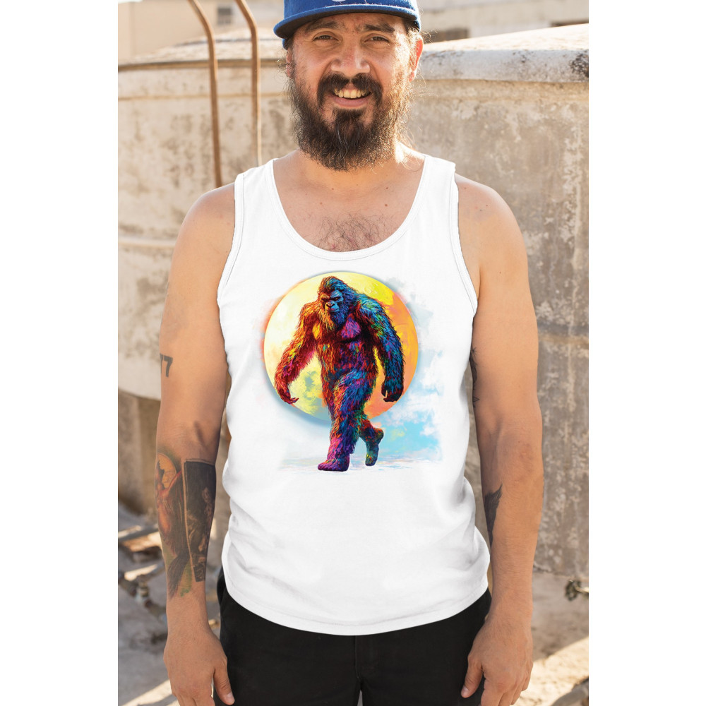 Rainbow Bigfoot under full moon design for cryptid lovers, festival goers, and psychedelic art fans. Bold, surreal, and eye-catching.