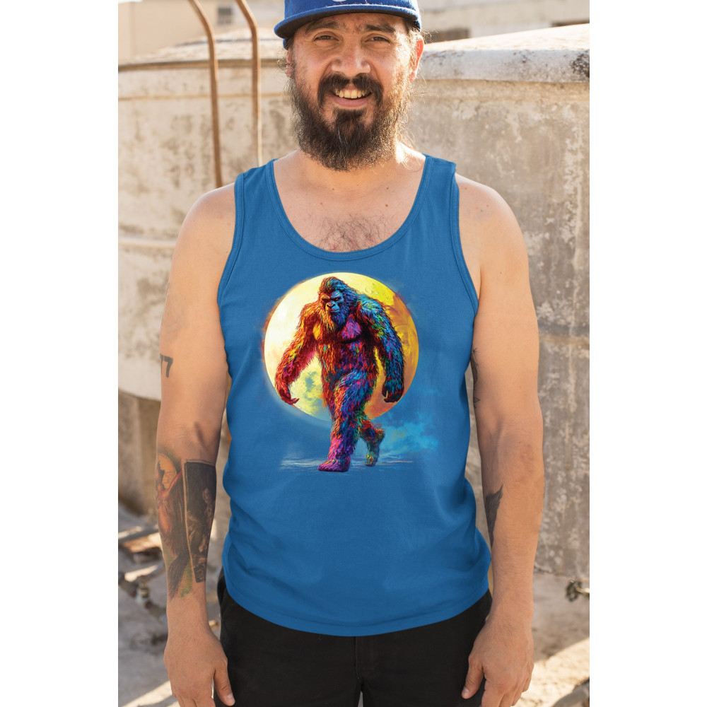 Rainbow Bigfoot under full moon design for cryptid lovers, festival goers, and psychedelic art fans. Bold, surreal, and eye-catching.