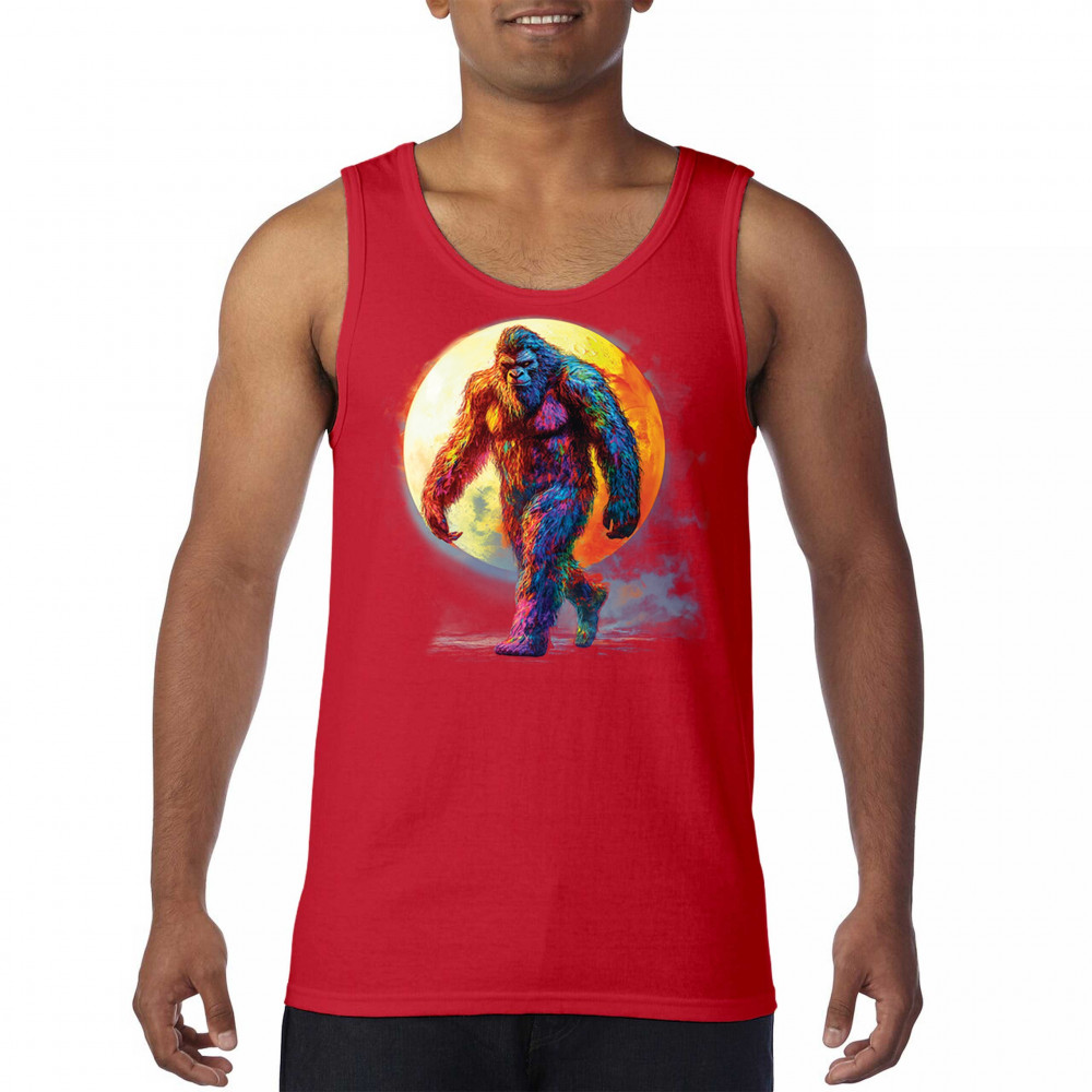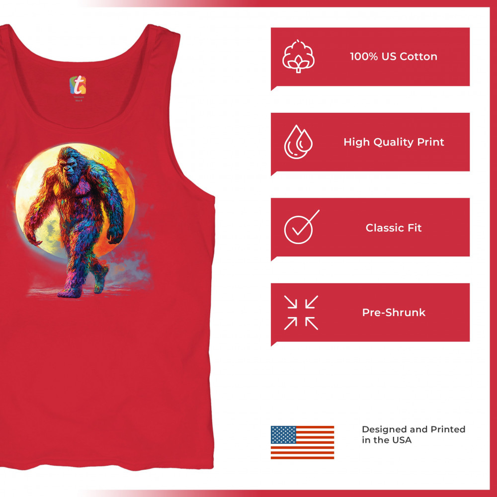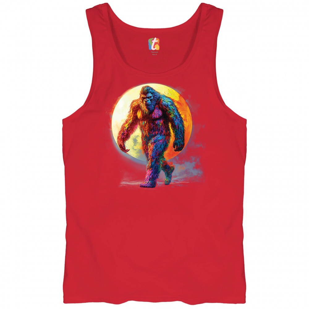 Rainbow Bigfoot under full moon design for cryptid lovers, festival goers, and psychedelic art fans. Bold, surreal, and eye-catching.
