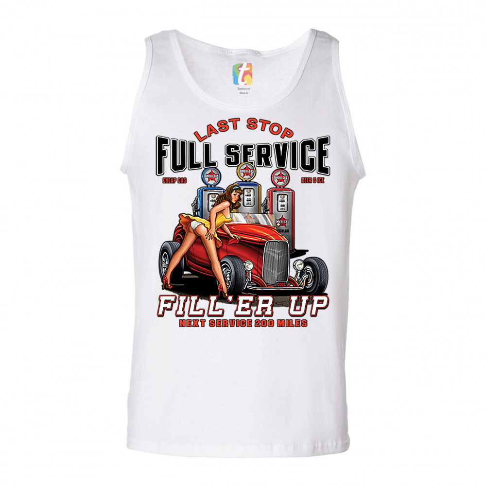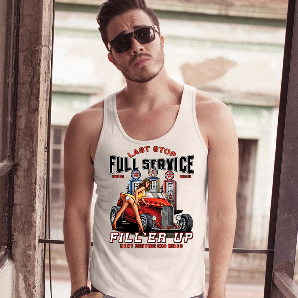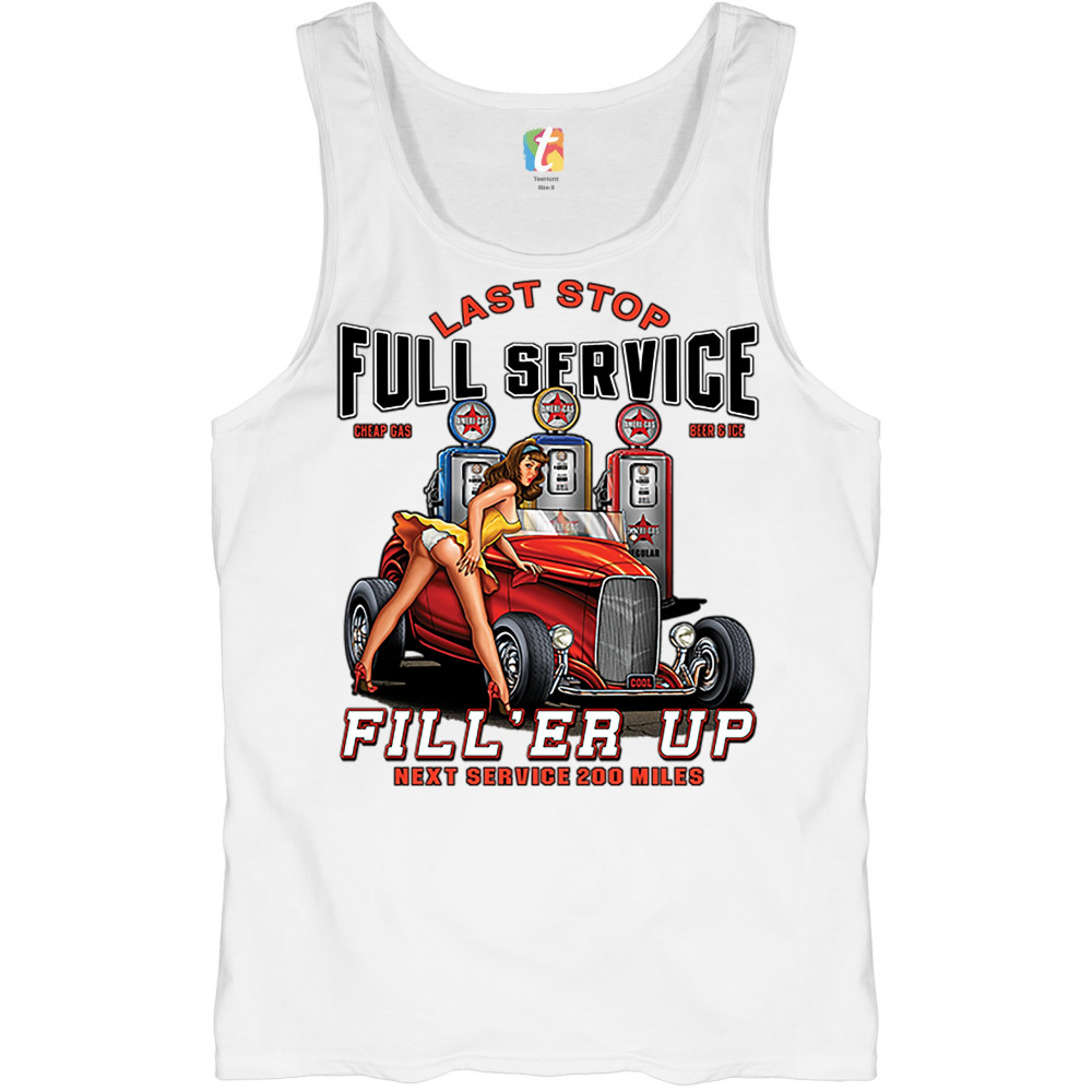 A print featuring a hot pin-up girl leaning on a convertible coupe hot rod with a registration plate saying "cool". In the background there are several gas stations. The print says: "Last Stop, Full Service, Cheap Gas, Beer & Ice, Fill 'Er Up, Next Servic
