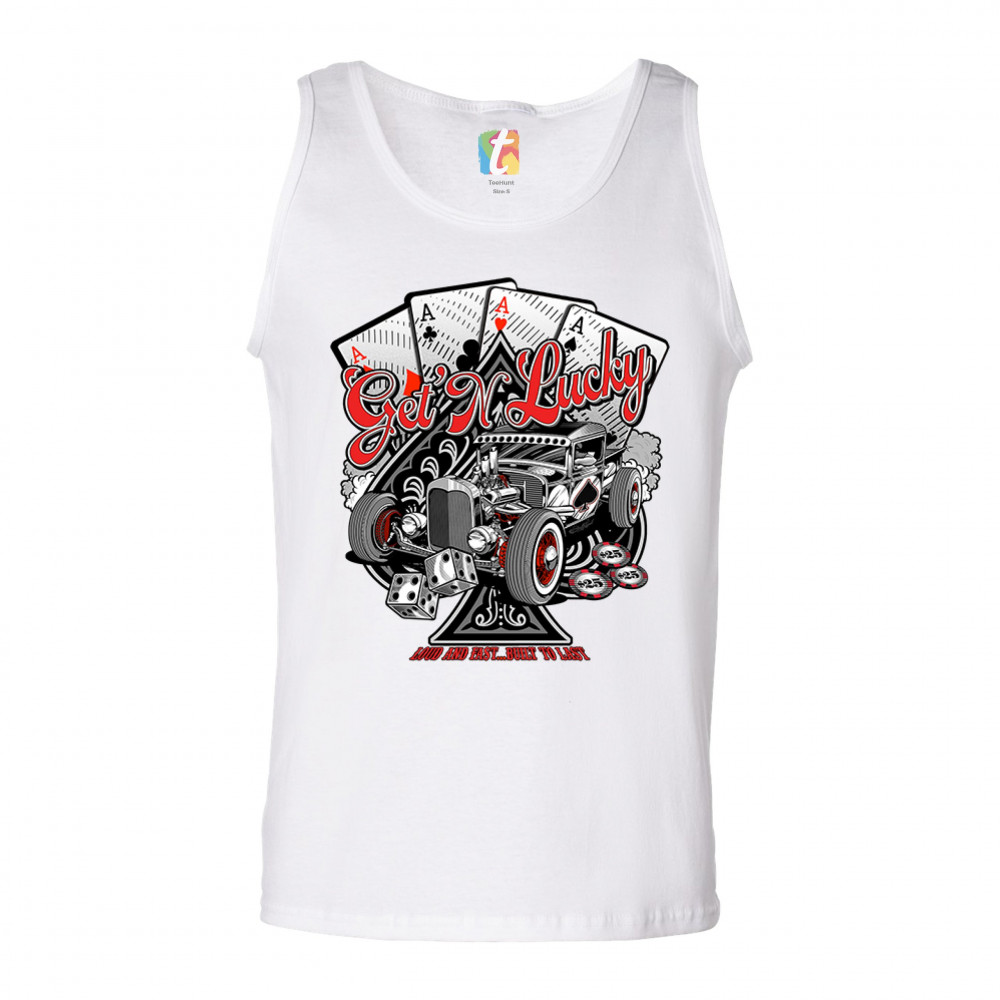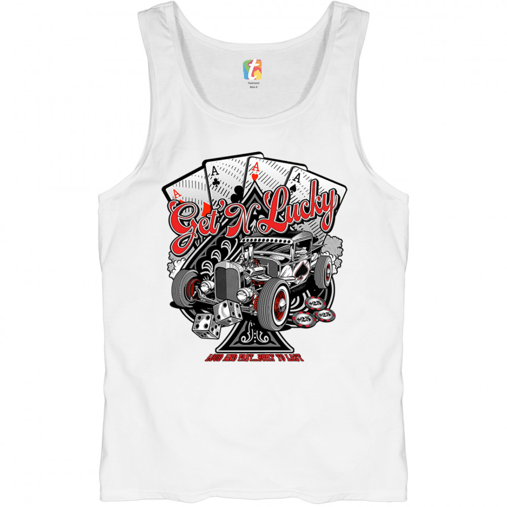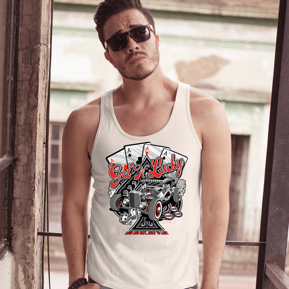 A print featuring a hot rod and a giant ace of spades behind it. In the background there are four aces of every suit. In front of the car there are 2 dices and several casino chips. The print says: "Get'n lucky, louad and fast… built to last". A great cho