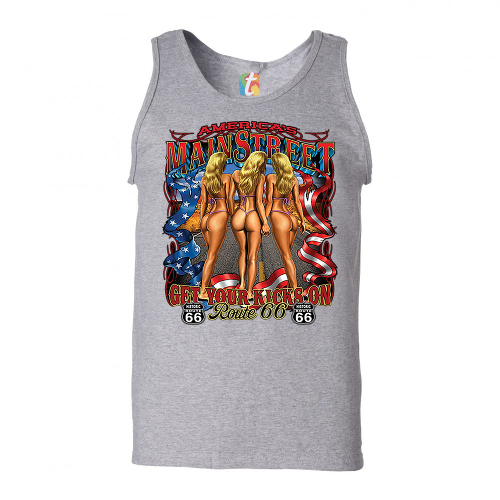 A print featuring three scantily-clad blondes holding each other's hands walking on a highway. The print says: "America's Main Street, Get Your Kicks on Route 66" and also features a ribbon with stars and stripes on it and two "Historic Route 66" signs. A