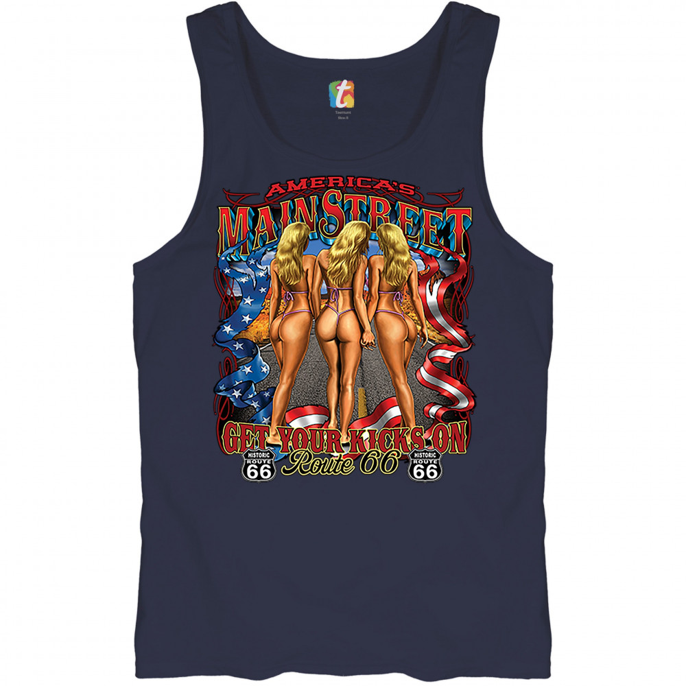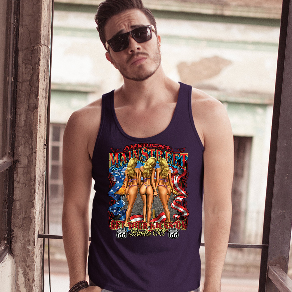 A print featuring three scantily-clad blondes holding each other's hands walking on a highway. The print says: "America's Main Street, Get Your Kicks on Route 66" and also features a ribbon with stars and stripes on it and two "Historic Route 66" signs. A
