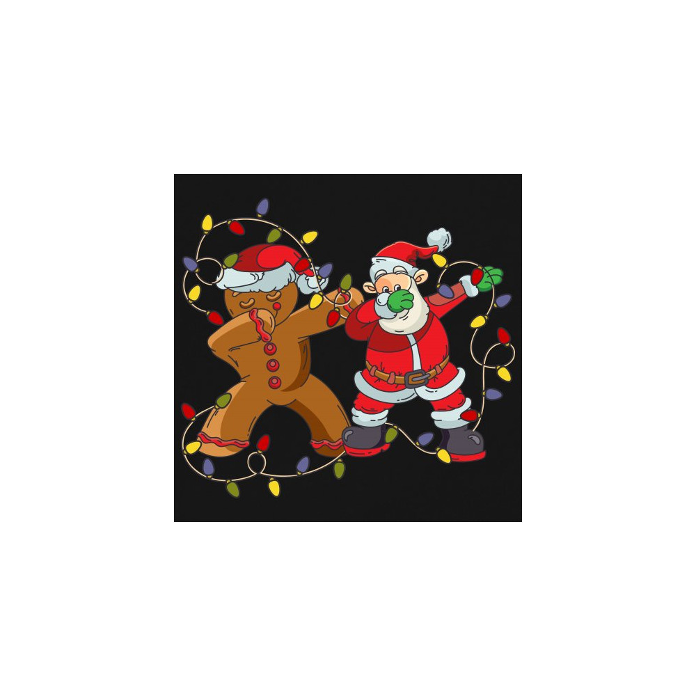 A funny print featuring a gingerbread man and Santa Claus dab dancing while surrounded by Christmas lights. Amazing choice to make people smile and spread positive vibes on Christmas Eve.