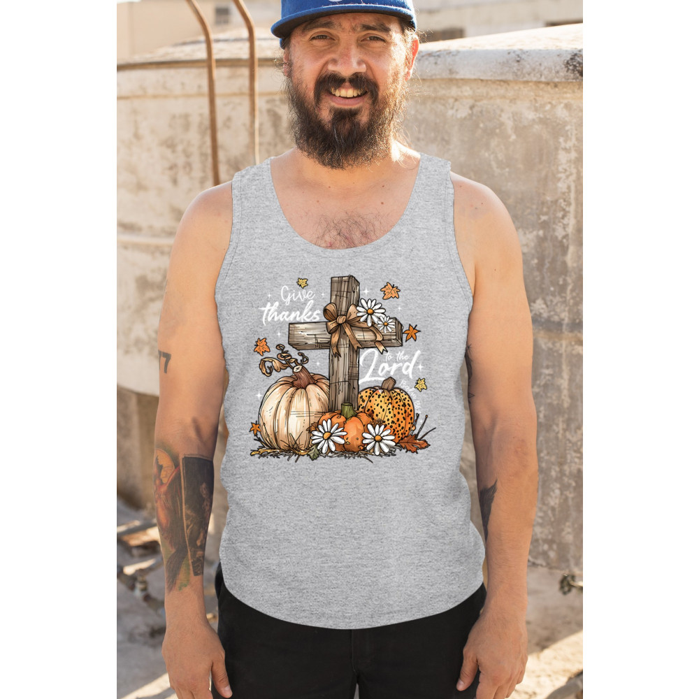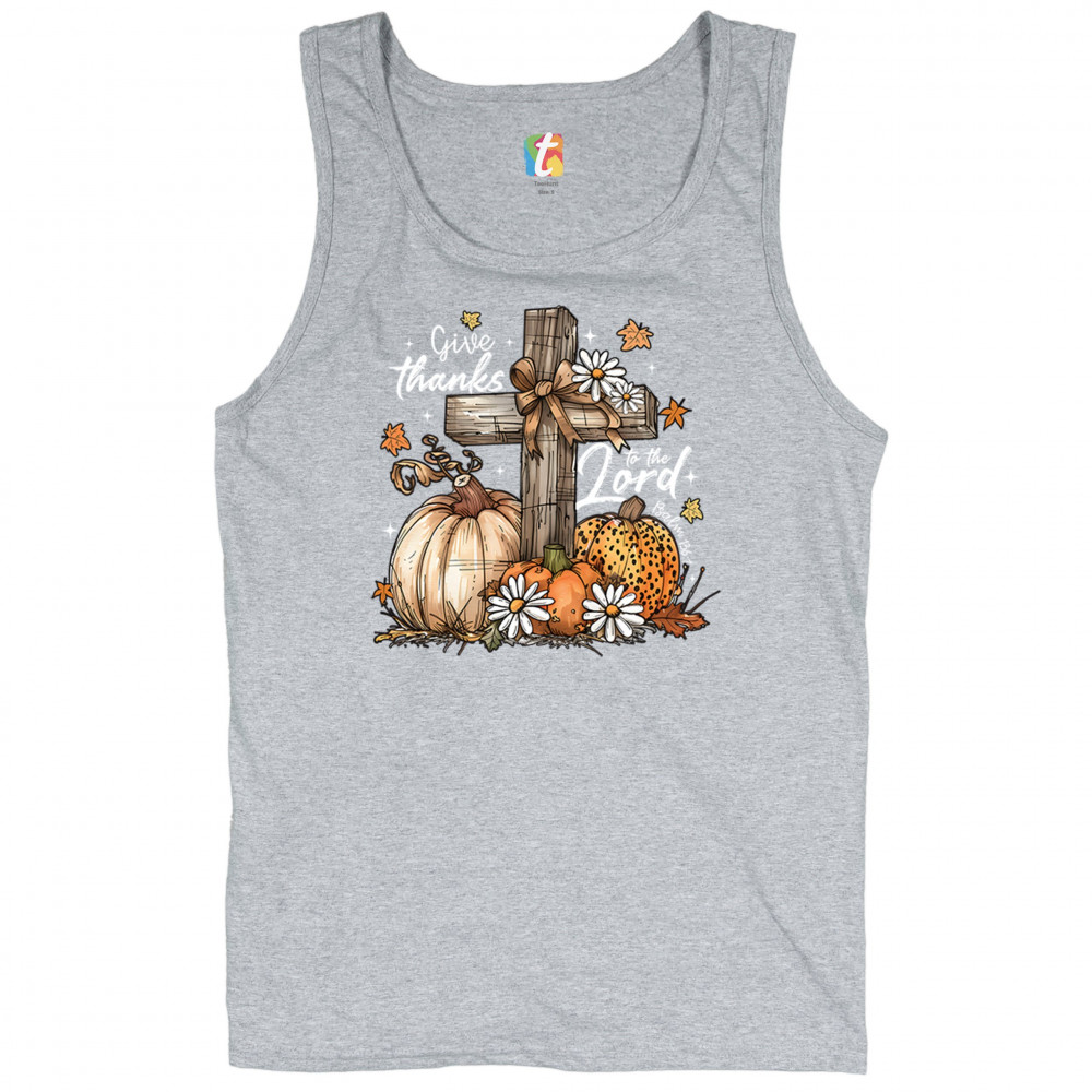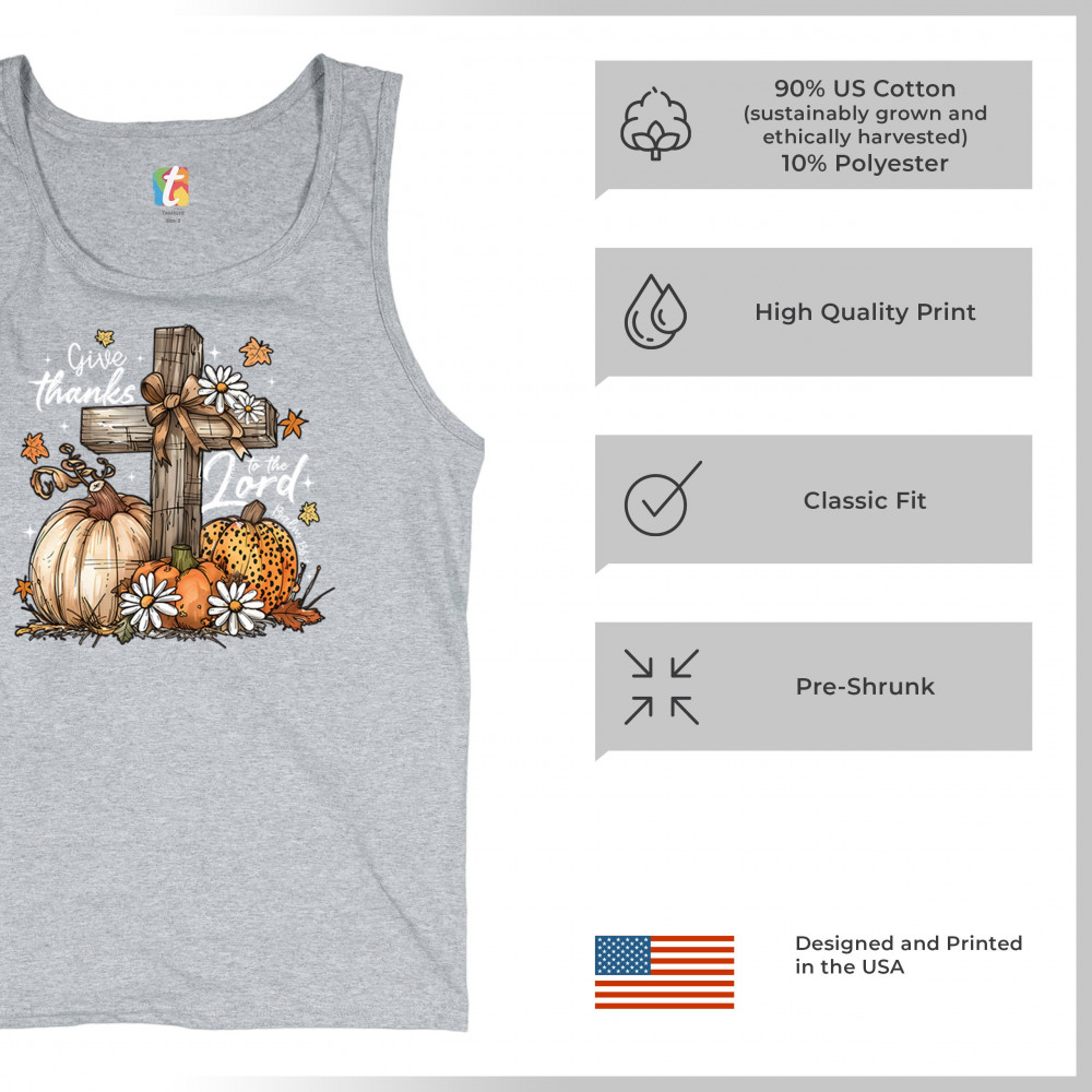 Thanksgiving design with pumpkins, daisies, and rustic cross. Perfect for Turkey Day, faithful family gatherings, and fall festival blessings.