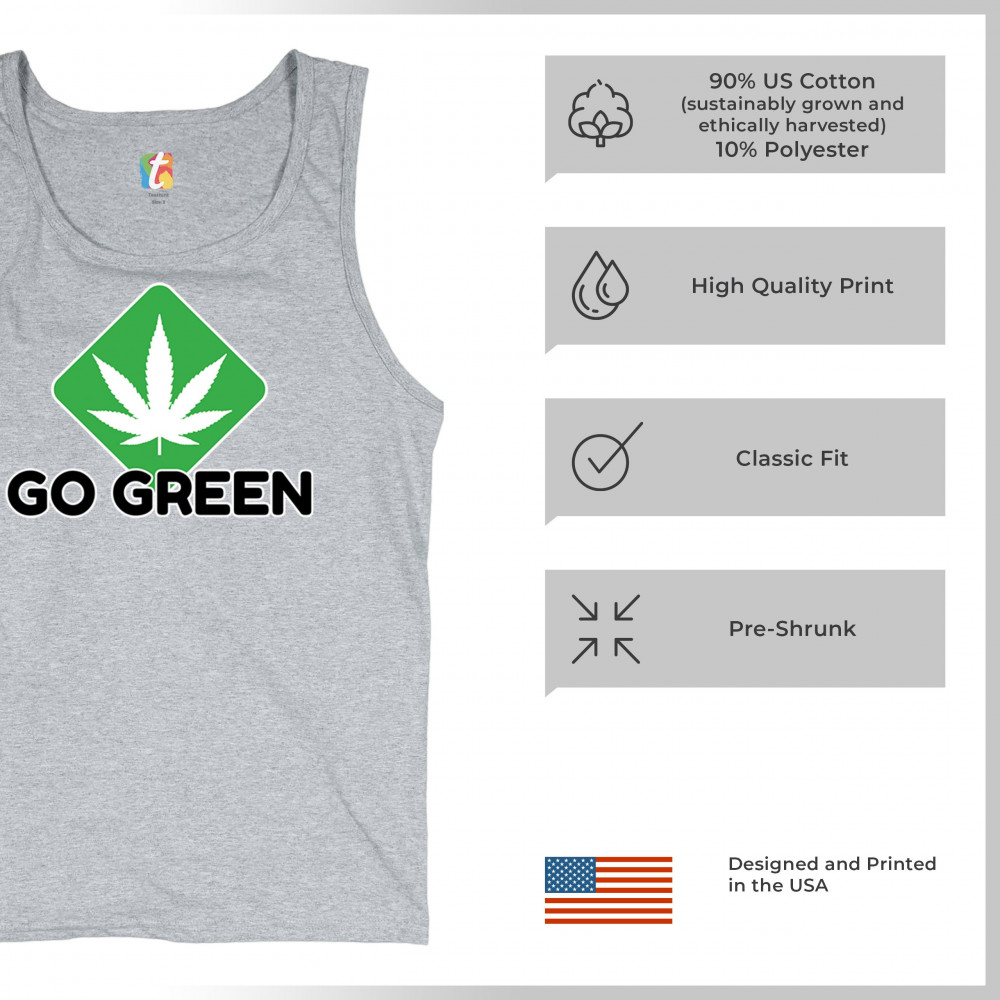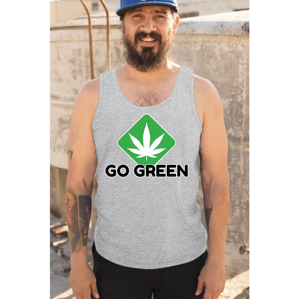 Bold Go Green design with cannabis leaf icon. Perfect for 420 fans, eco-conscious wearers, stoners, and marijuana advocates.