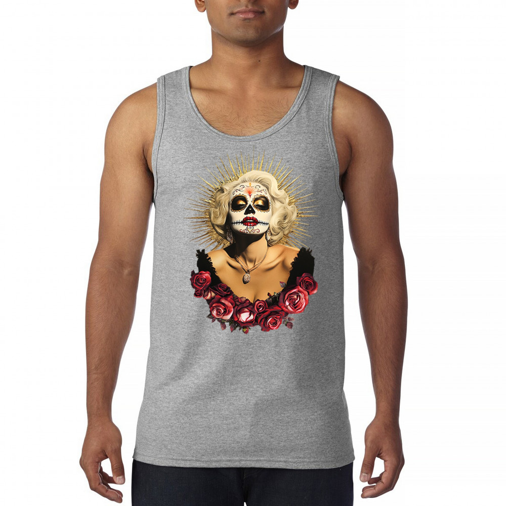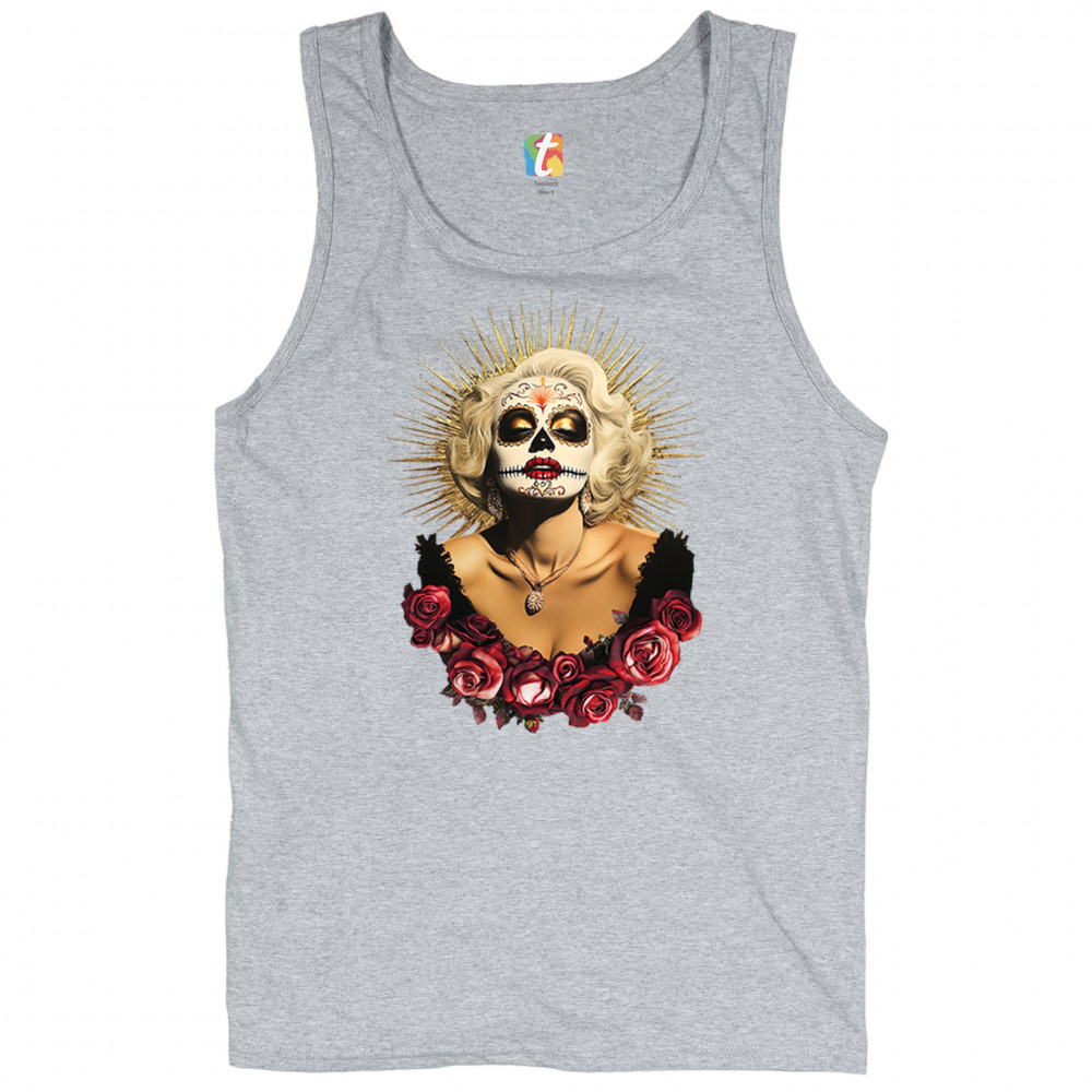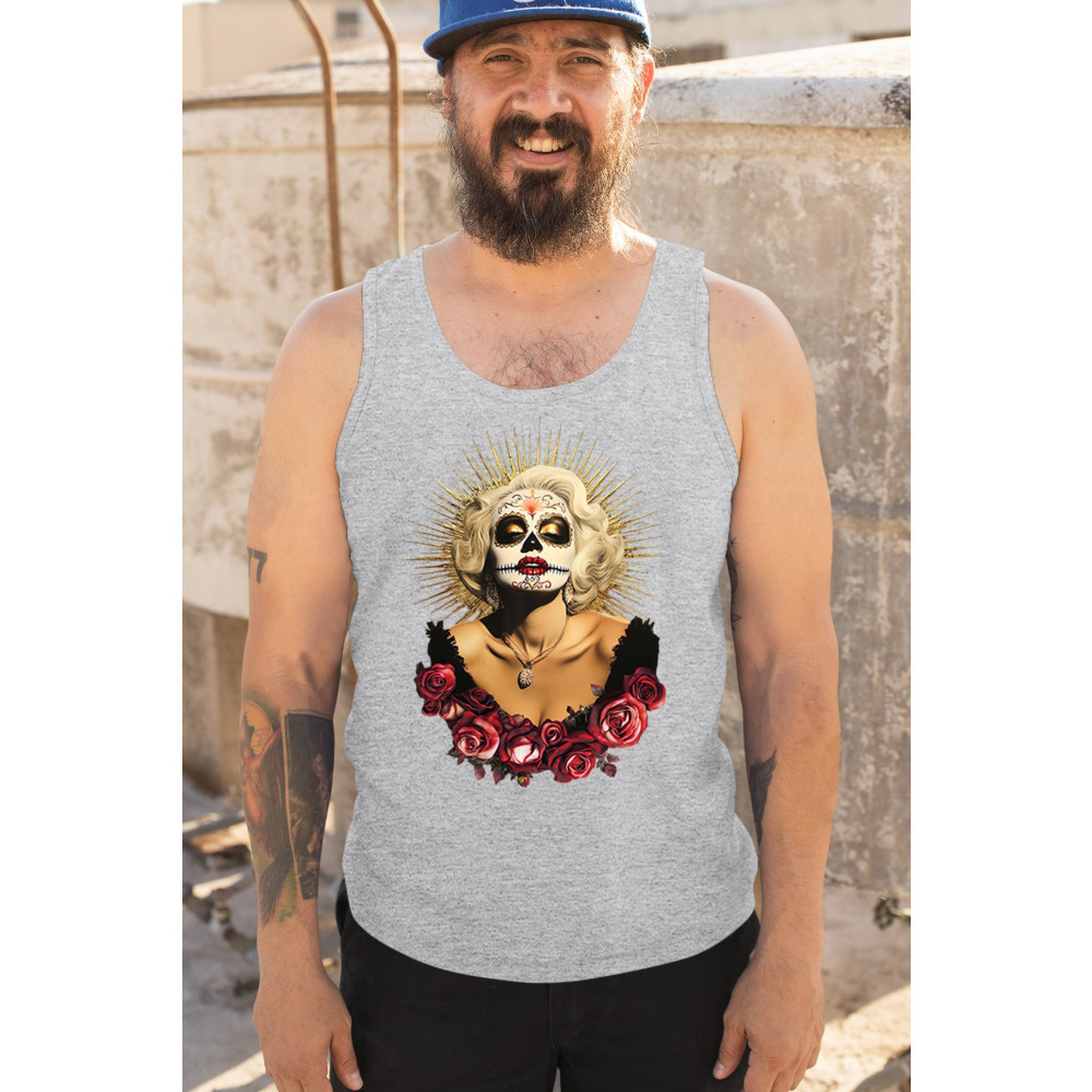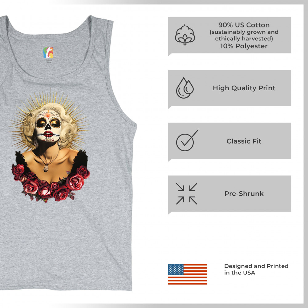 This bold and beautiful sugar skull design features a glamorous calavera woman crowned in a golden halo and framed by roses. A divine tribute to Dia de los Muertos, this look blends vintage glam, Latin culture, makeup artistry, and sacred symbolism. Perfect for fans of gothic beauty, Halloween, and heritage expression.