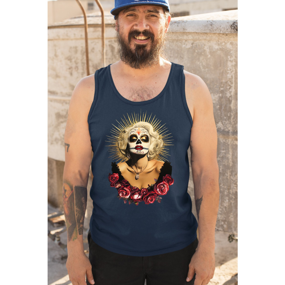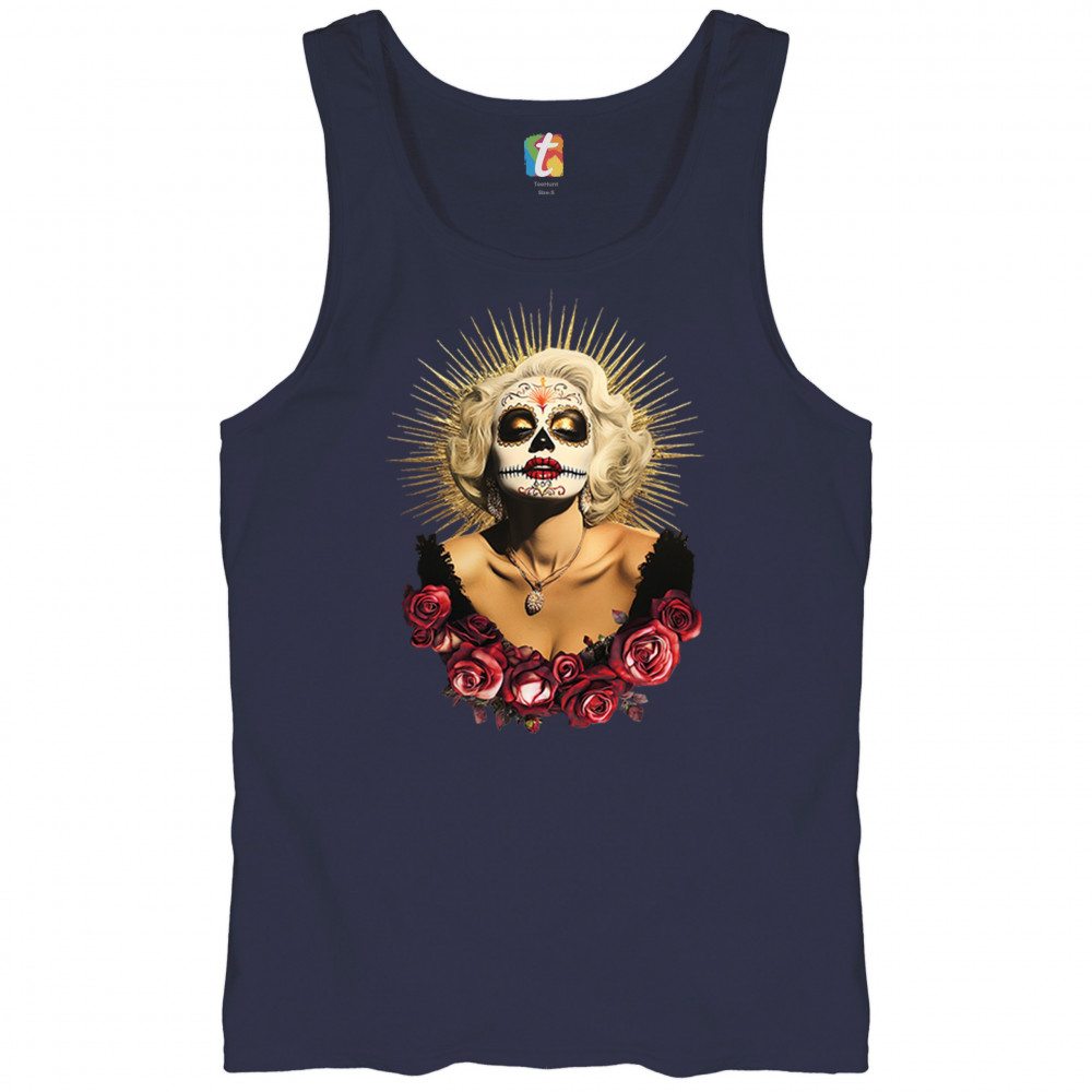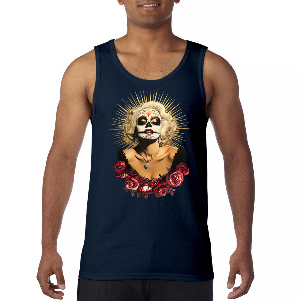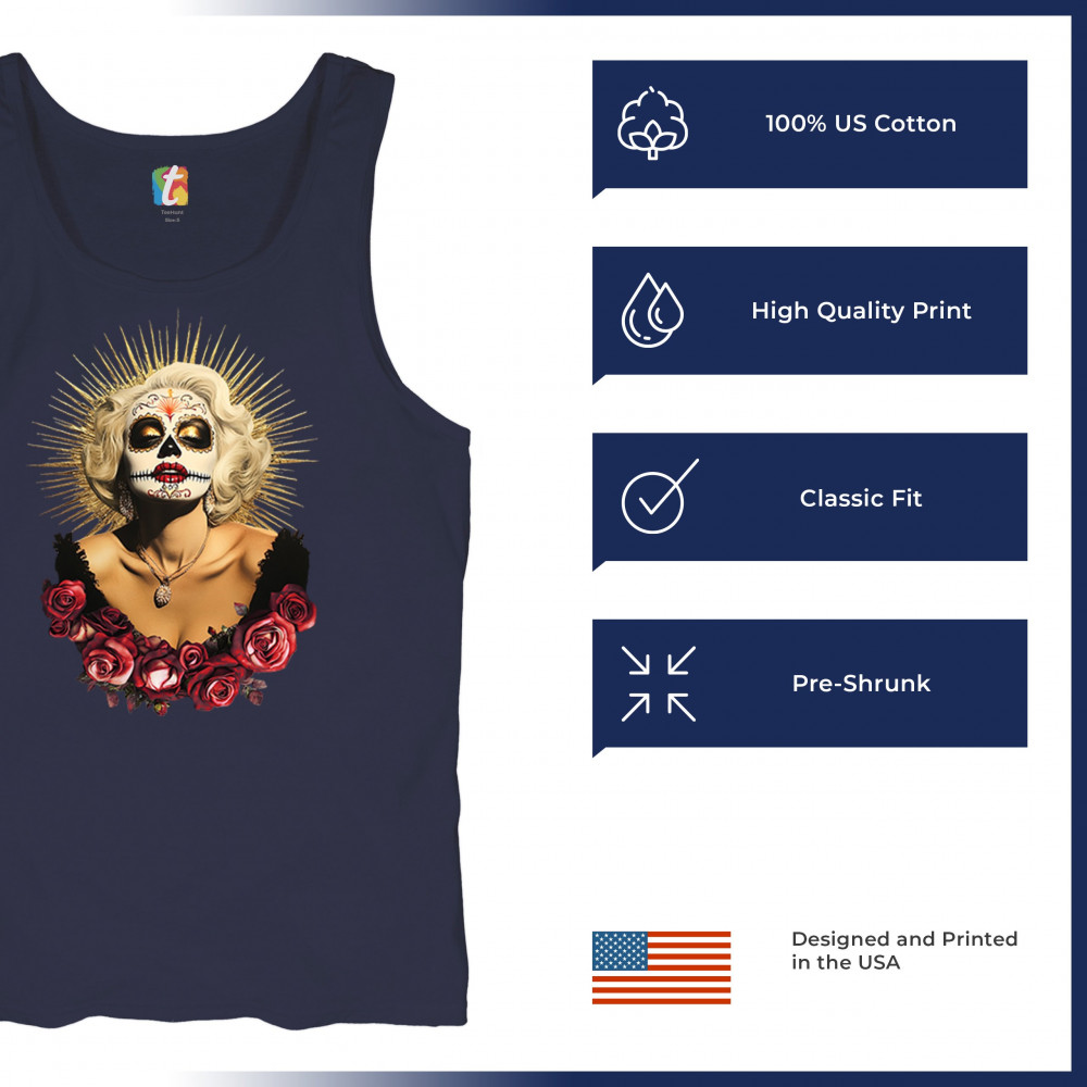 This bold and beautiful sugar skull design features a glamorous calavera woman crowned in a golden halo and framed by roses. A divine tribute to Dia de los Muertos, this look blends vintage glam, Latin culture, makeup artistry, and sacred symbolism. Perfect for fans of gothic beauty, Halloween, and heritage expression.