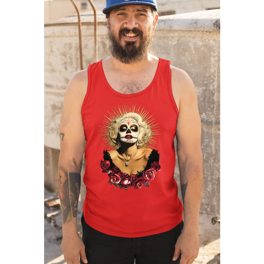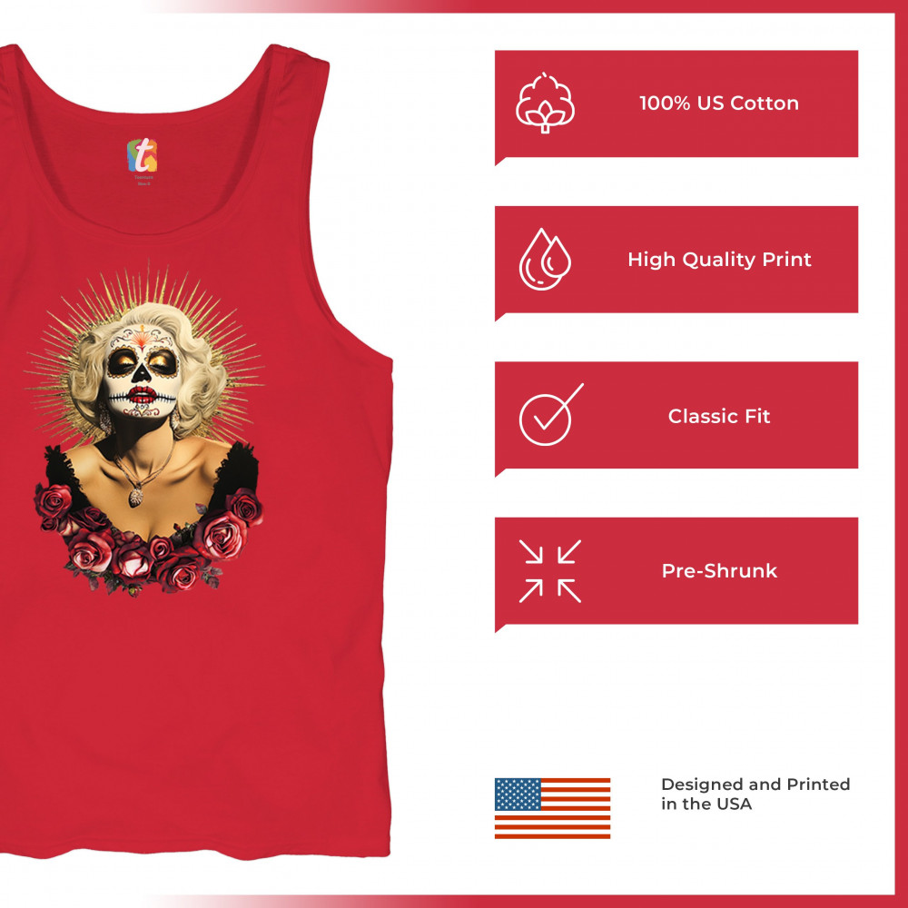 This bold and beautiful sugar skull design features a glamorous calavera woman crowned in a golden halo and framed by roses. A divine tribute to Dia de los Muertos, this look blends vintage glam, Latin culture, makeup artistry, and sacred symbolism. Perfect for fans of gothic beauty, Halloween, and heritage expression.