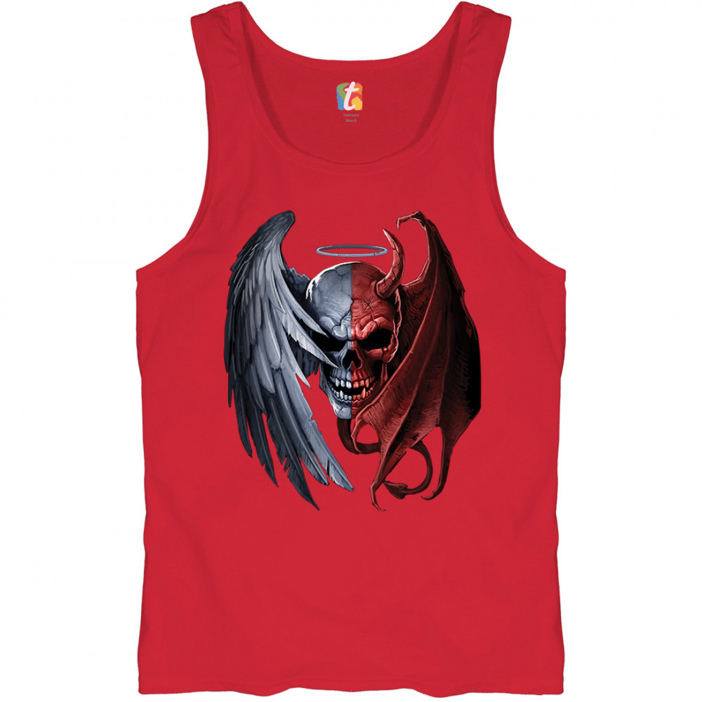 A print featuring a skull face, one half of which is light and has an angel's wing covering it and the other is dark with a horn sticking out of the forehead and a demon's wing. Below the skull you can see a demon's tail and a halo above it. A great