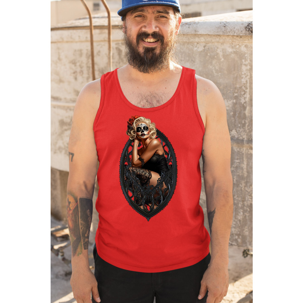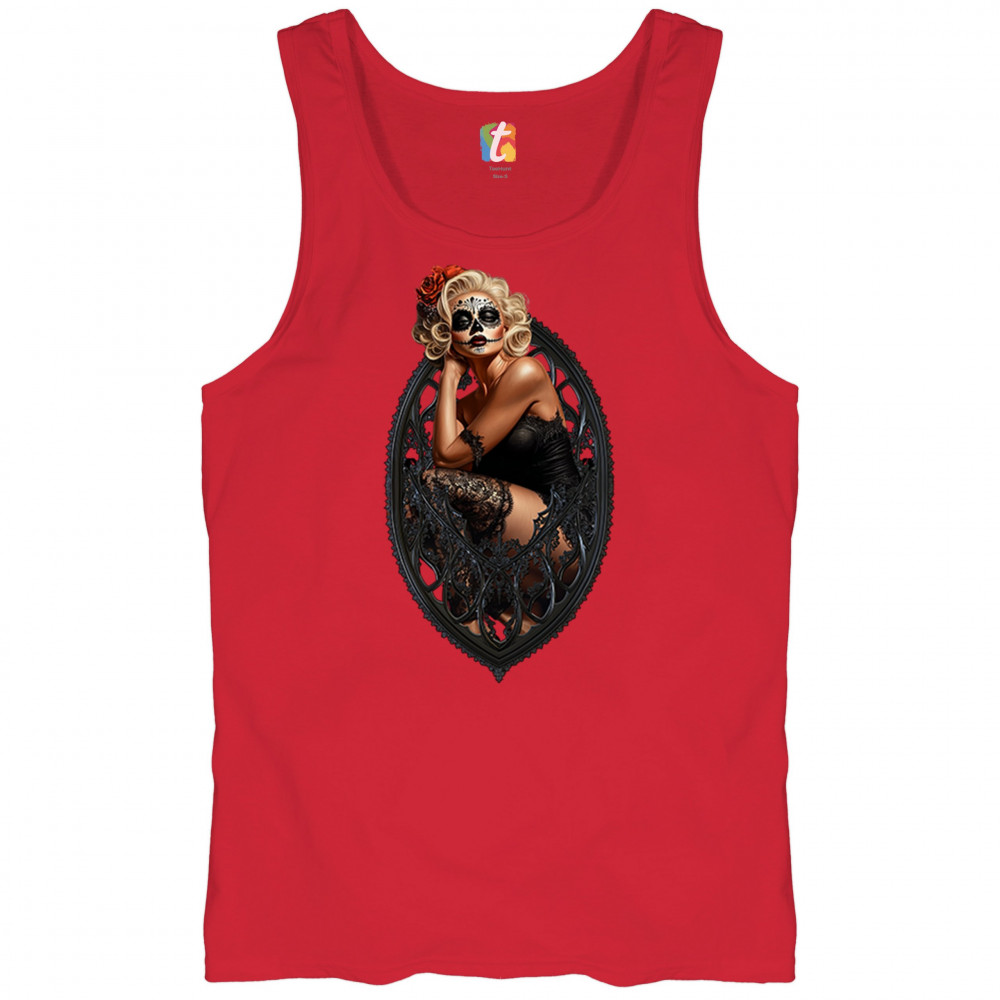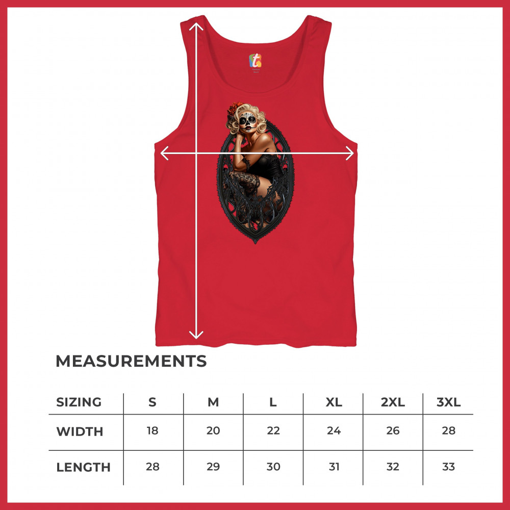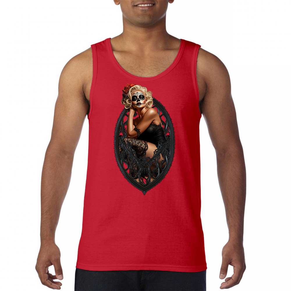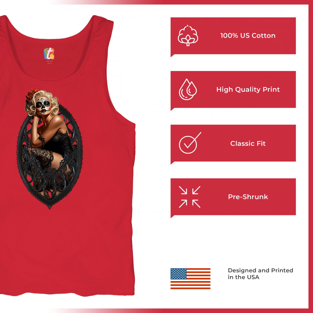 This sultry sugar skull pinup design blends gothic lace, seductive pose, and ornate frame detail for a bold Day of the Dead tribute. With striking makeup and vintage lingerie styling, it’s perfect for fans of macabre fashion, calavera art, and dark romance. A hauntingly beautiful mix of allure, attitude, and Dia de los Muertos charm.
