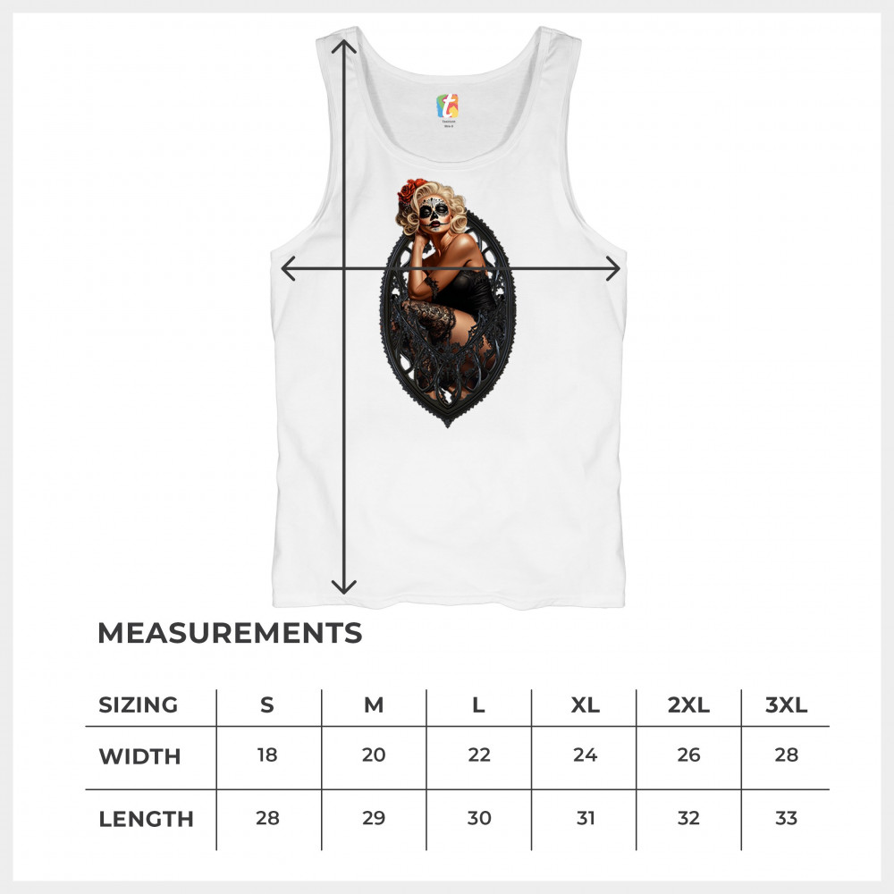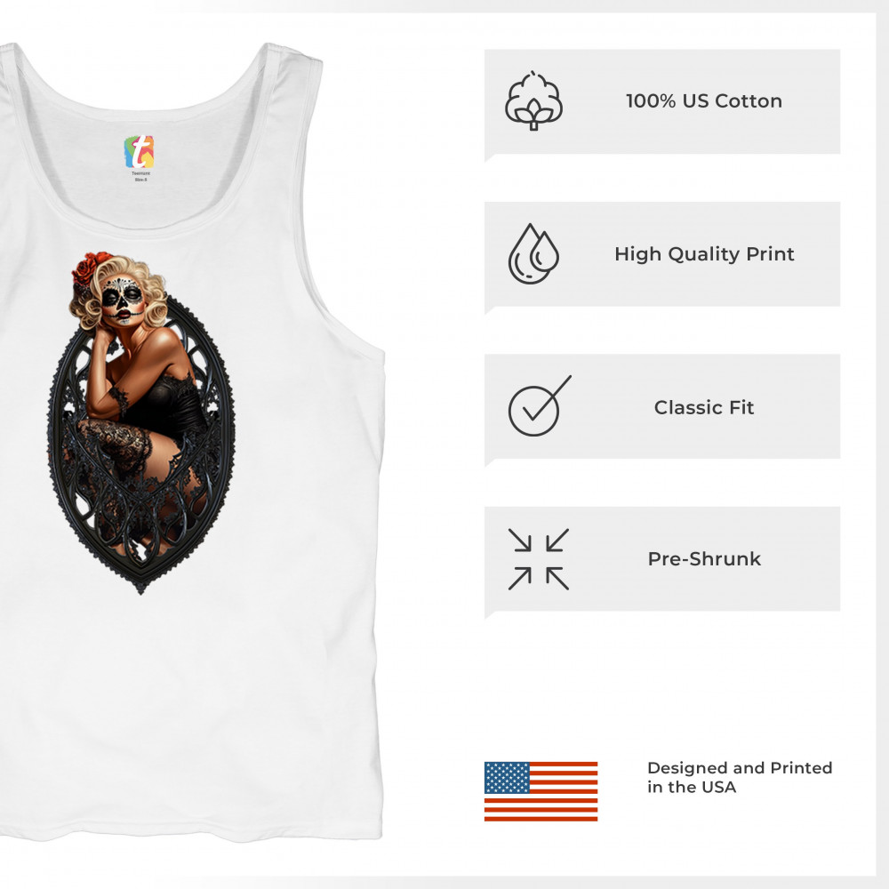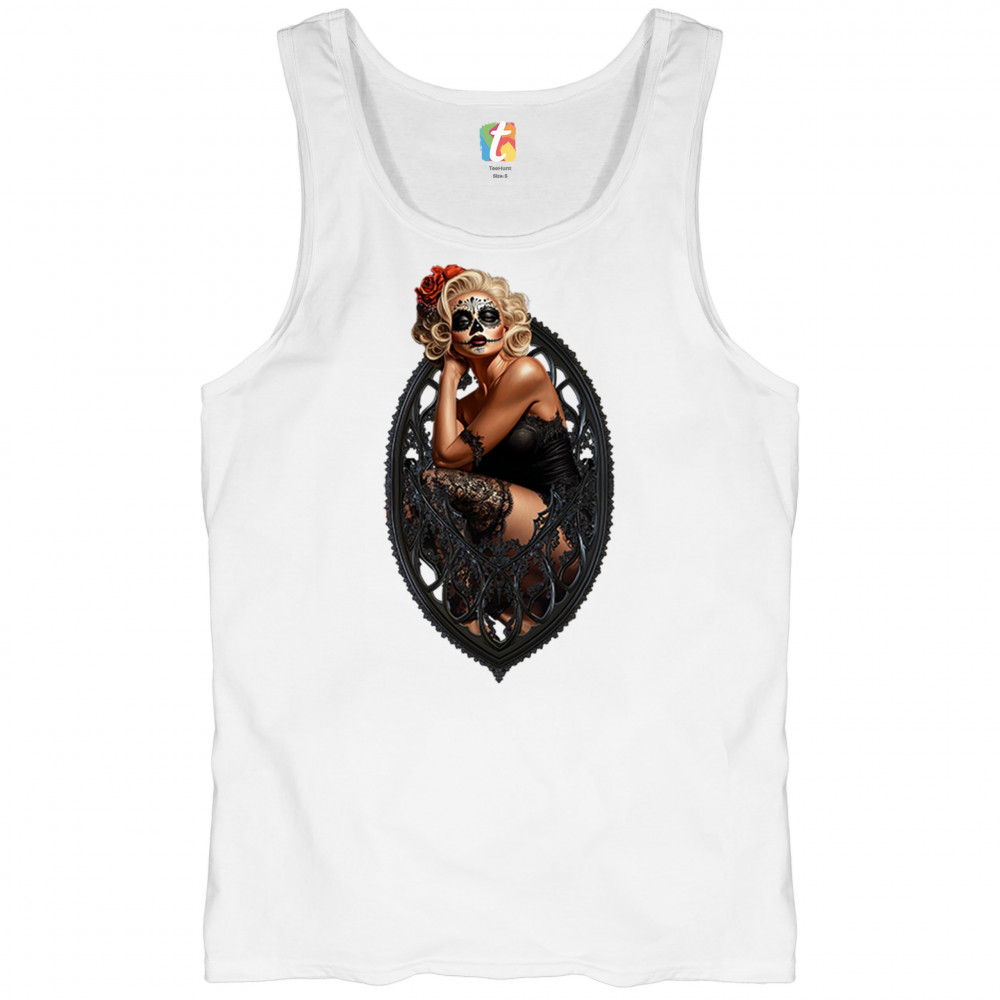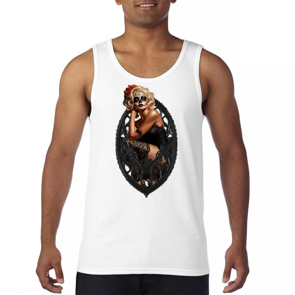 This sultry sugar skull pinup design blends gothic lace, seductive pose, and ornate frame detail for a bold Day of the Dead tribute. With striking makeup and vintage lingerie styling, it’s perfect for fans of macabre fashion, calavera art, and dark romance. A hauntingly beautiful mix of allure, attitude, and Dia de los Muertos charm.