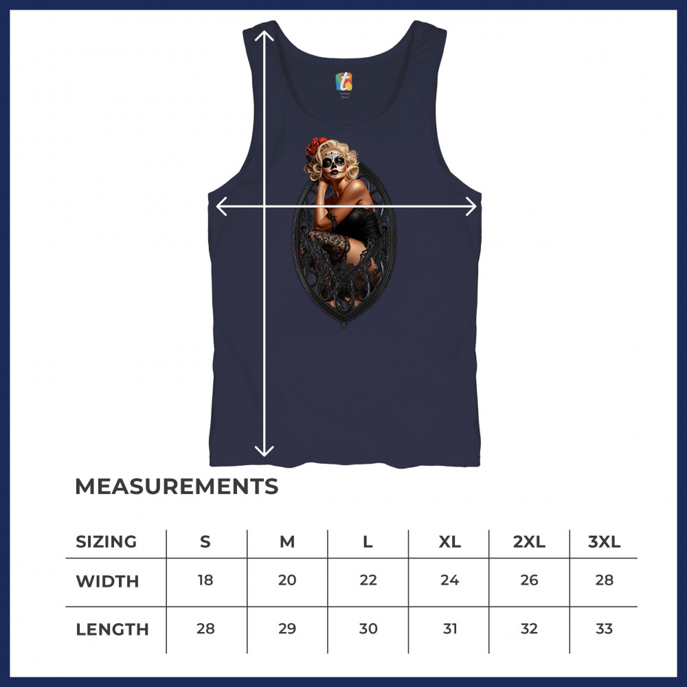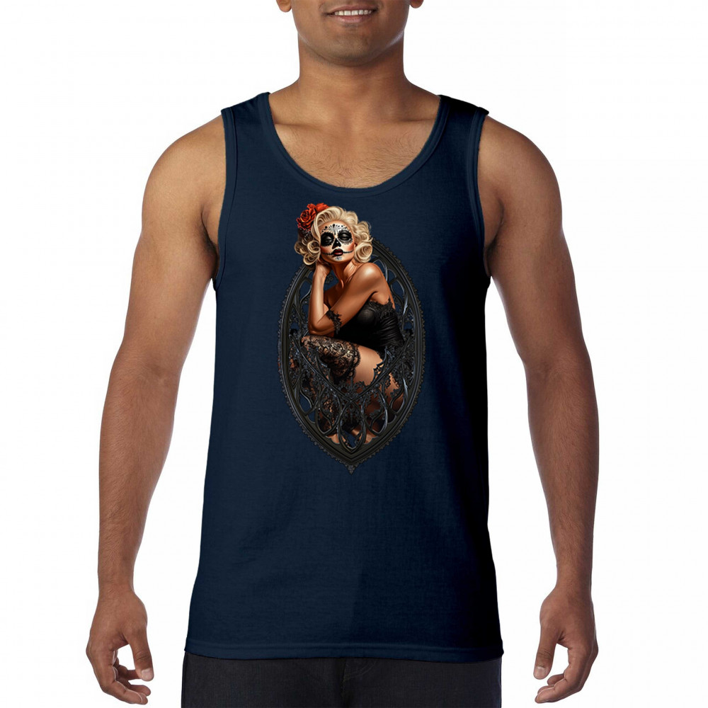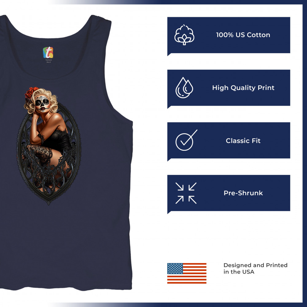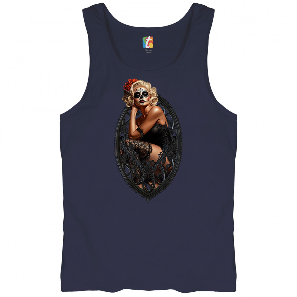 This sultry sugar skull pinup design blends gothic lace, seductive pose, and ornate frame detail for a bold Day of the Dead tribute. With striking makeup and vintage lingerie styling, it’s perfect for fans of macabre fashion, calavera art, and dark romance. A hauntingly beautiful mix of allure, attitude, and Dia de los Muertos charm.