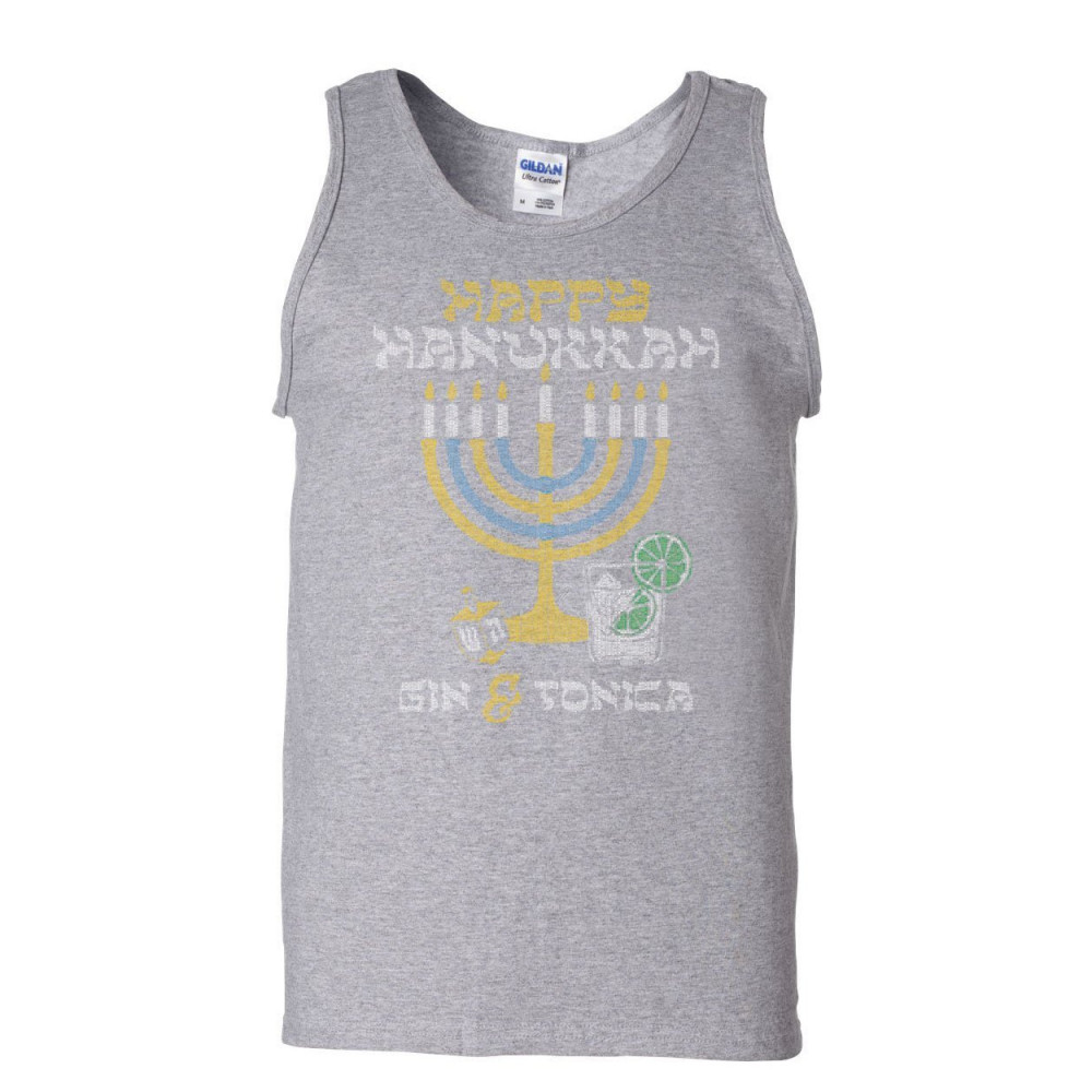 HAPPY HANUKKAH GIN & TONICA happy hanukkah tank top menorah drinking gin & tonica dreidel sleeveless gray