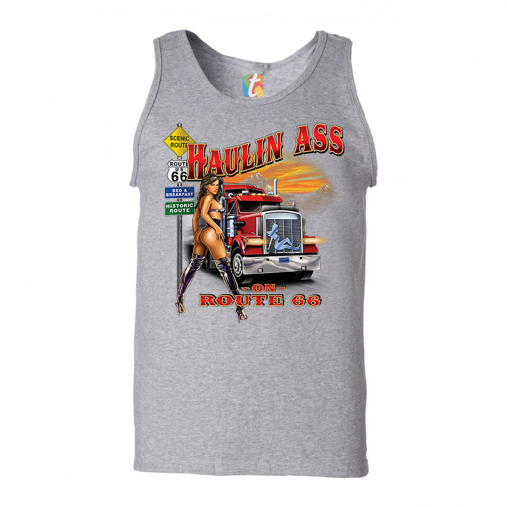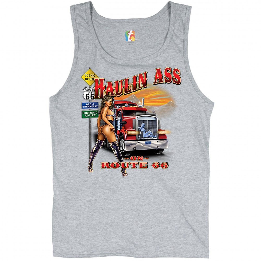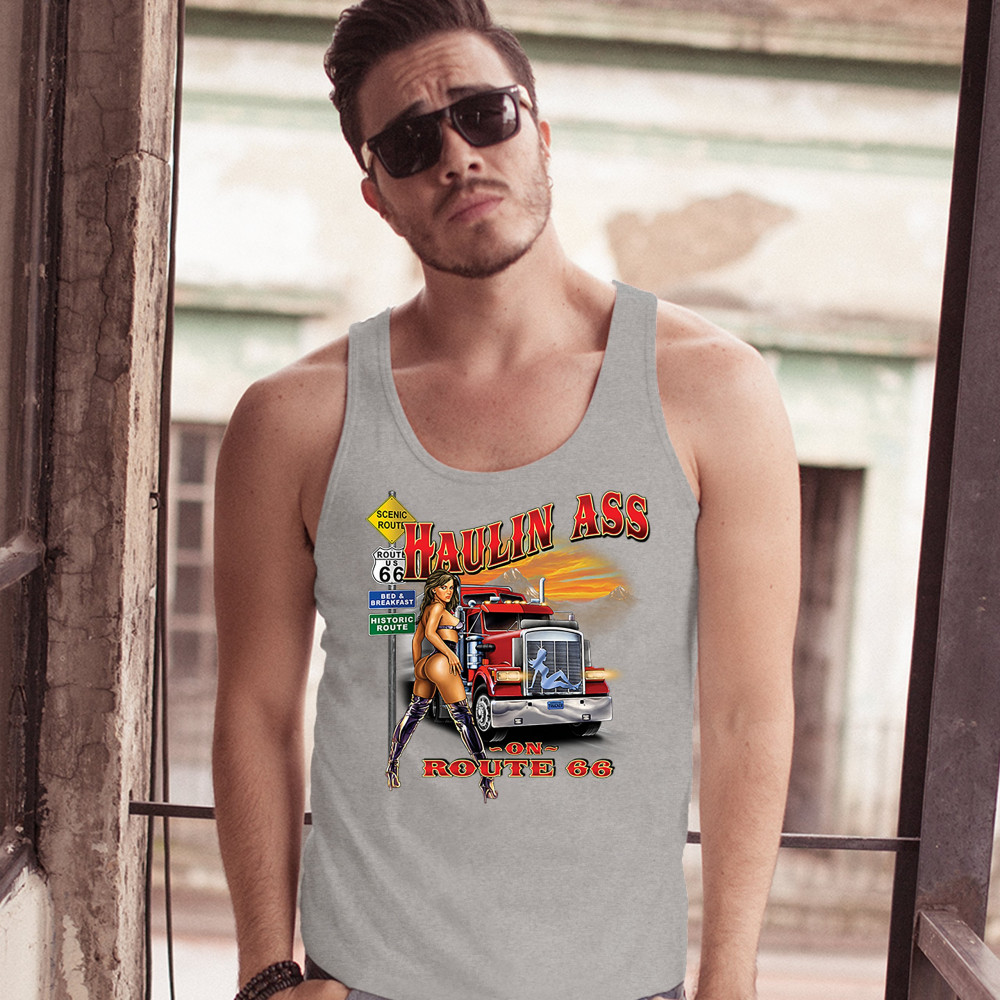 A print featuring a scantily-clad brunette woman standing by a Route 66 sign. A classic truck is passing by and the print says: "Haulin Ass on Route 66". A great choice for anyone who appreciates beautiful women and is a fan of the legendary Mother Road.