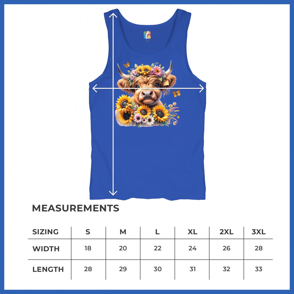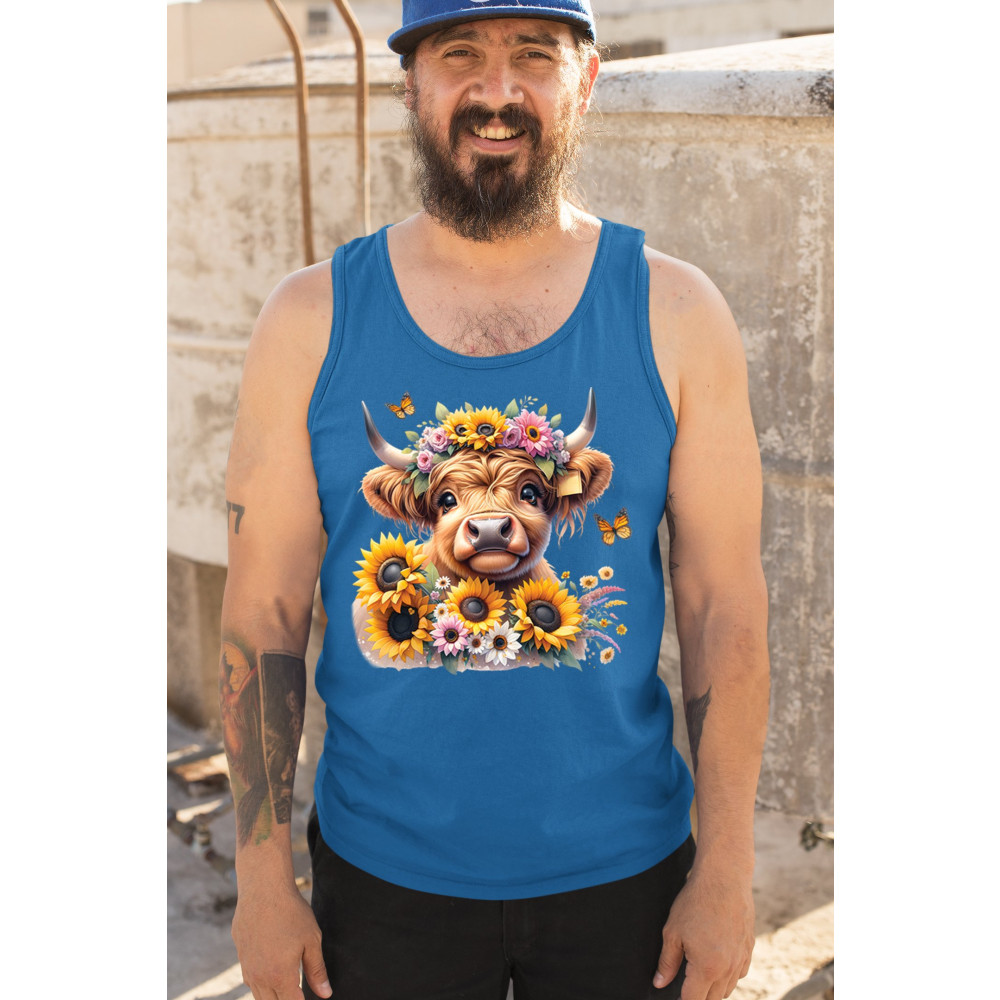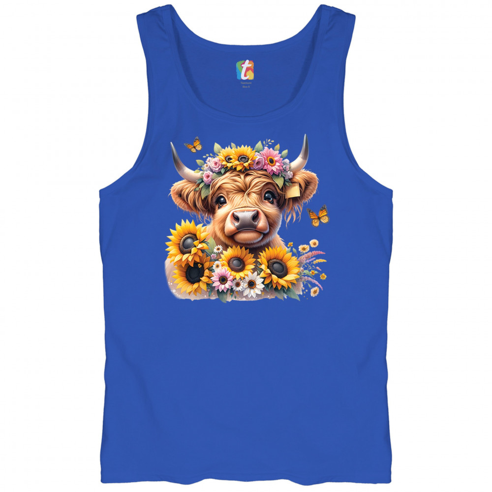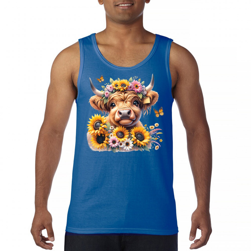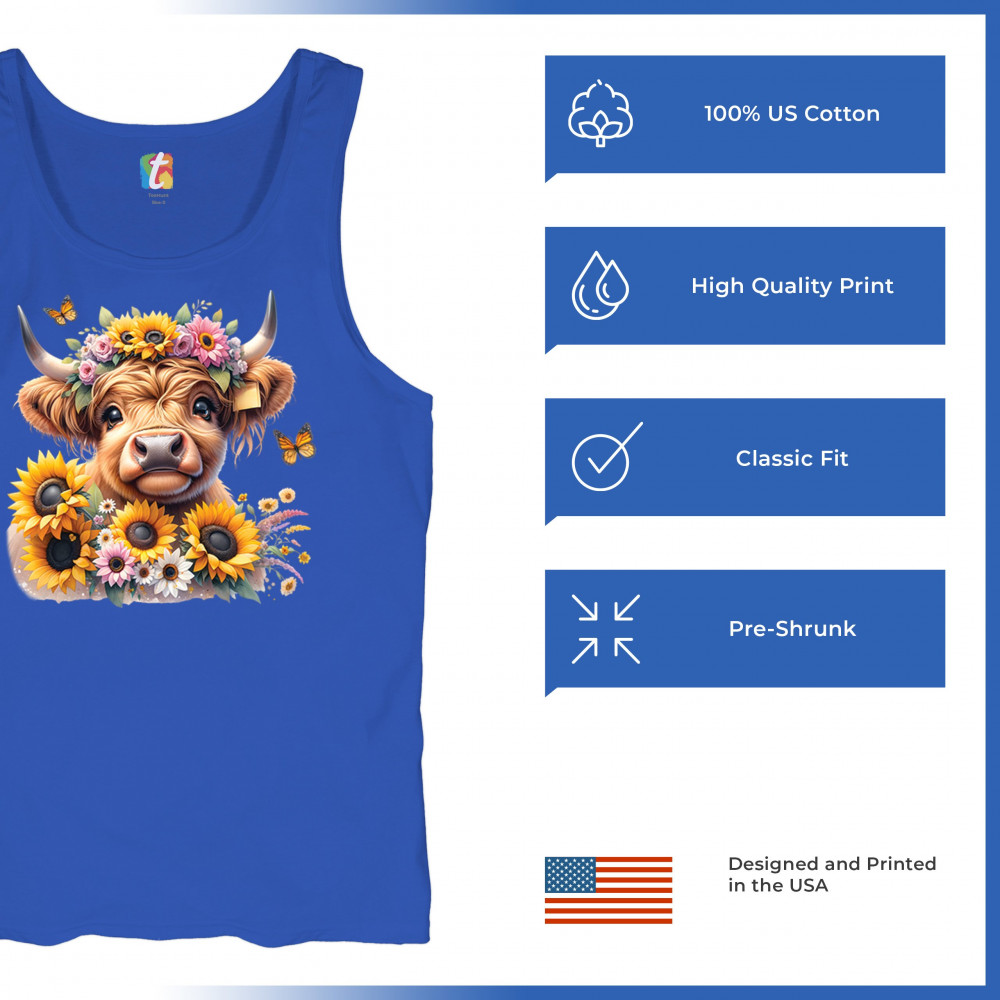 Highland Cow floral design with sunflowers and daisies, rustic farmhouse cow style, western ranch boho charm, and cozy country farmhouse shirt vibes.