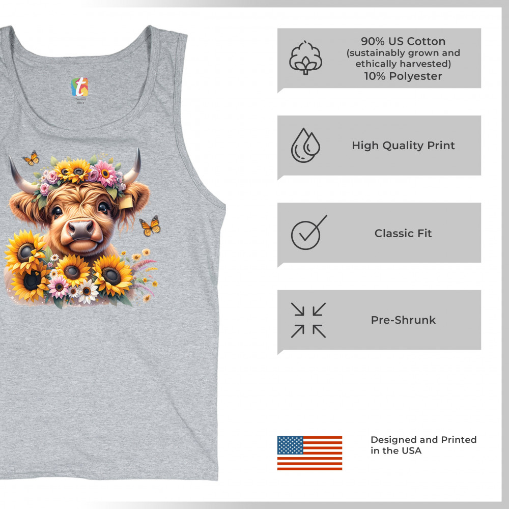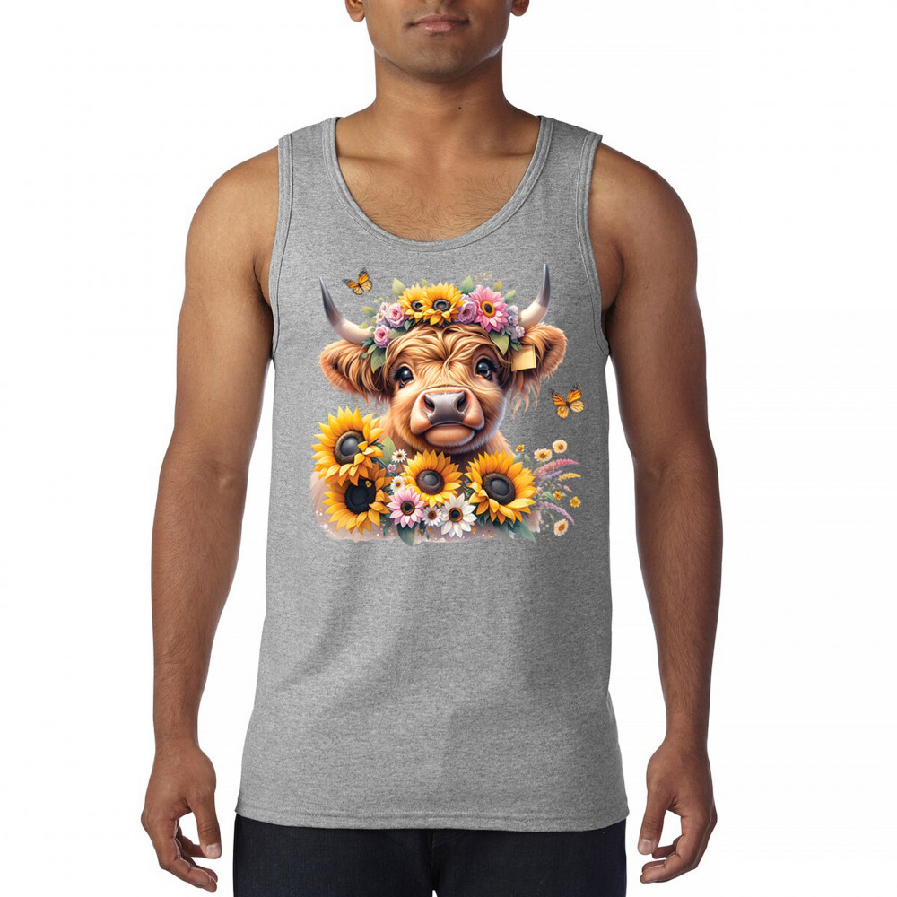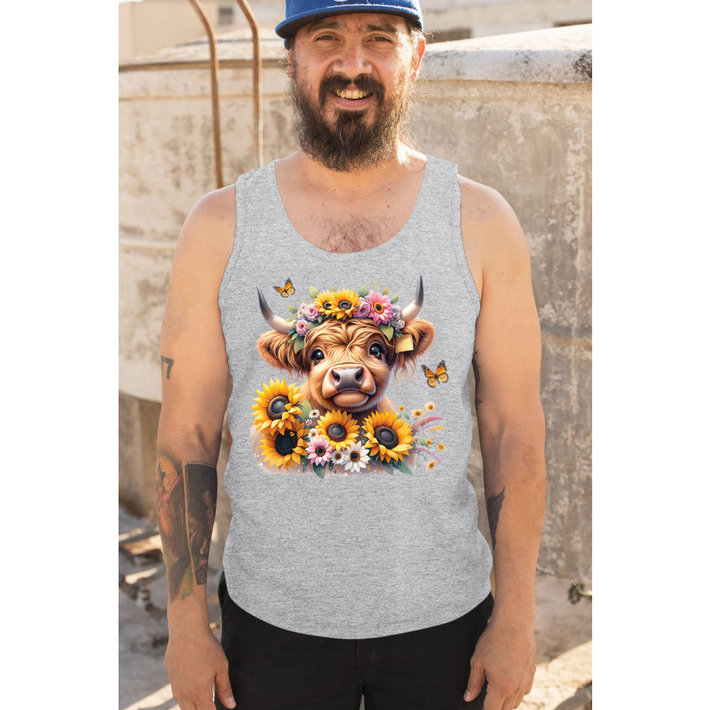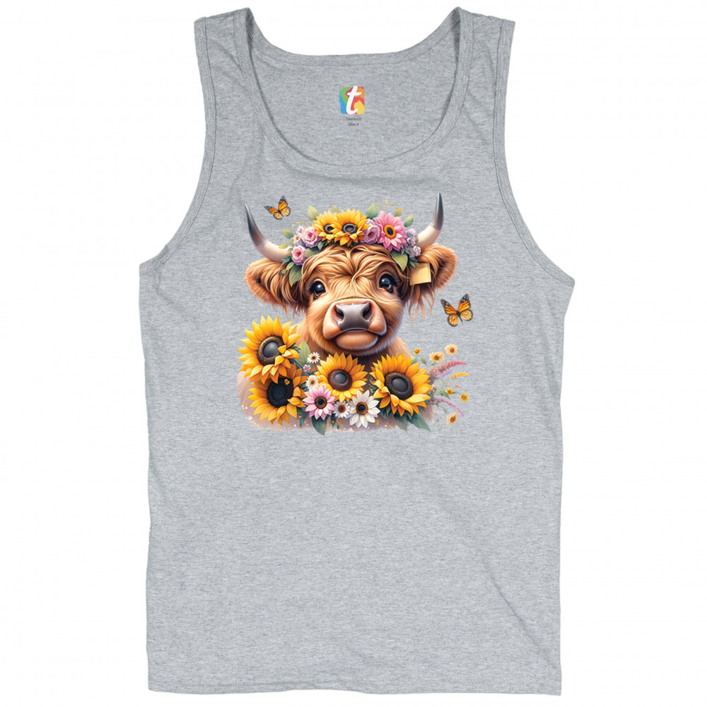 Highland Cow floral design with sunflowers and daisies, rustic farmhouse cow style, western ranch boho charm, and cozy country farmhouse shirt vibes.