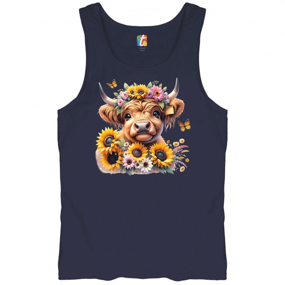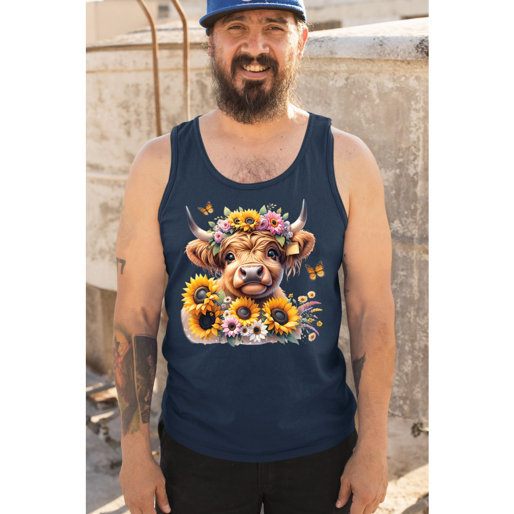 Highland Cow floral design with sunflowers and daisies, rustic farmhouse cow style, western ranch boho charm, and cozy country farmhouse shirt vibes.