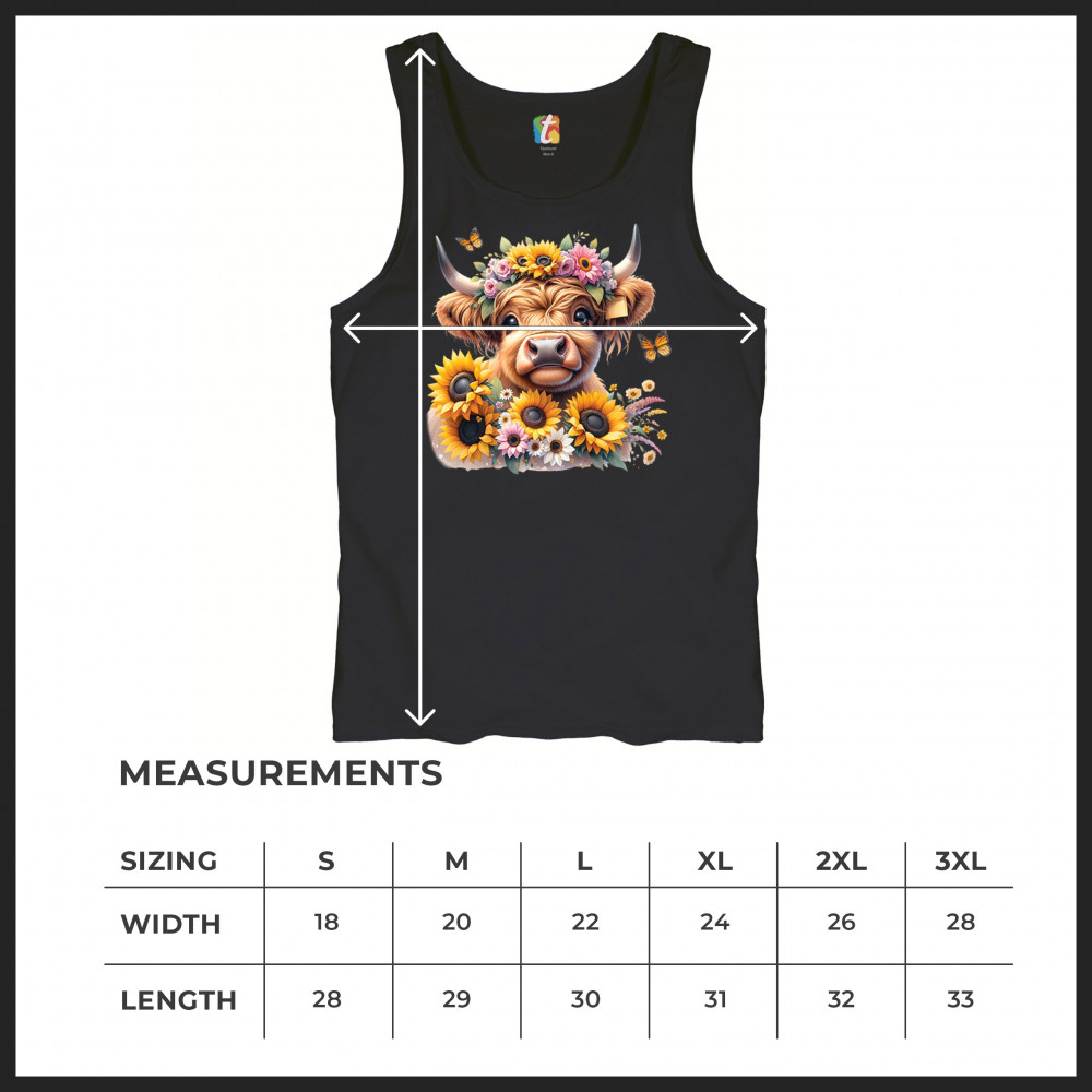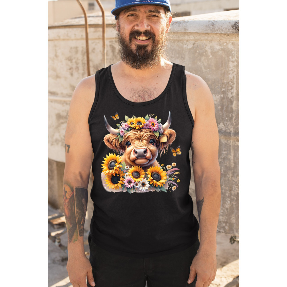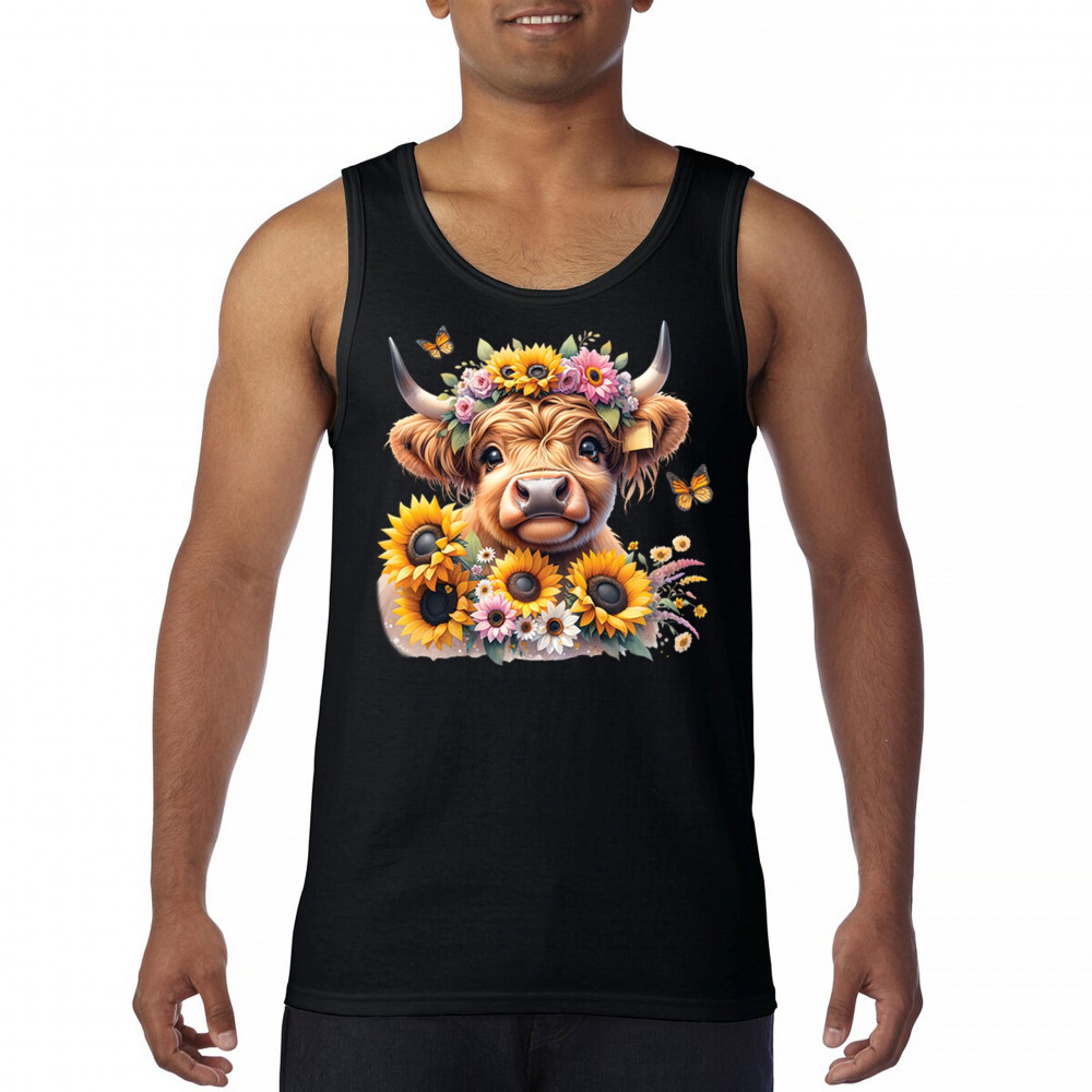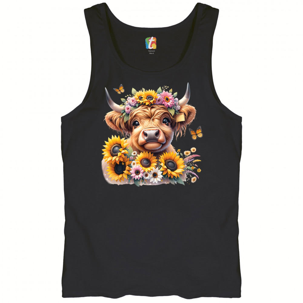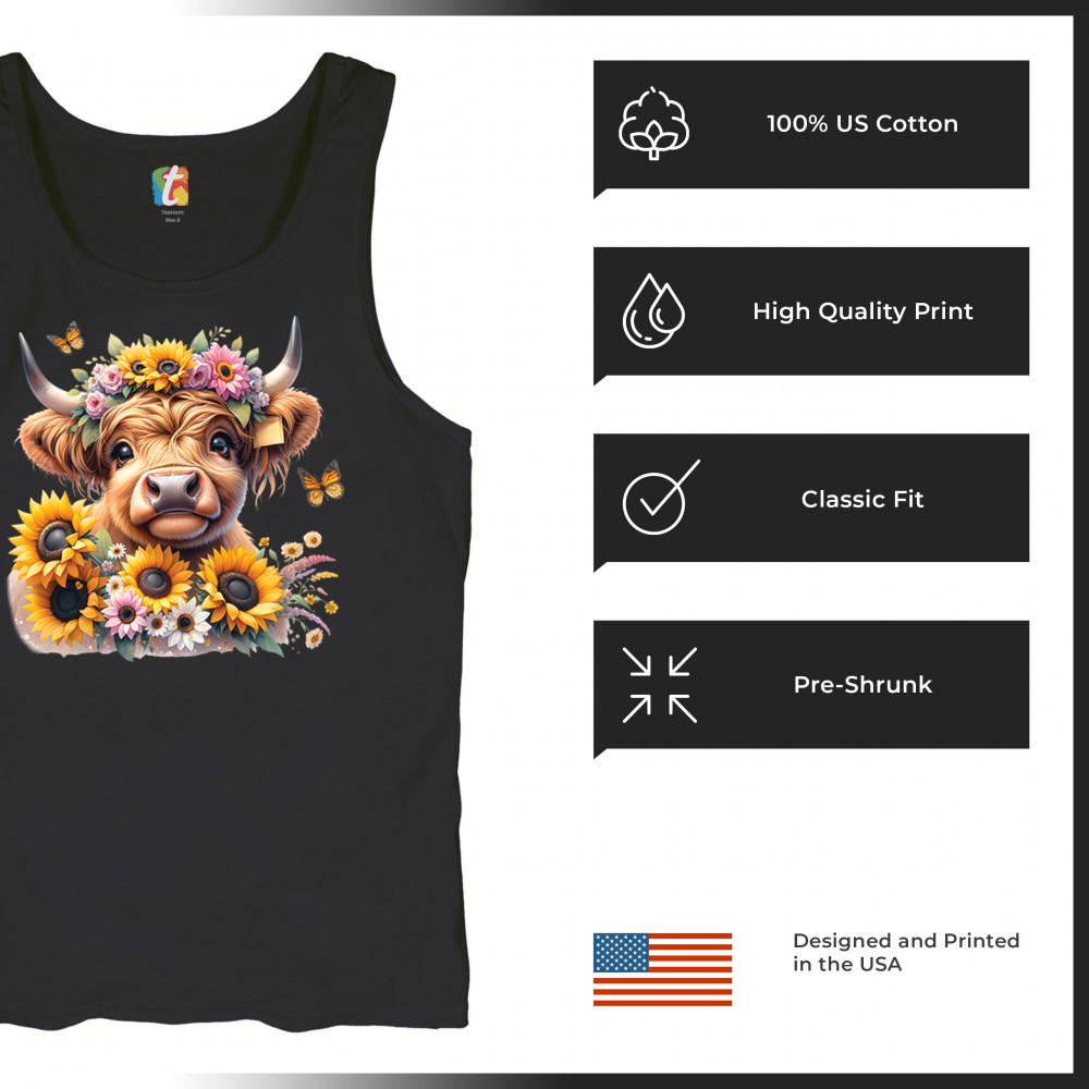 Highland Cow floral design with sunflowers and daisies, rustic farmhouse cow style, western ranch boho charm, and cozy country farmhouse shirt vibes.