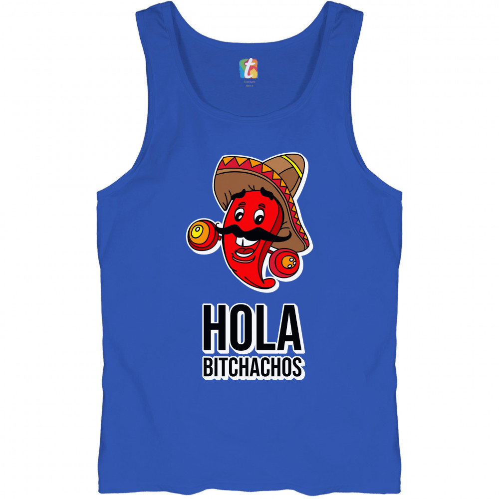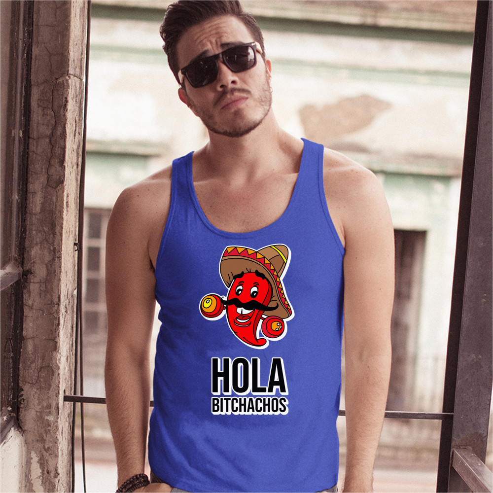 A funny print featuring a smiling red chili pepper with mustaches, wearing a sombrero and holding maracas. Underneath it says: "hola bitchachos". A great choice to give as a gift to your latino friends or family members to celebrate Cinco de Mayo.