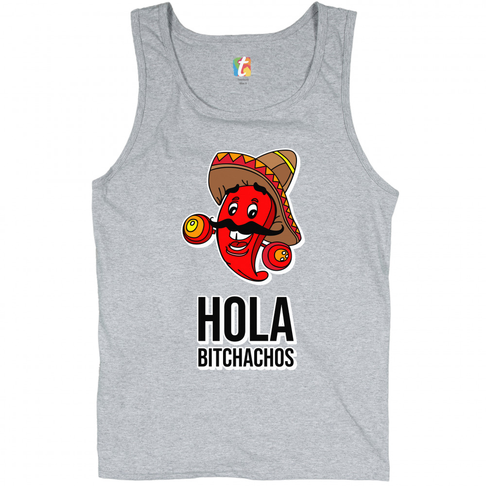 A funny print featuring a smiling red chili pepper with mustaches, wearing a sombrero and holding maracas. Underneath it says: "hola bitchachos". A great choice to give as a gift to your latino friends or family members to celebrate Cinco de Mayo.