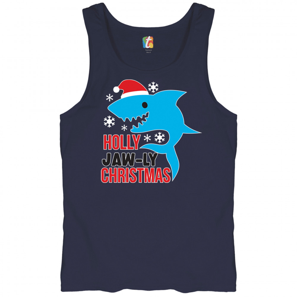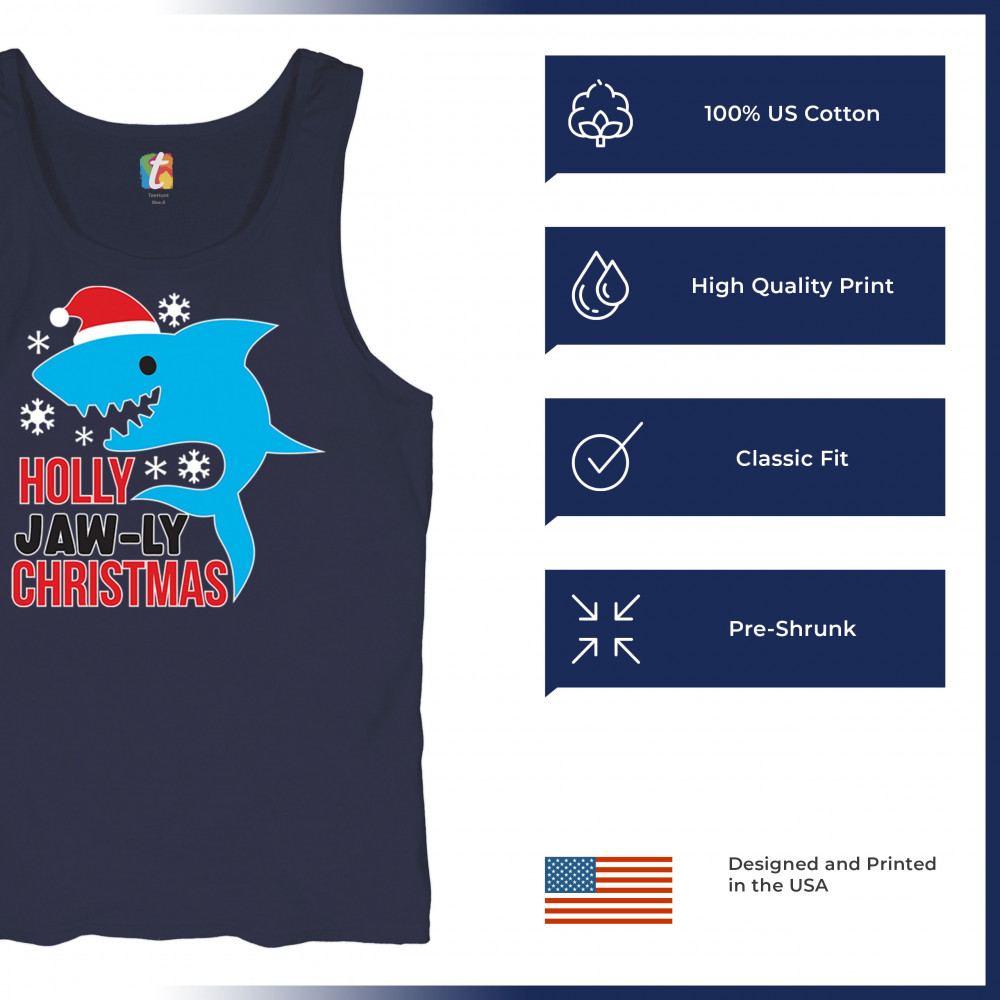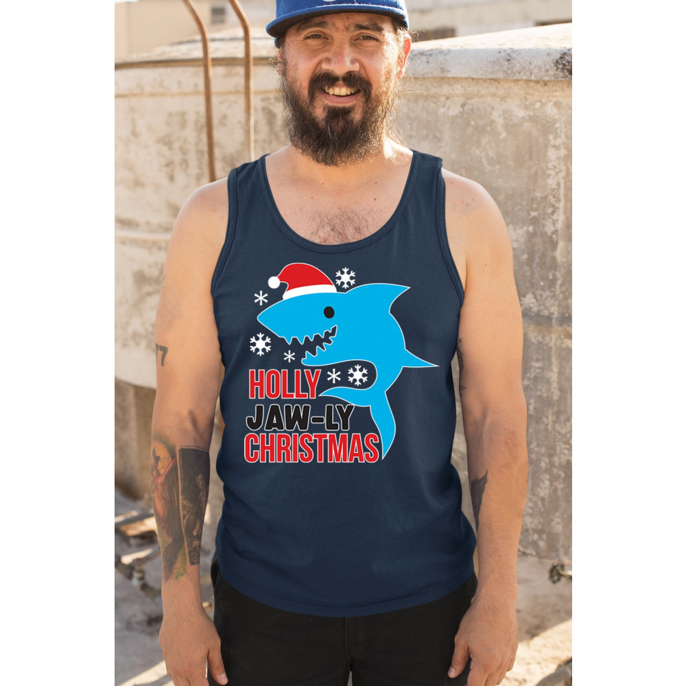 Funny Holly Jaw-ly Christmas shark pun design with Santa hat and snowflakes. Perfect for ocean lovers, festive parties, and cheerful holiday fun.