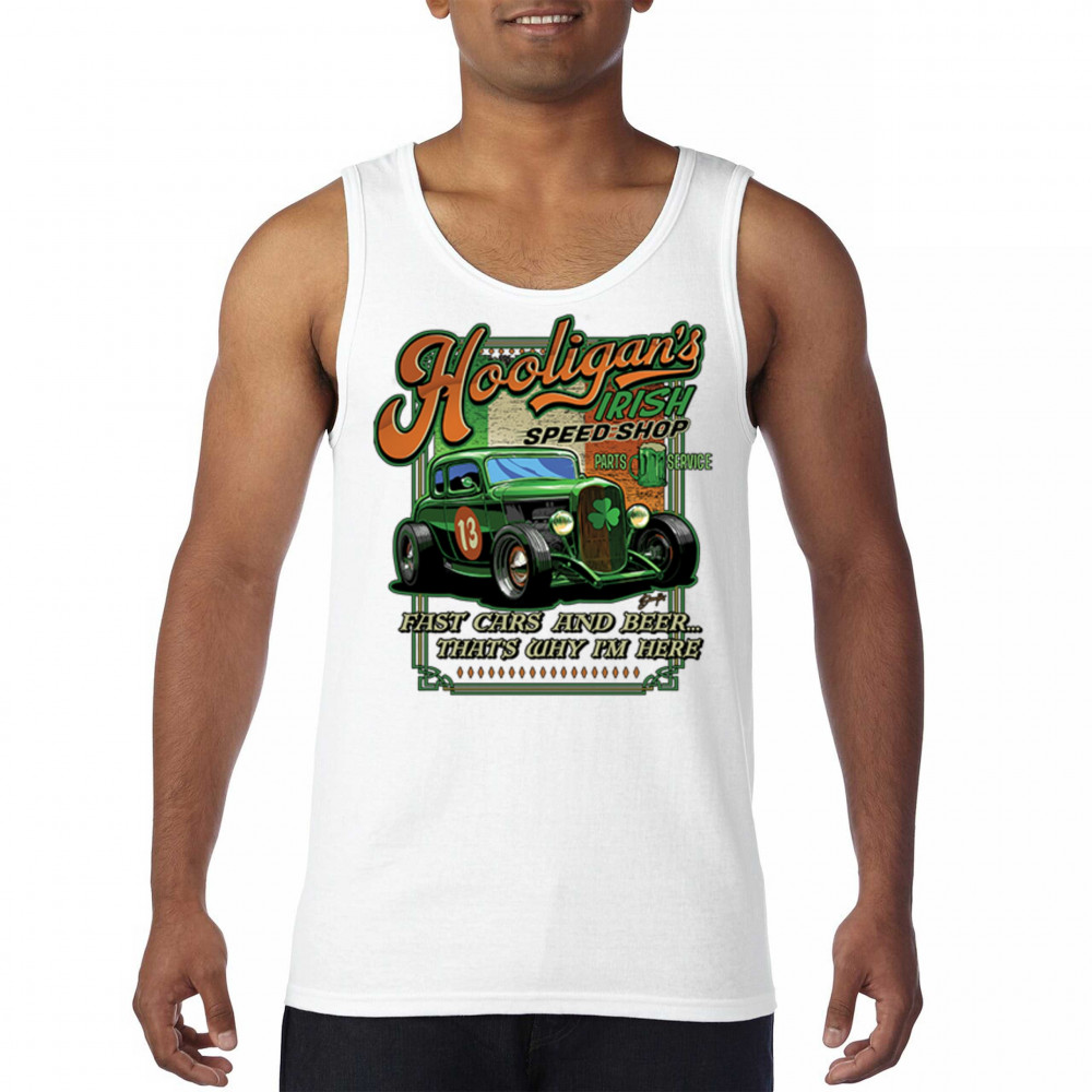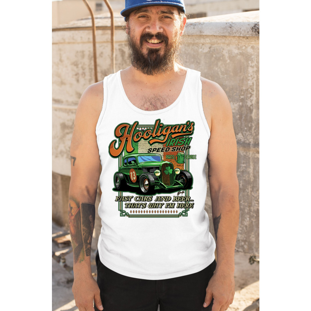 HOOLIGAN'S IRISH SPEED SHOP hooligans irish speed shop st patricks day tank top hot rod shamrock men's top white