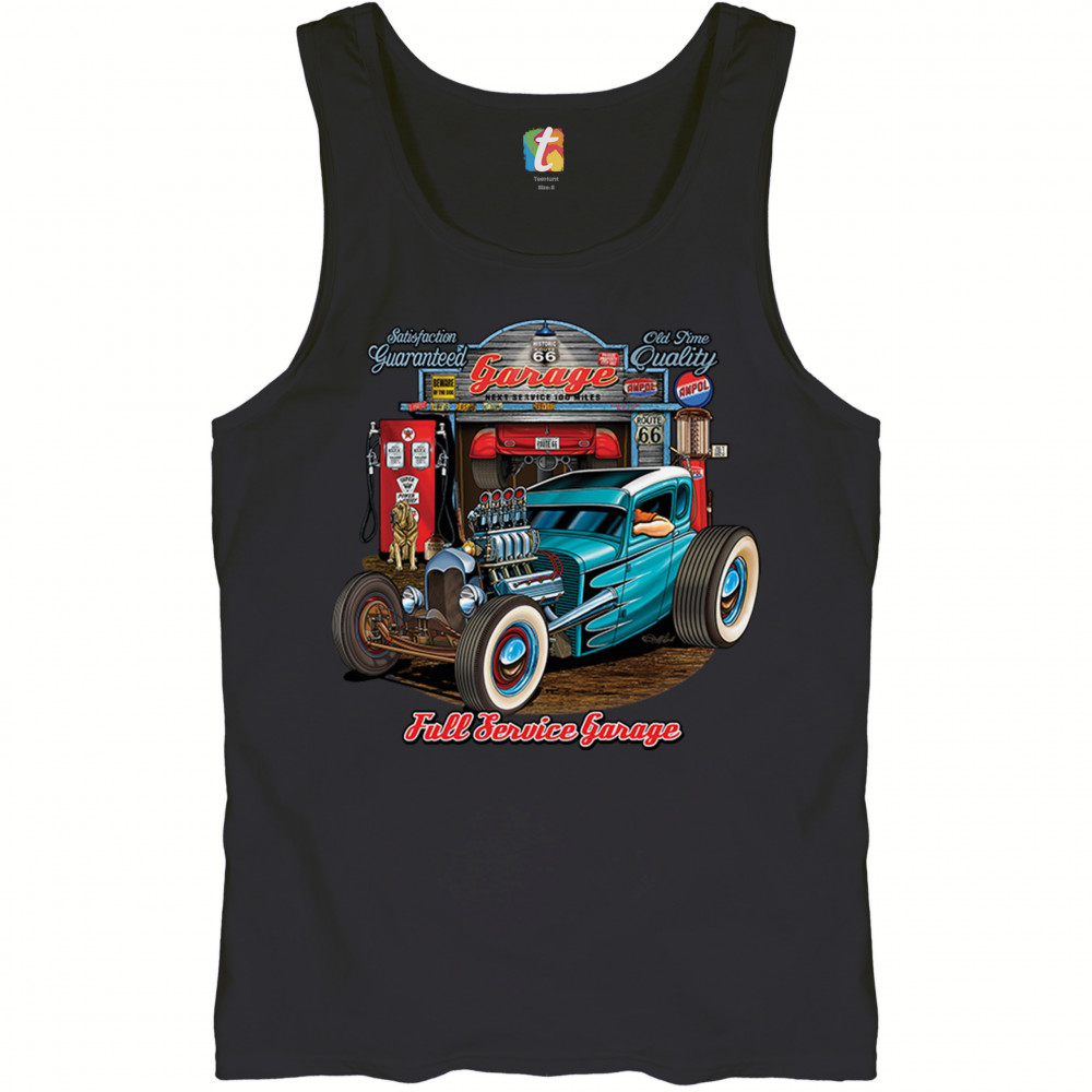 A print featuring a beautiful blue hot rod and a garage behind it. The garage has numerous signs on it which says :"Satisfaction guaranteed", "Old time quality", "Historic Route 66". Under the car it says: "Full service garage". Great for Route 66 and hot rod fans.