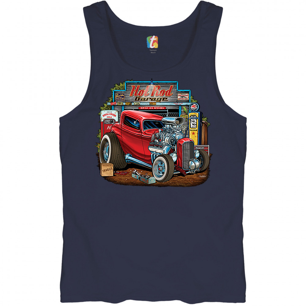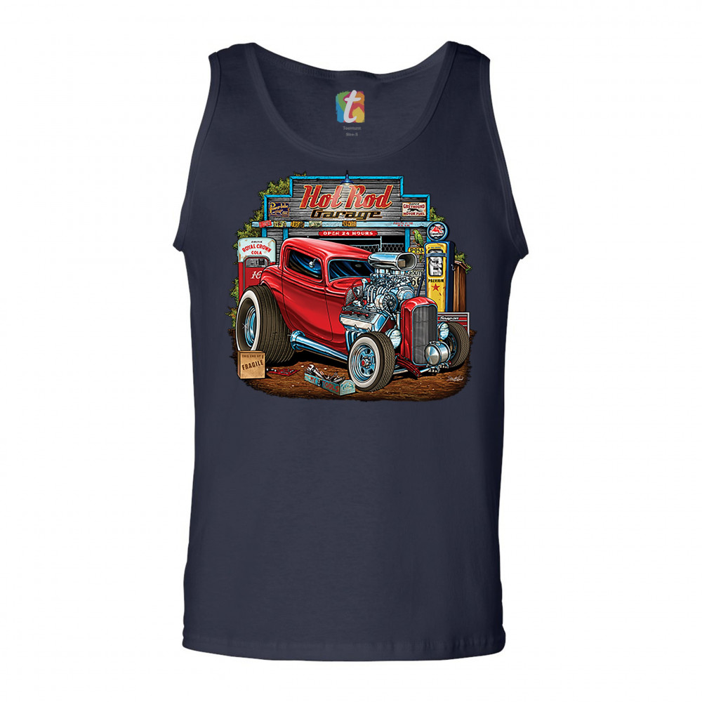 A print featuring a vintage hot rod with an exposed engine and plus-sized rear wheels. In the background there is a garage with a gas station and a sign that says: "Hot Rod Garage". A great choice for a fan of customized American classic cars and hot rods